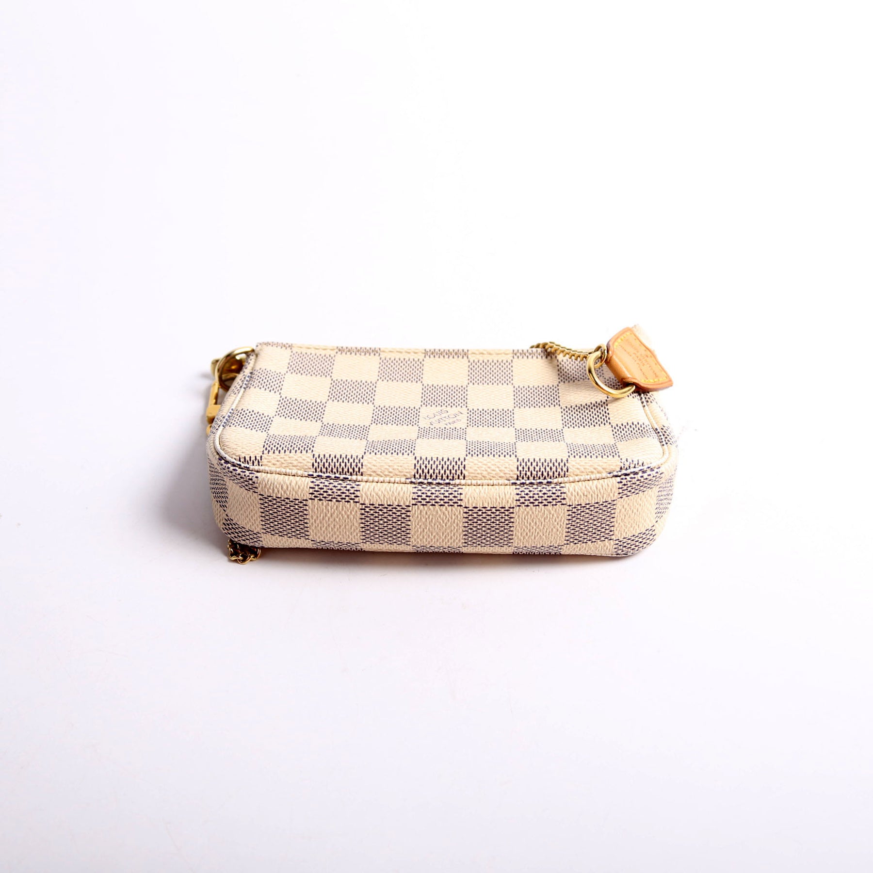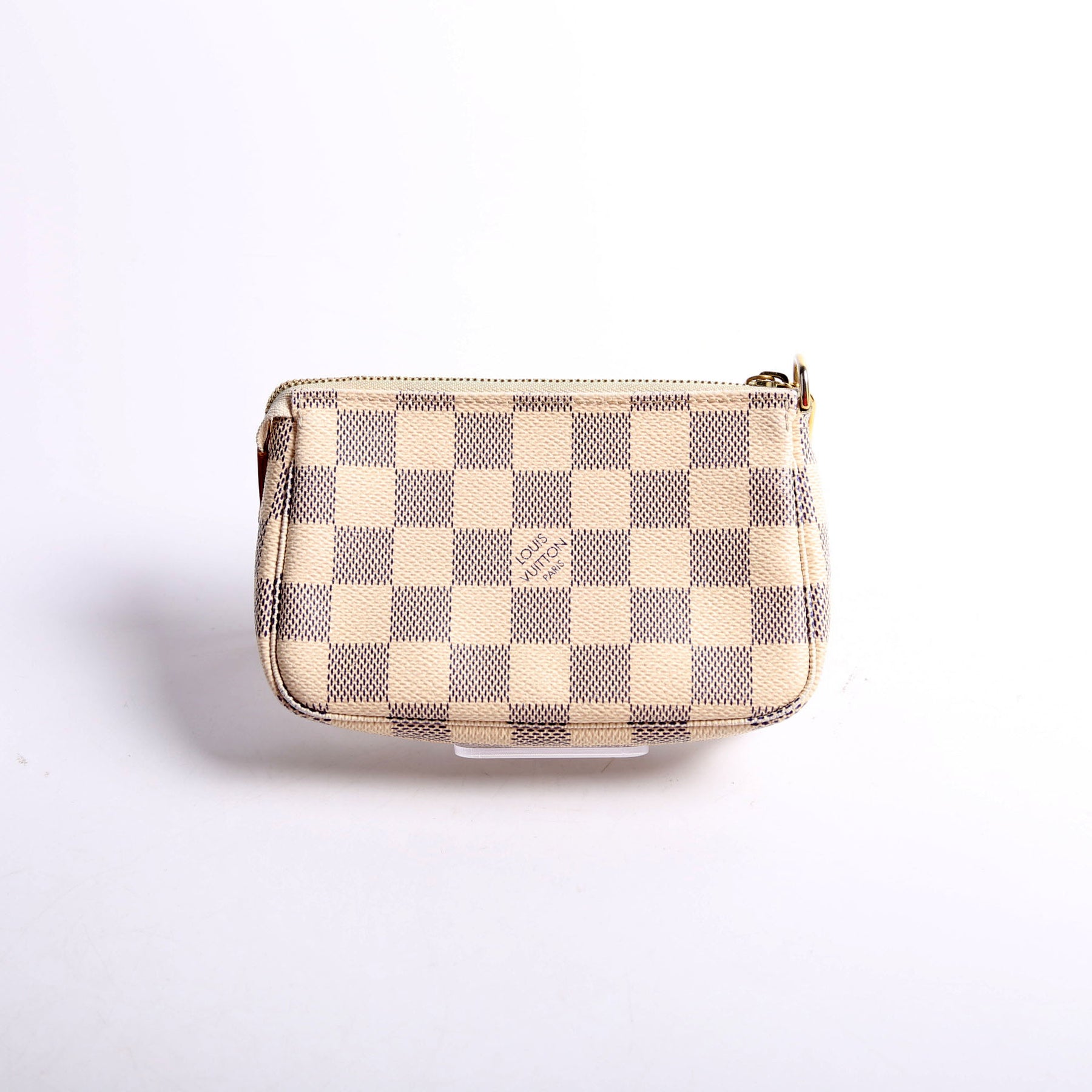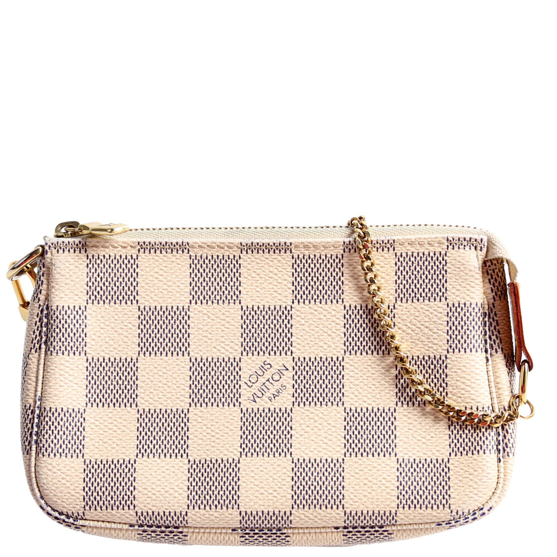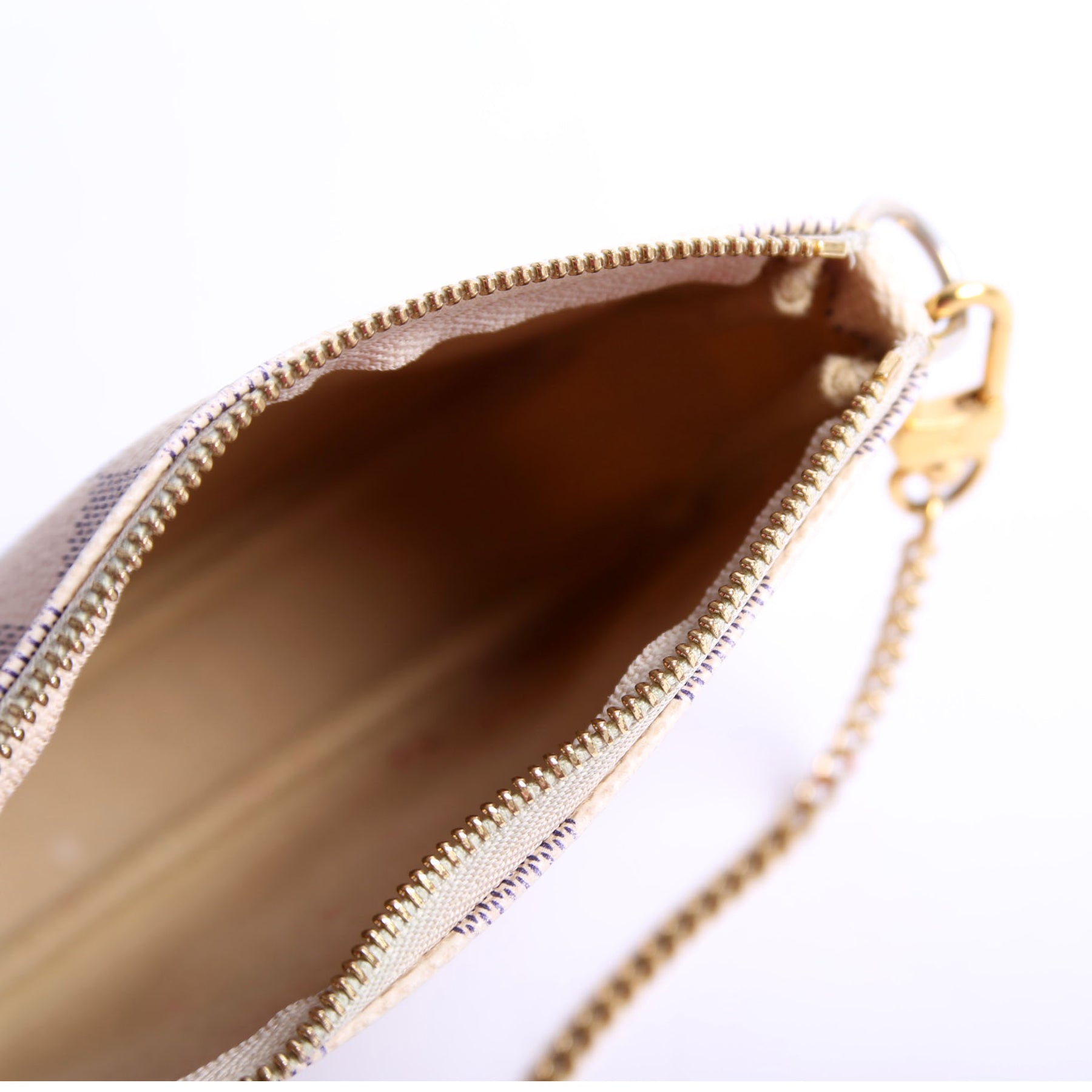 This pre-owned Louis Vuitton Pochette Accessories Mini is guaranteed 100% authentic. The exterior is in the classic Louis Vuitton Damier Azur coated canvas.
