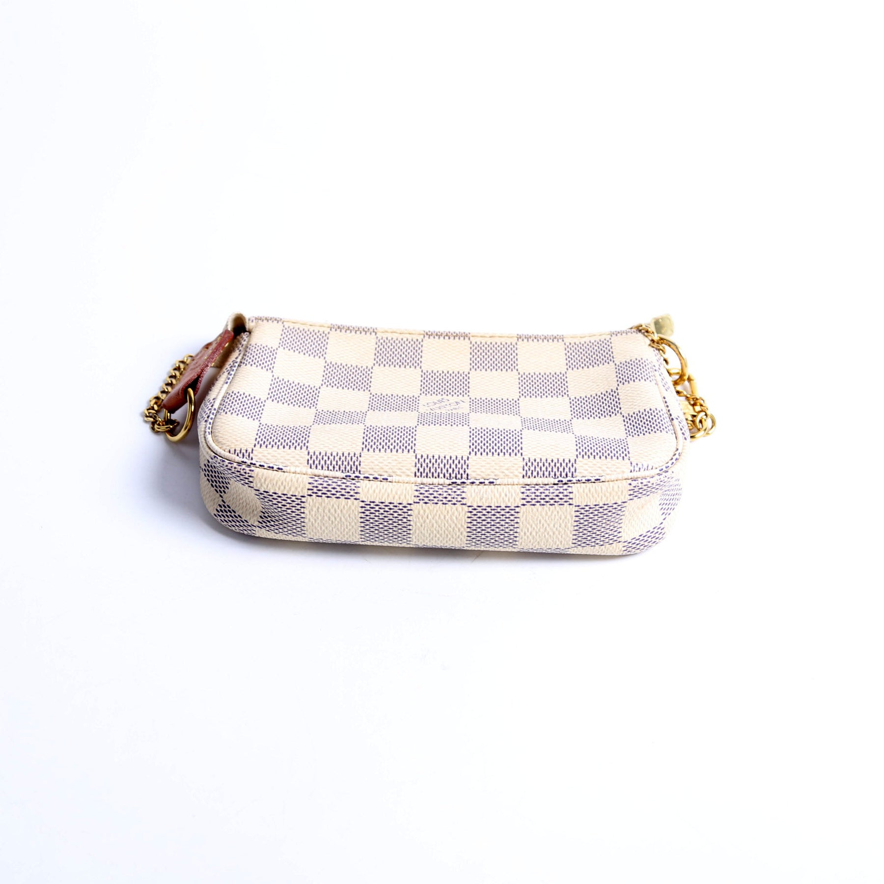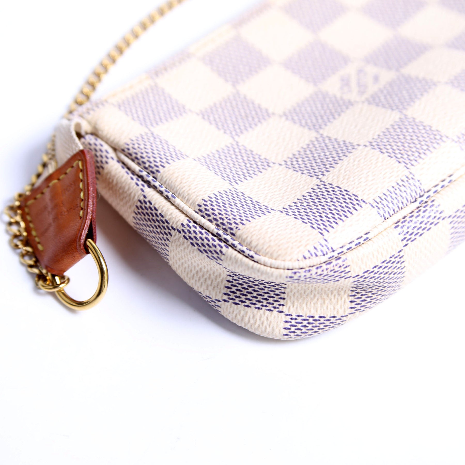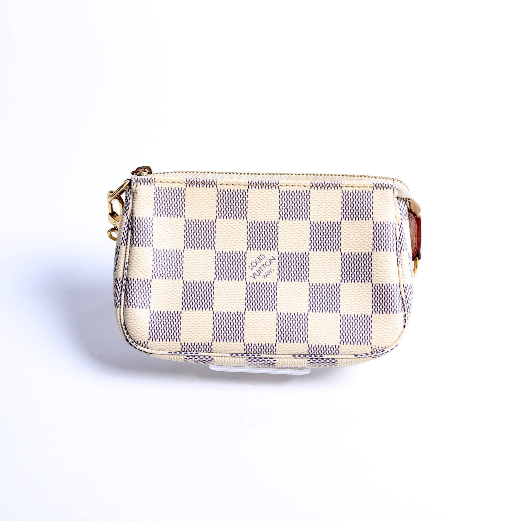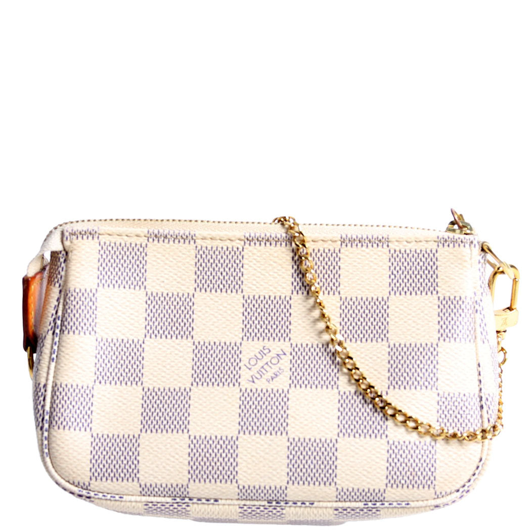 This pre-owned Louis Vuitton Pochette Accessories Mini is guaranteed 100% authentic. The exterior is in the classic Louis Vuitton Damier Azur Coated Canvas.