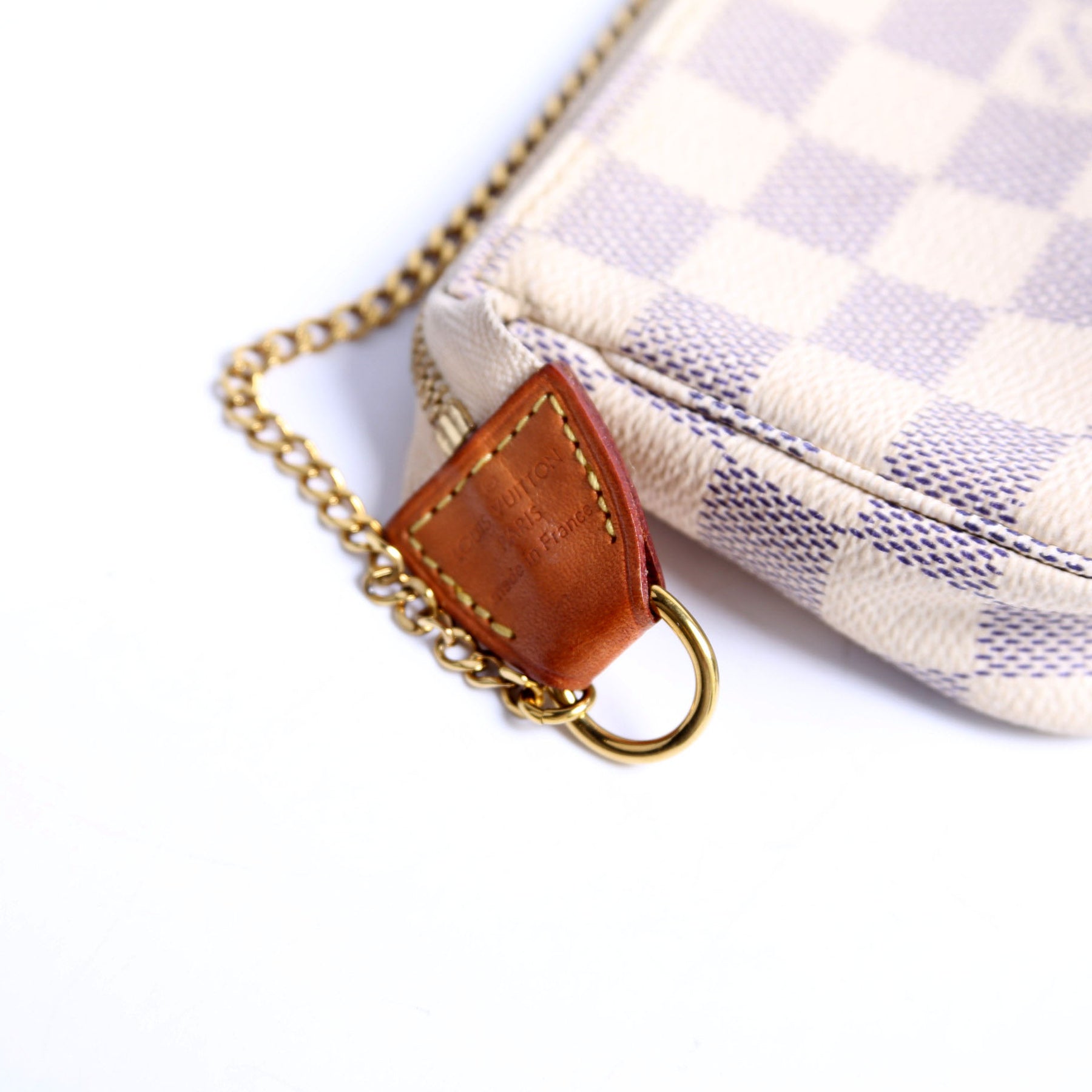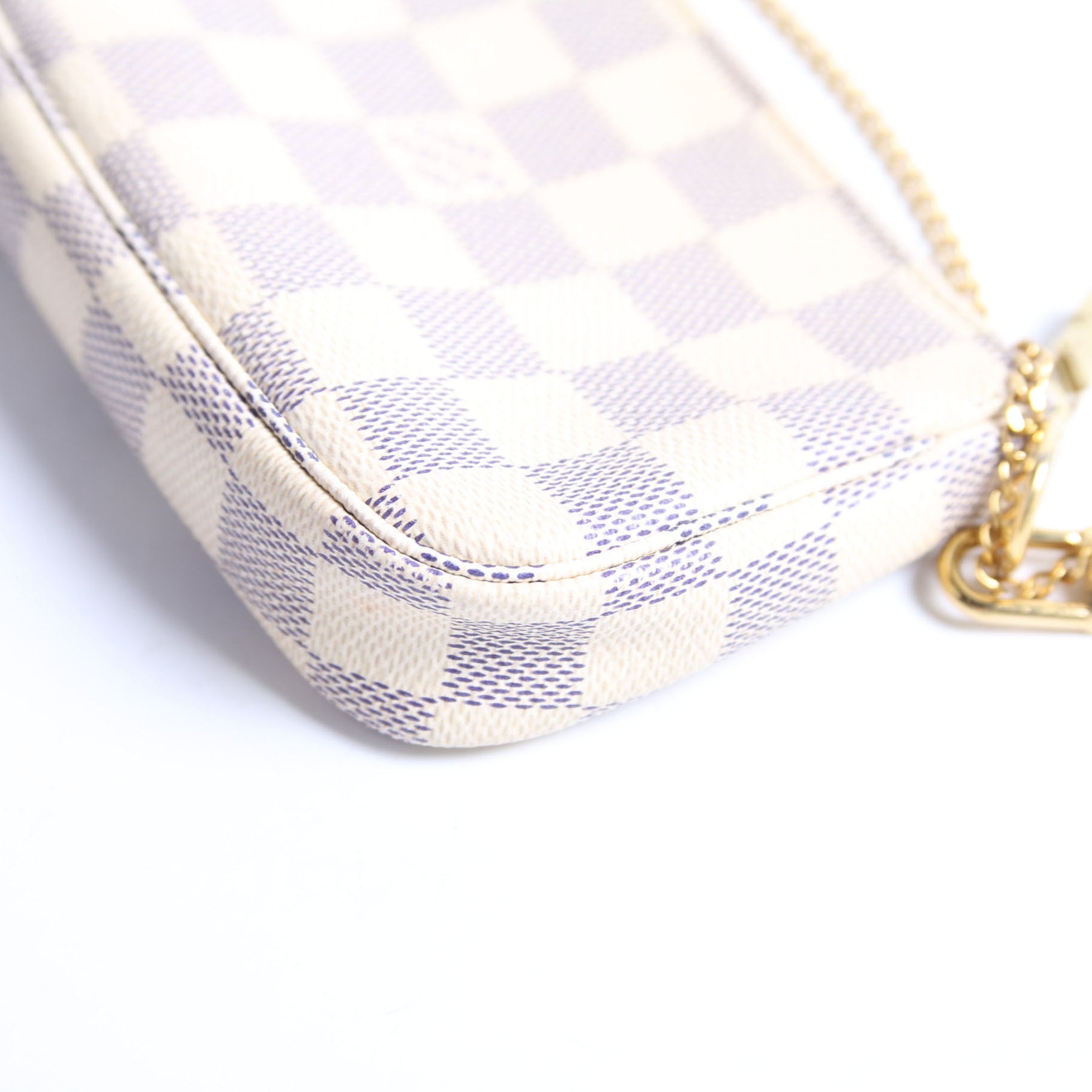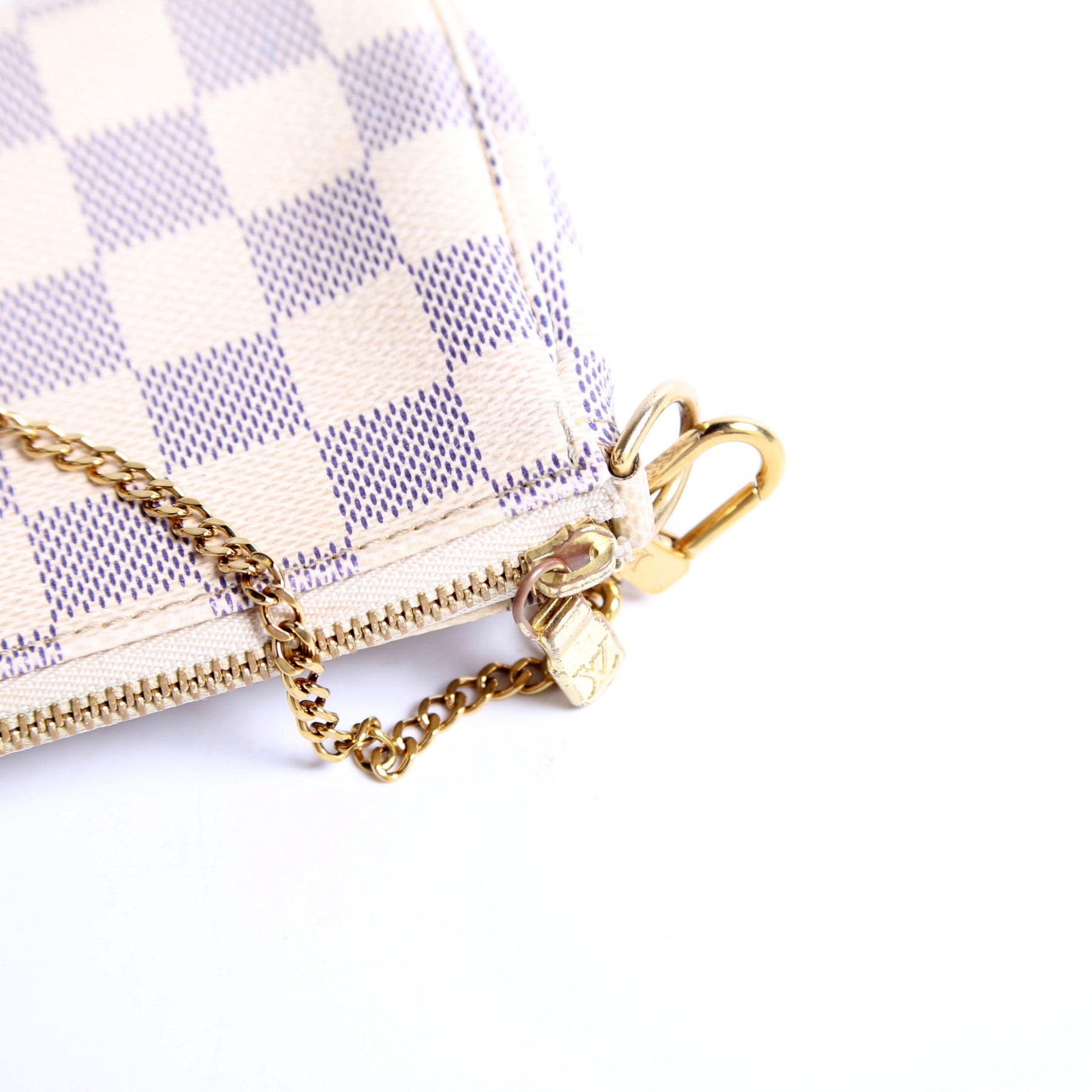 This pre-owned Louis Vuitton Pochette Accessories Mini is guaranteed 100% authentic. The exterior is in the classic Louis Vuitton Damier Azur Coated Canvas.