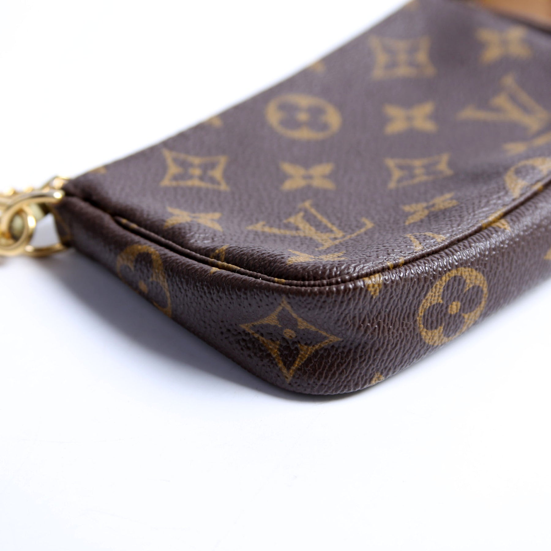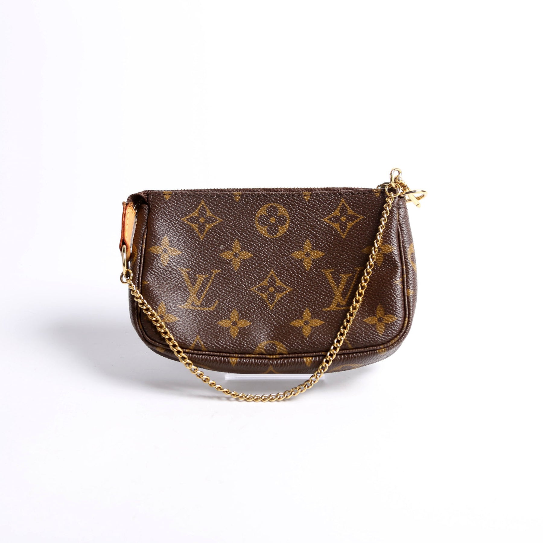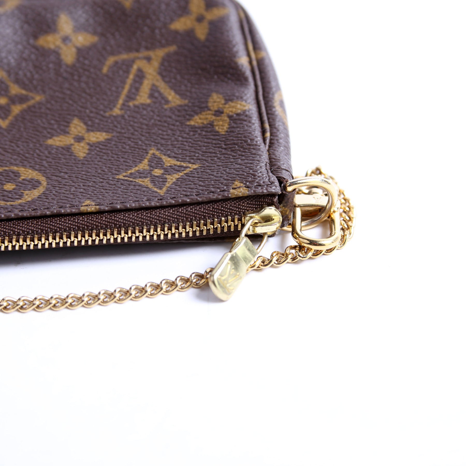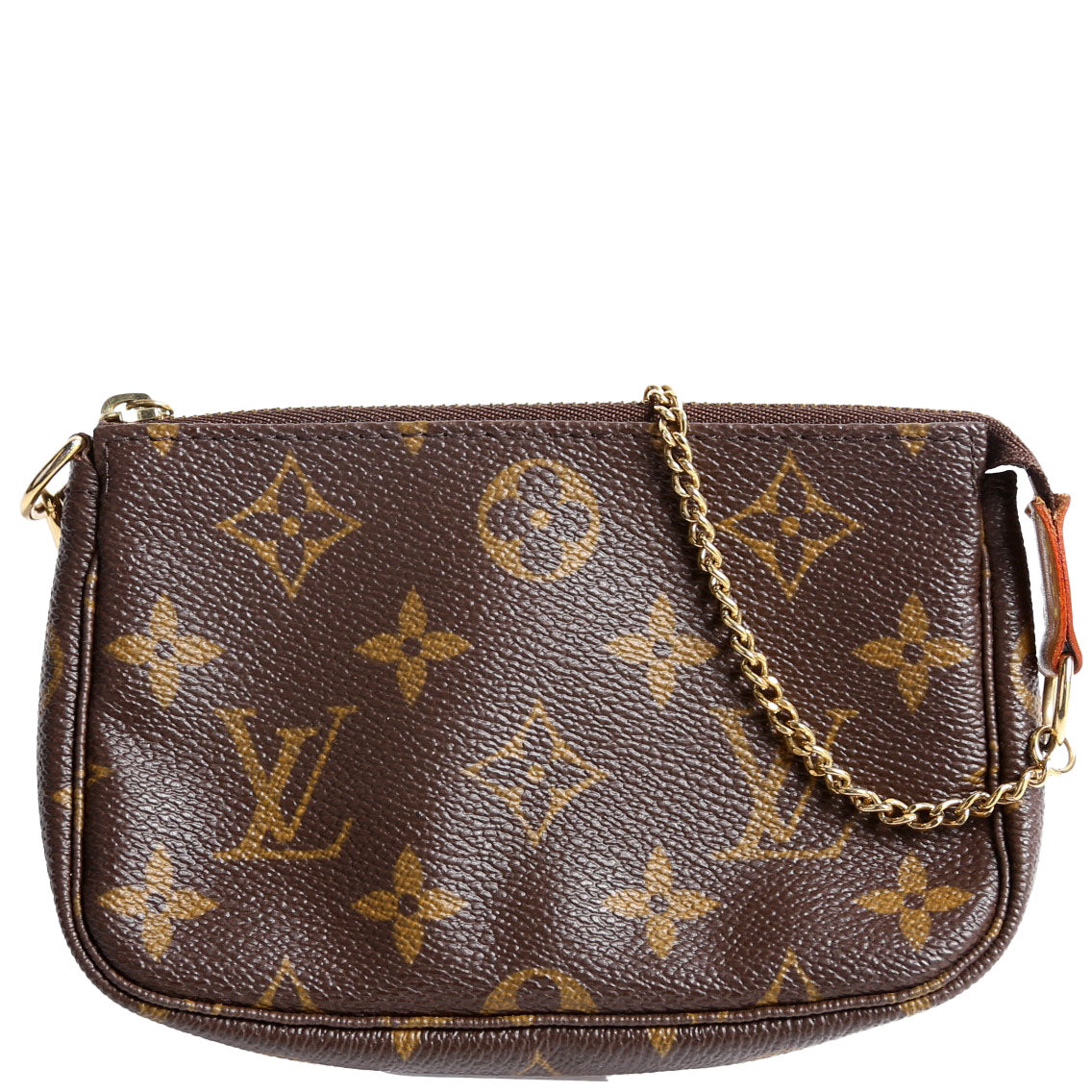 This pre-owned Louis Vuitton Pochette Accessories Mini is guaranteed 100% authentic. The exterior is in the classic Monogram coated canvas.