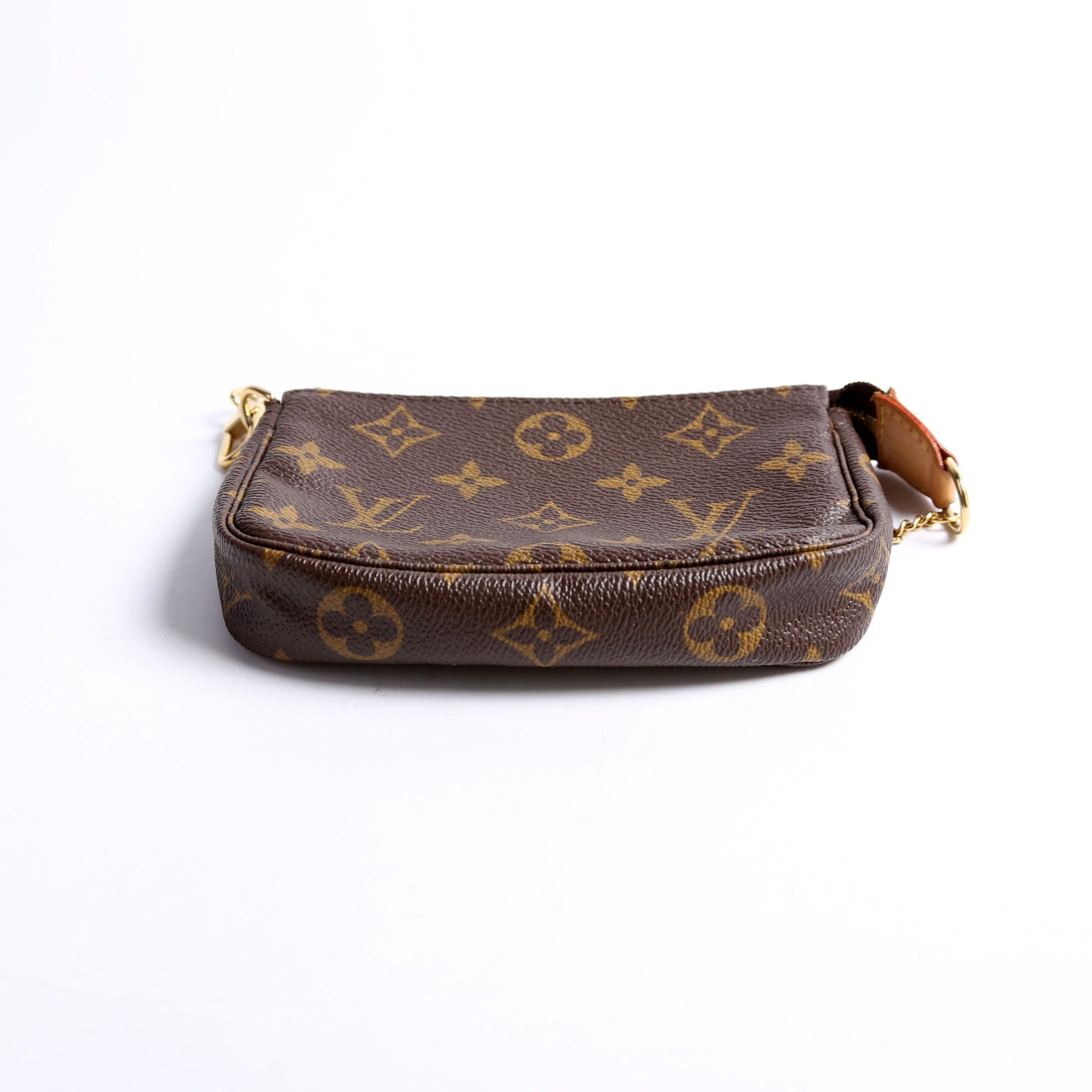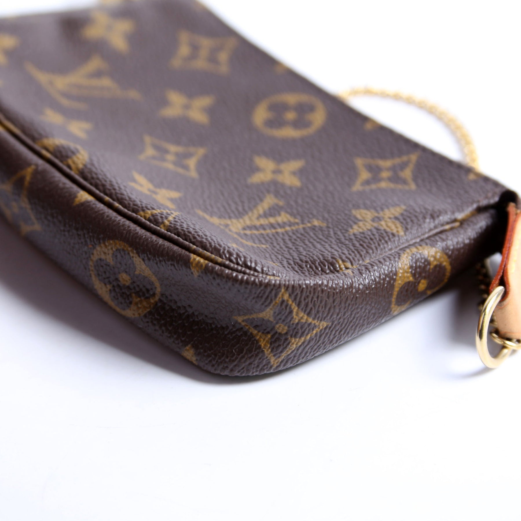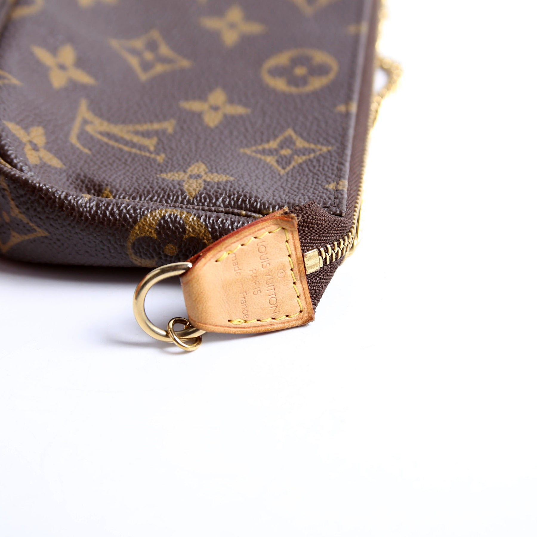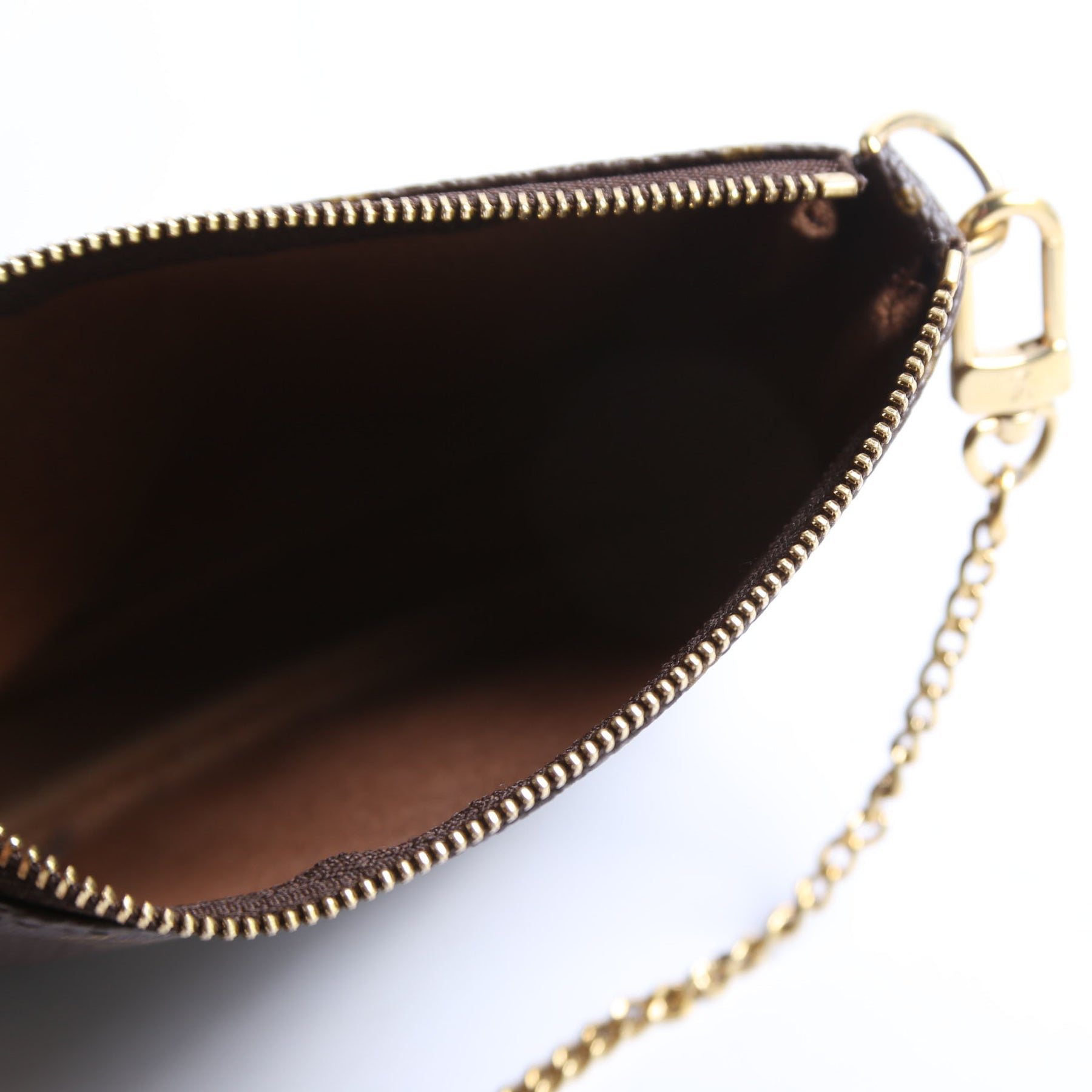 This pre-owned Louis Vuitton Pochette Accessories Mini is guaranteed 100% authentic. The exterior is in the classic Monogram coated canvas.
