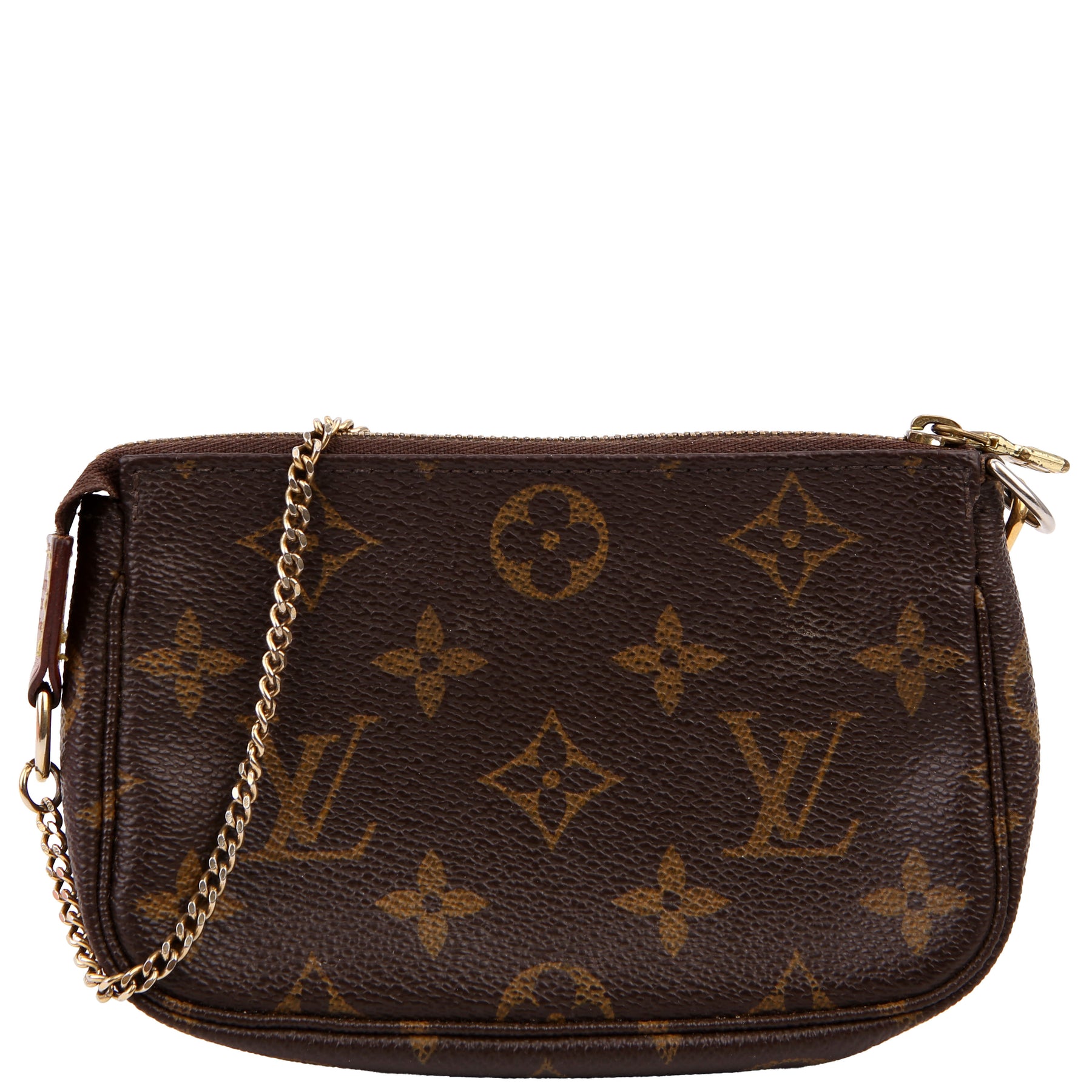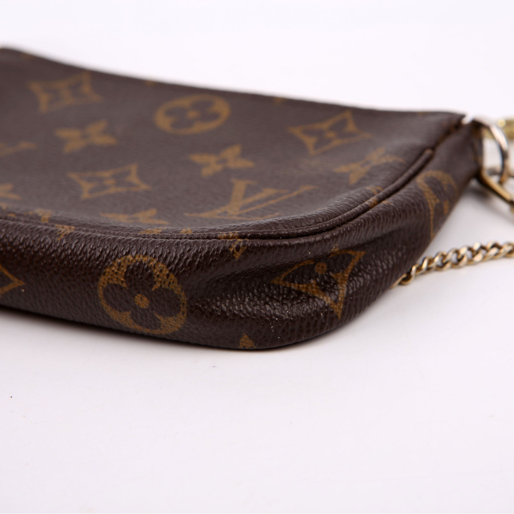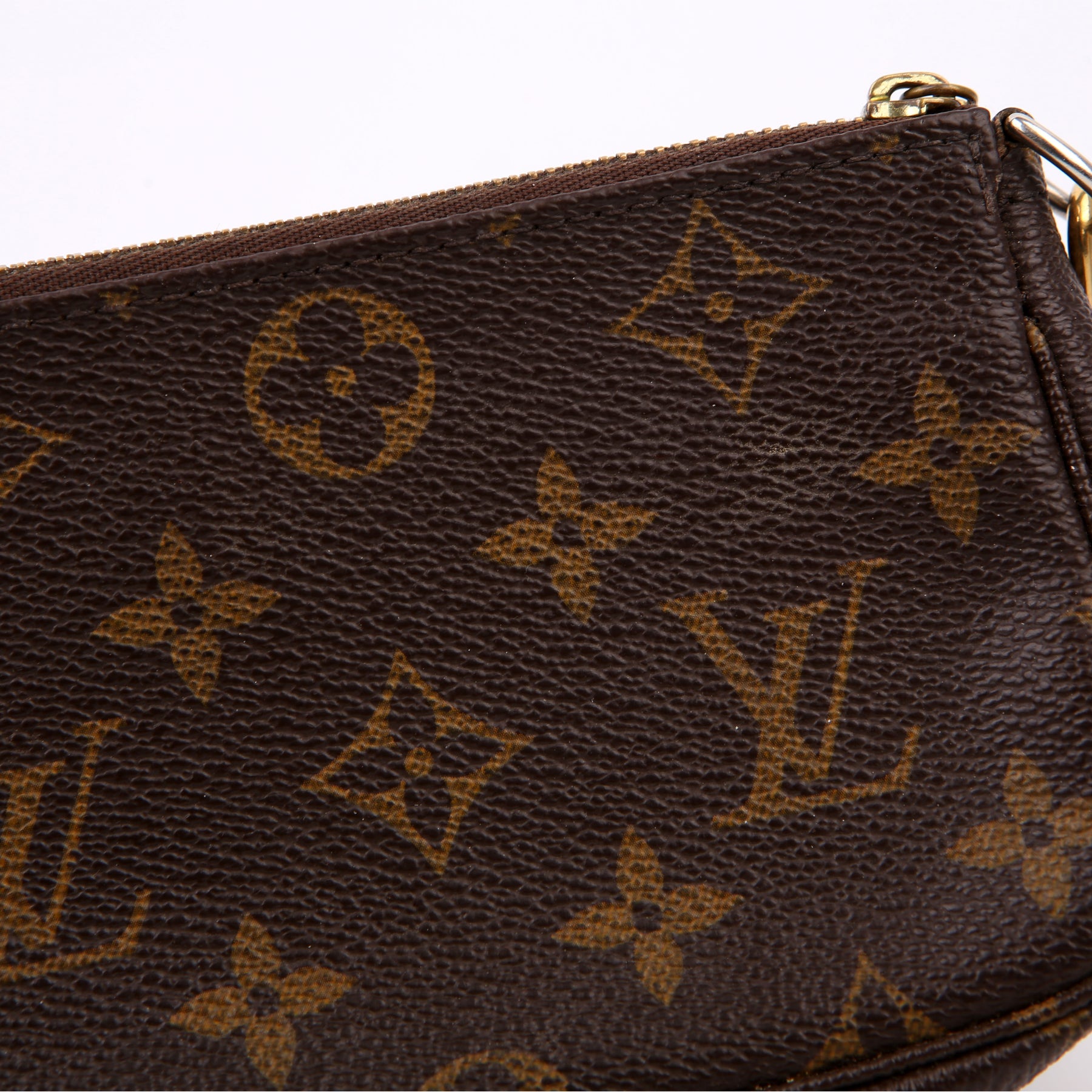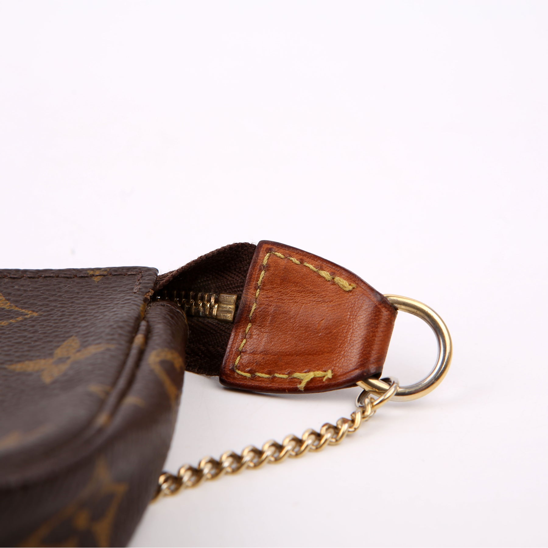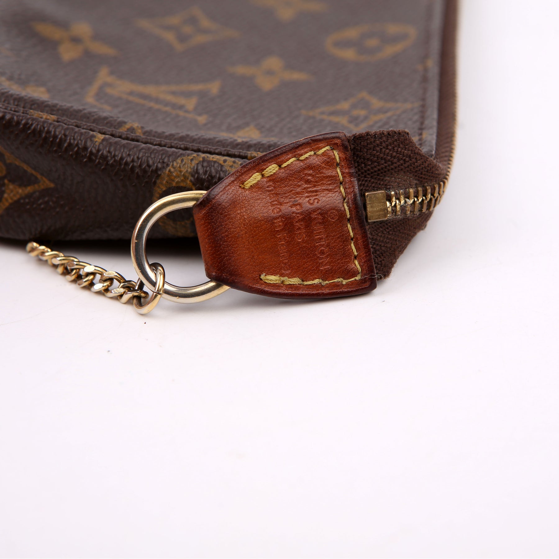 This pre-owned Louis Vuitton Pochette Accessories Mini is guaranteed 100% authentic. The exterior is in the classic Louis Vuitton Monogram coated canvas.