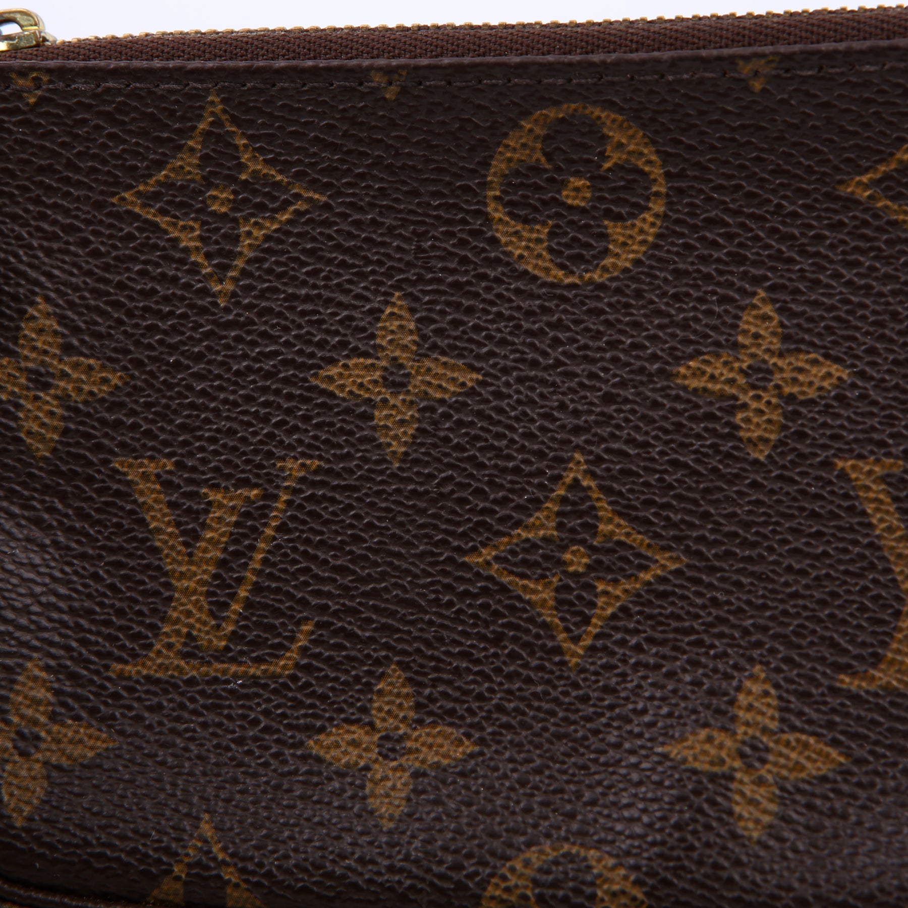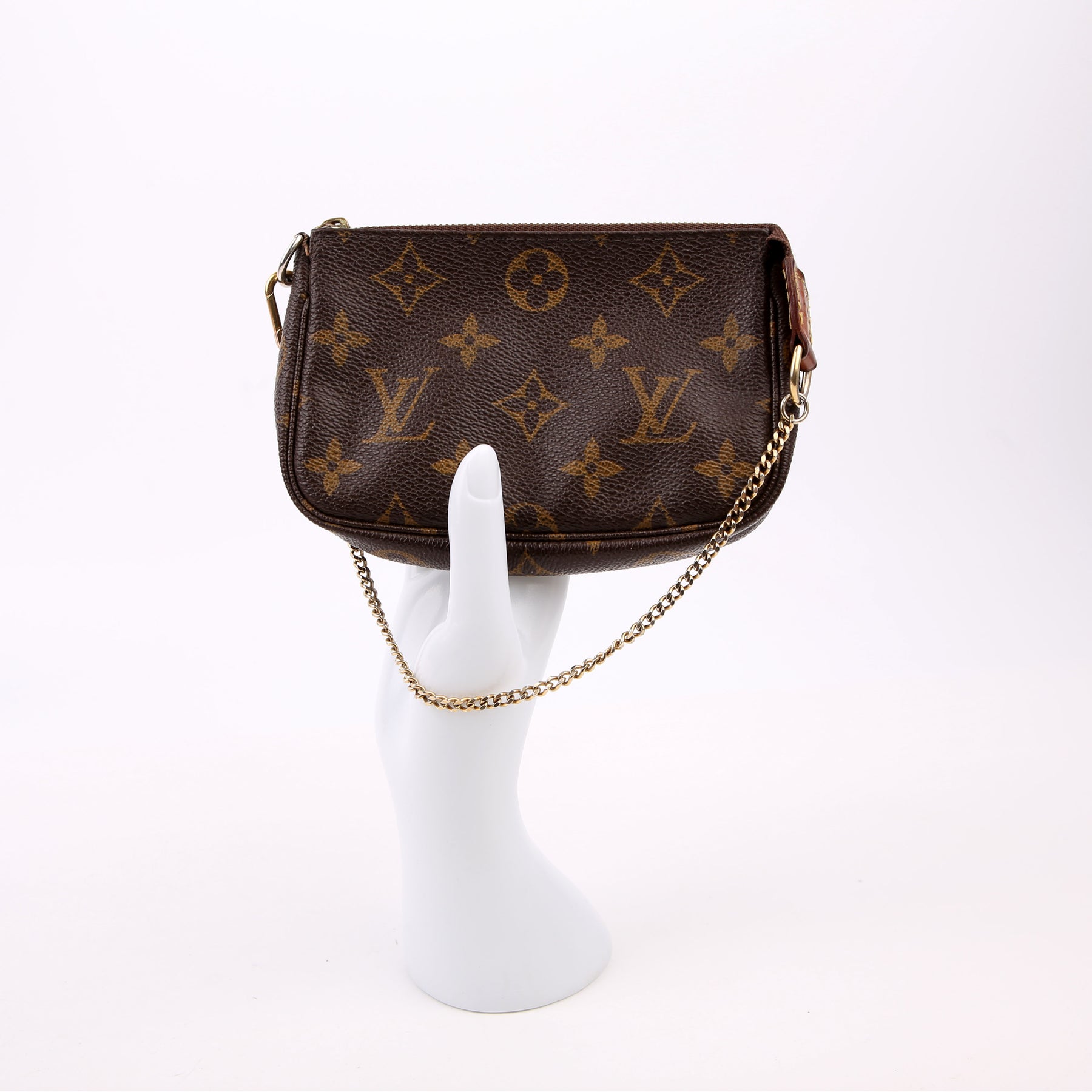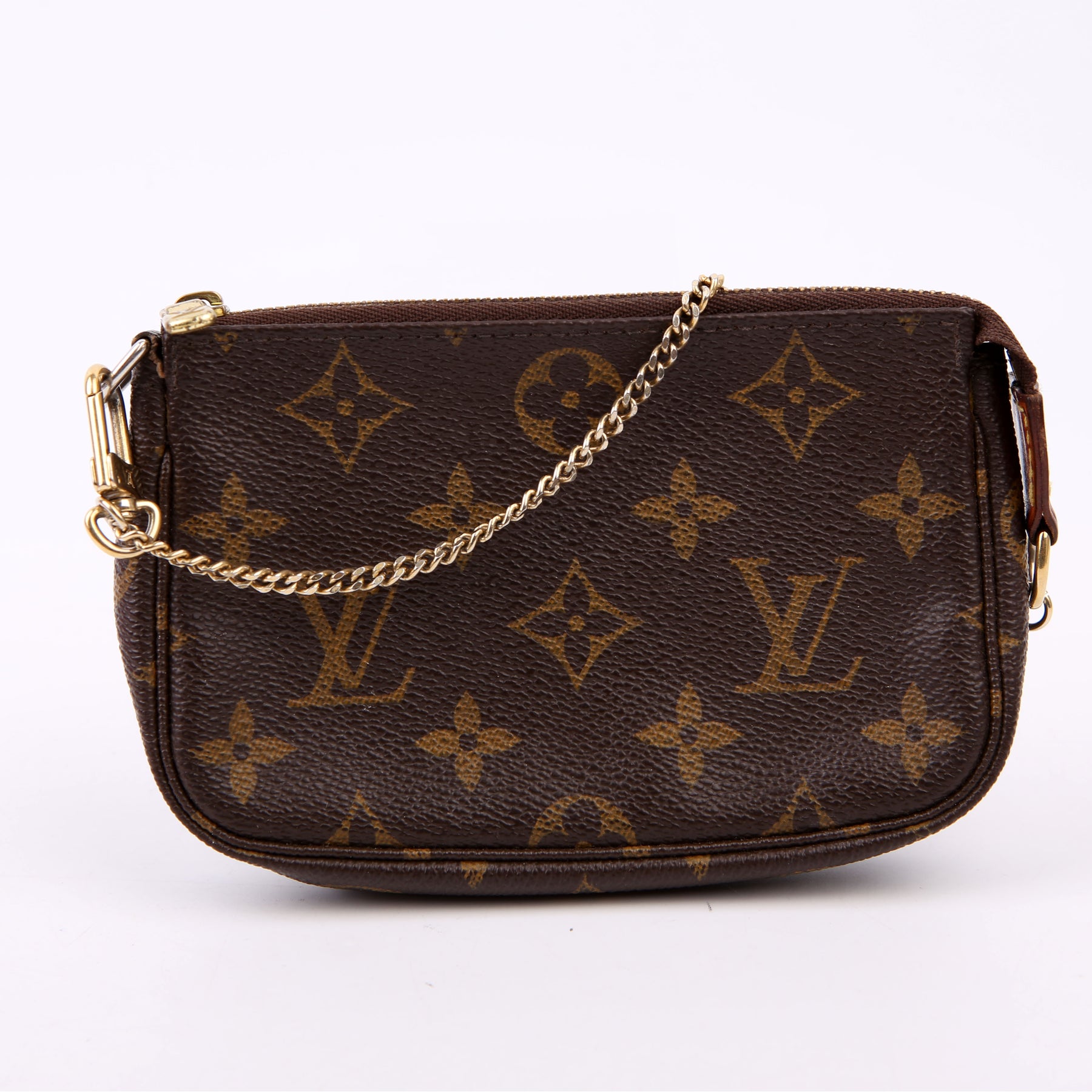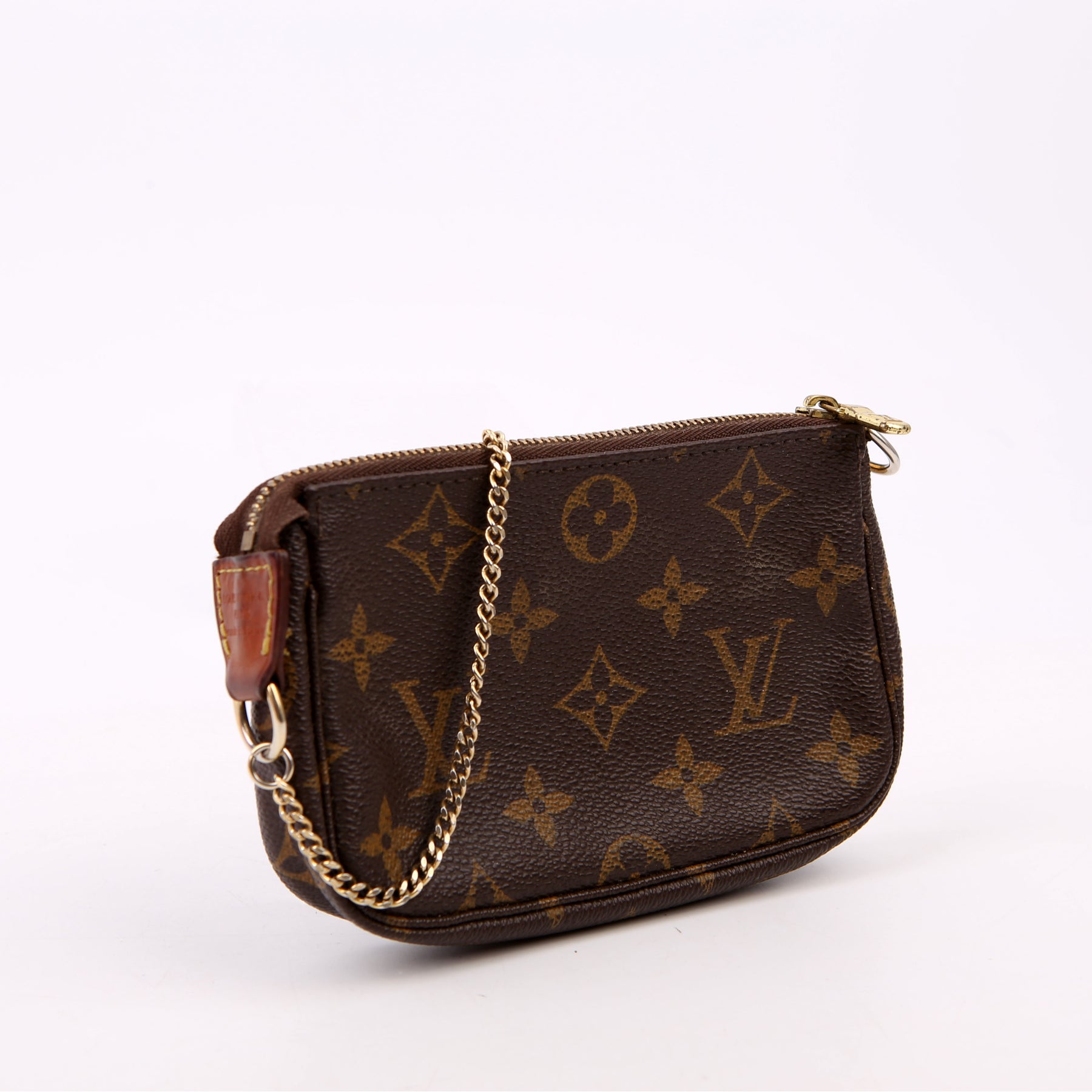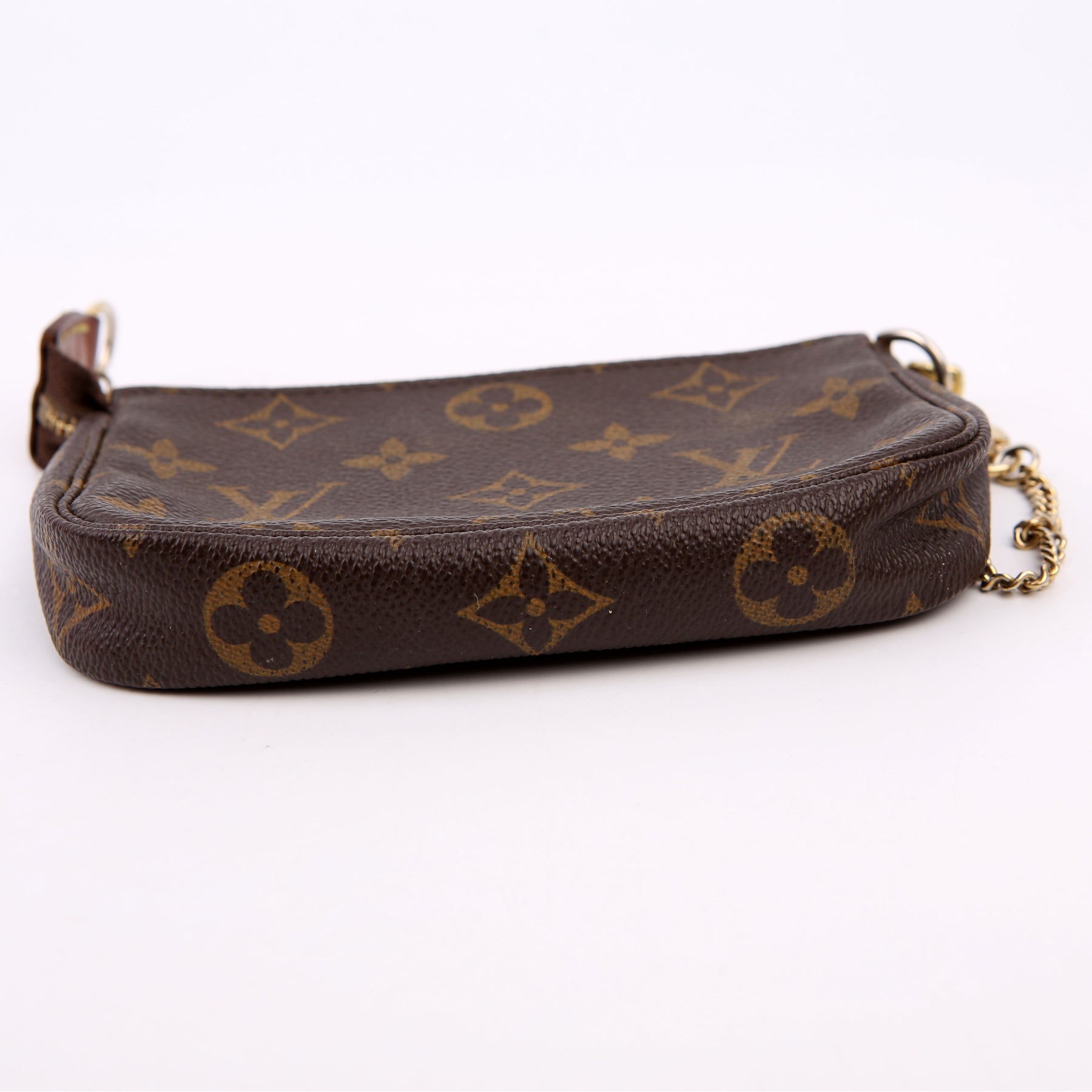 This pre-owned Louis Vuitton Pochette Accessories Mini is guaranteed 100% authentic. The exterior is in the classic Louis Vuitton Monogram coated canvas.
