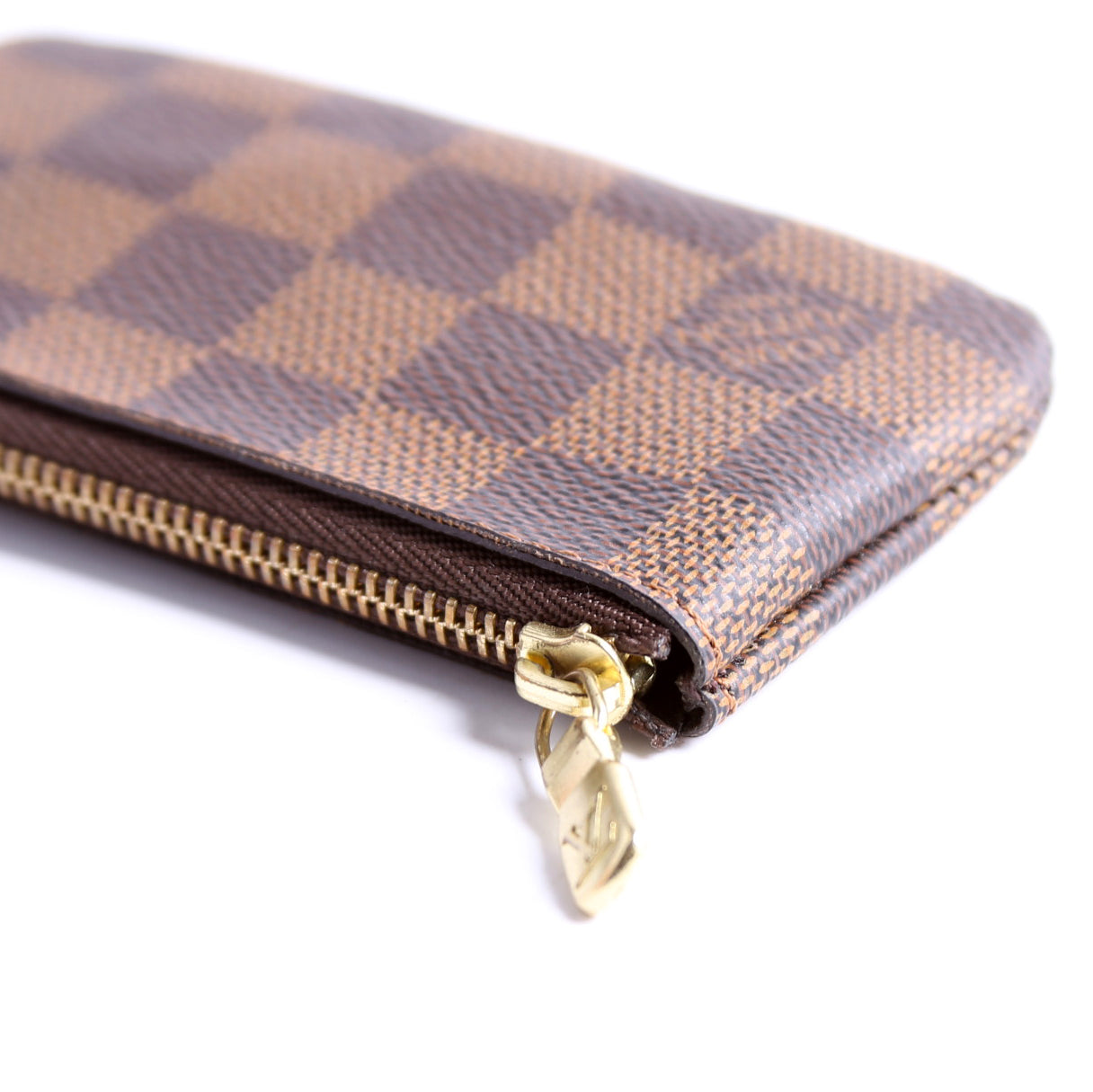 This pre-owned Louis Vuitton Pochette Cles is guaranteed 100% authentic. The exterior is in the classic Louis Vuitton Damier Ebene coated canvas.