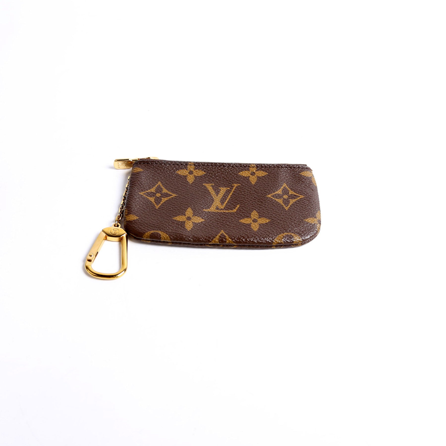 This pre-owned Louis Vuitton Pochette Cles is guaranteed 100% authentic. The exterior is in the classic Louis Vuitton Monogram Coated Canvas.