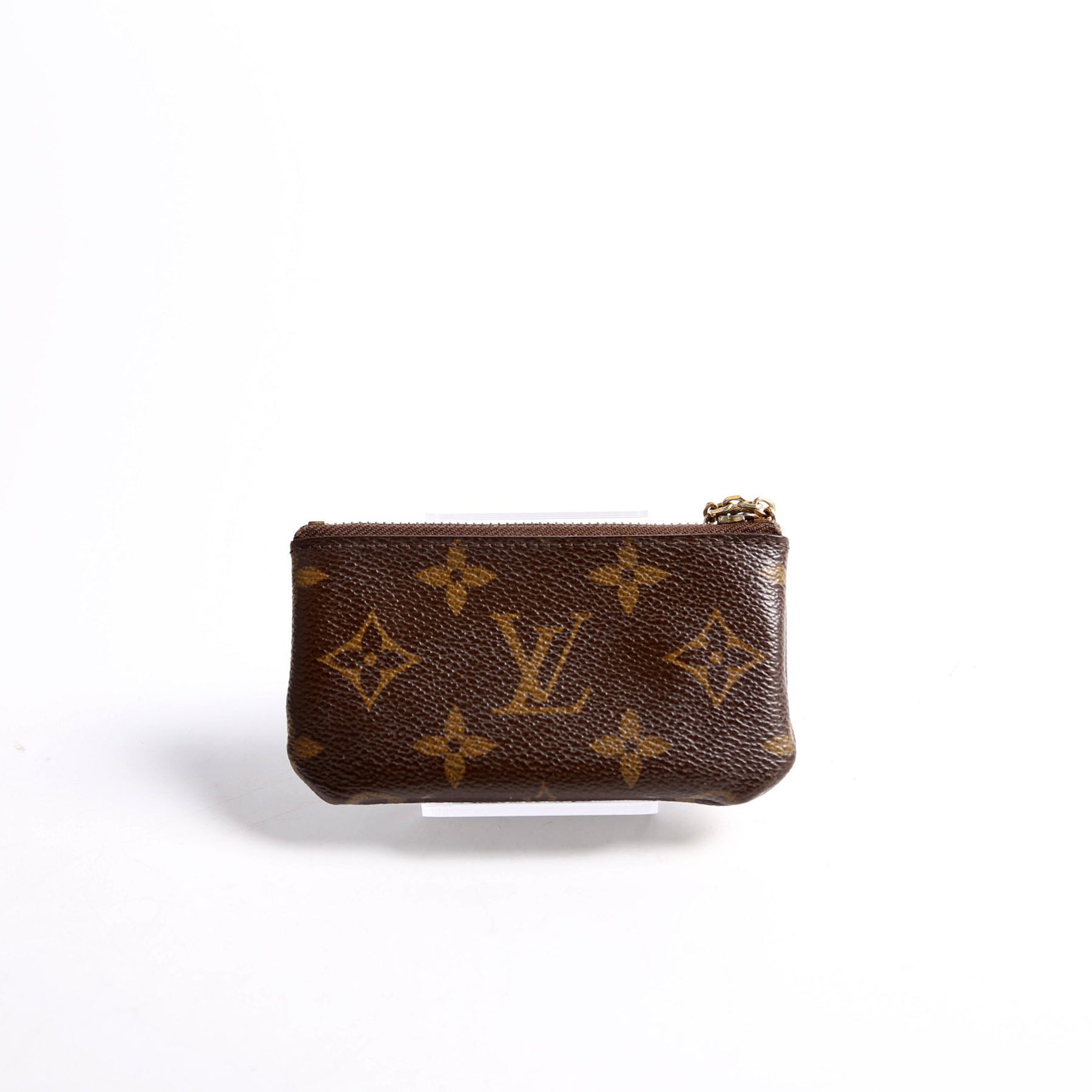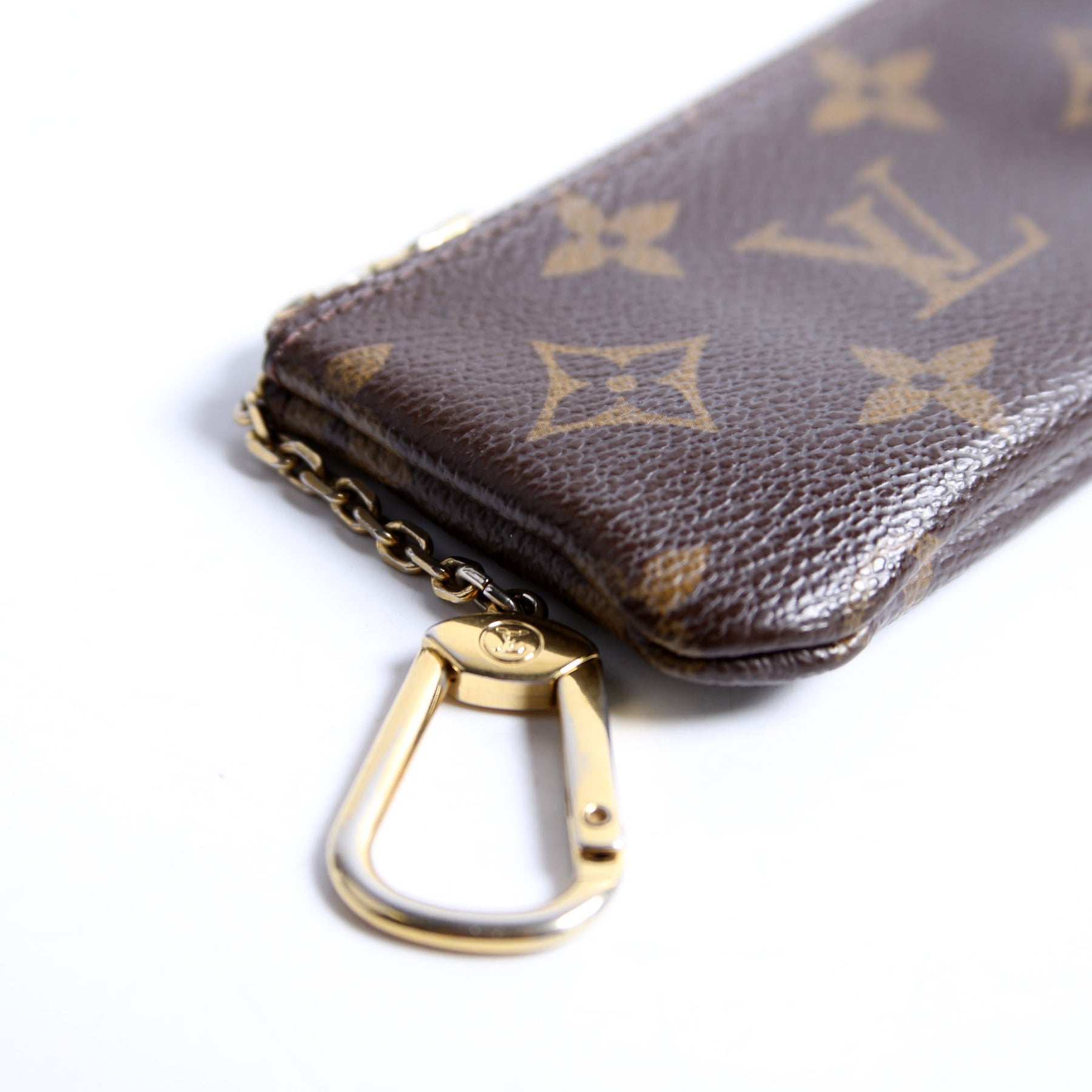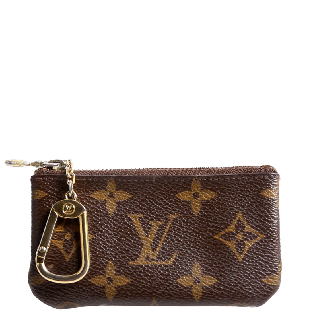 This pre-owned Louis Vuitton Pochette Cles is guaranteed 100% authentic. The exterior is in the classic Louis Vuitton Monogram coated canvas.