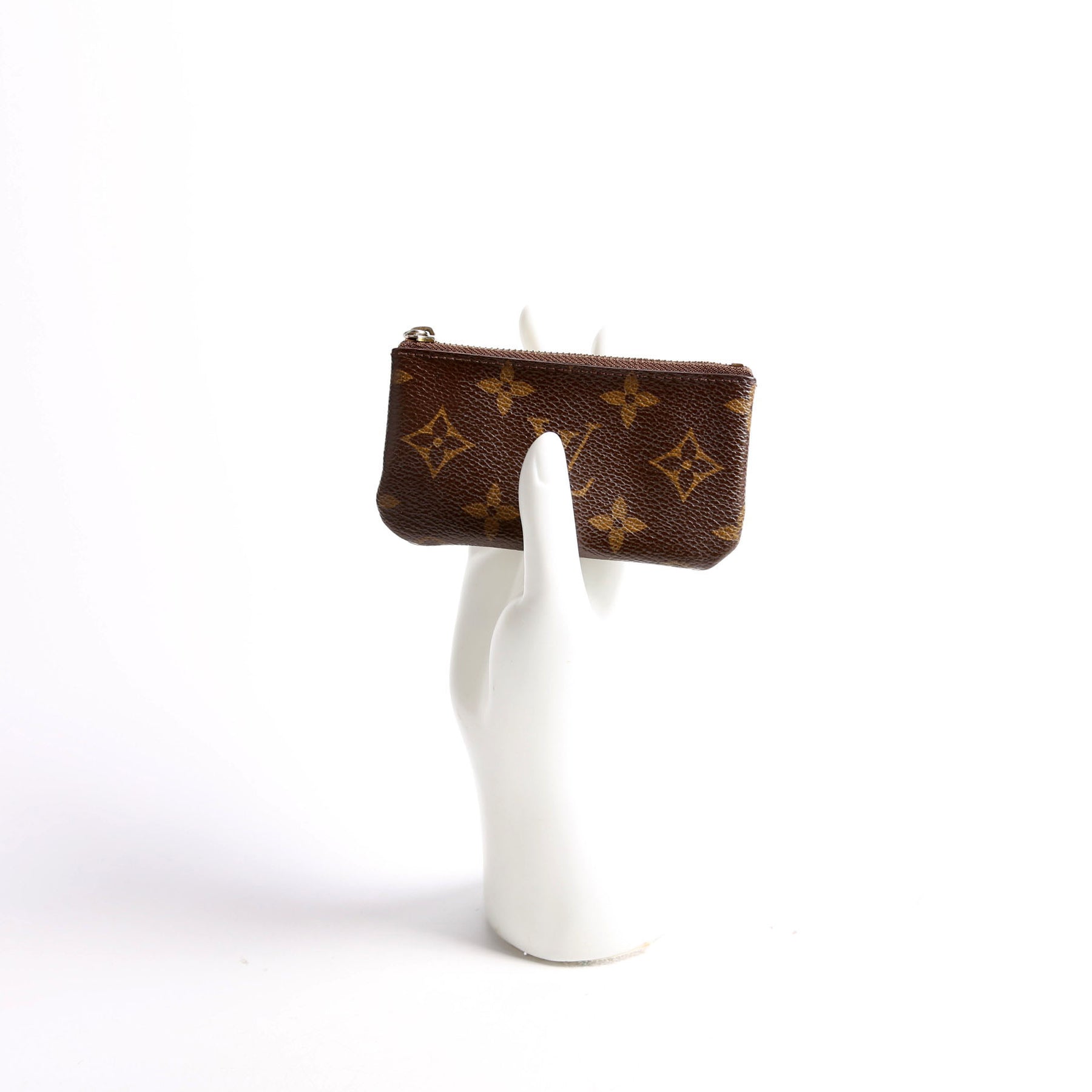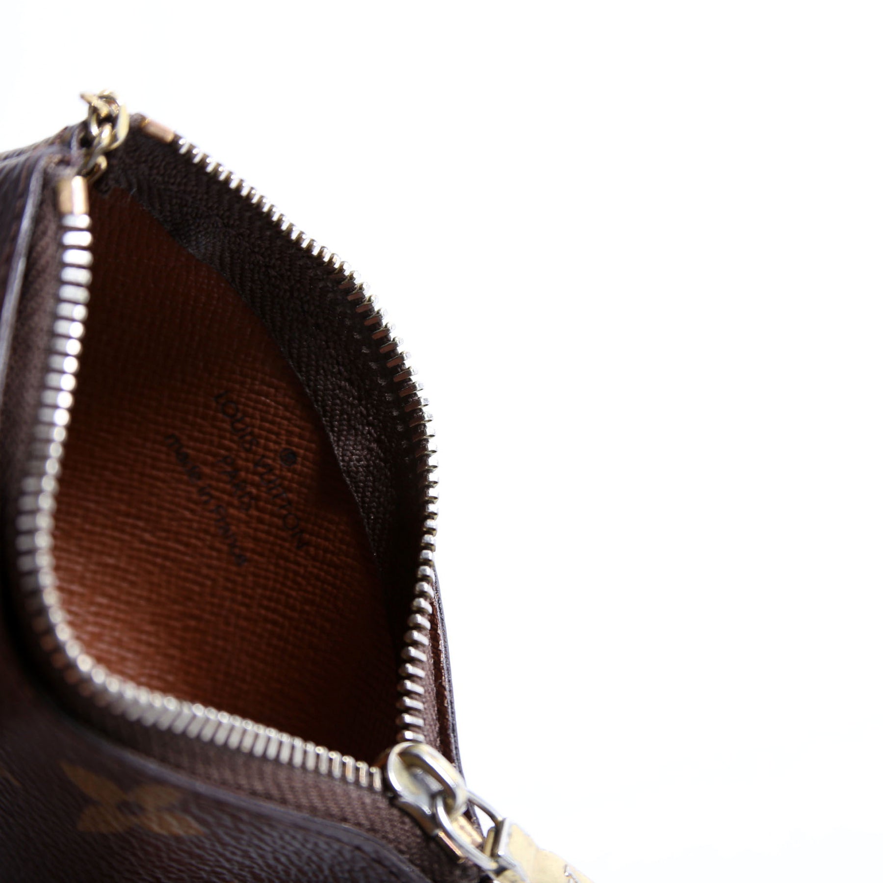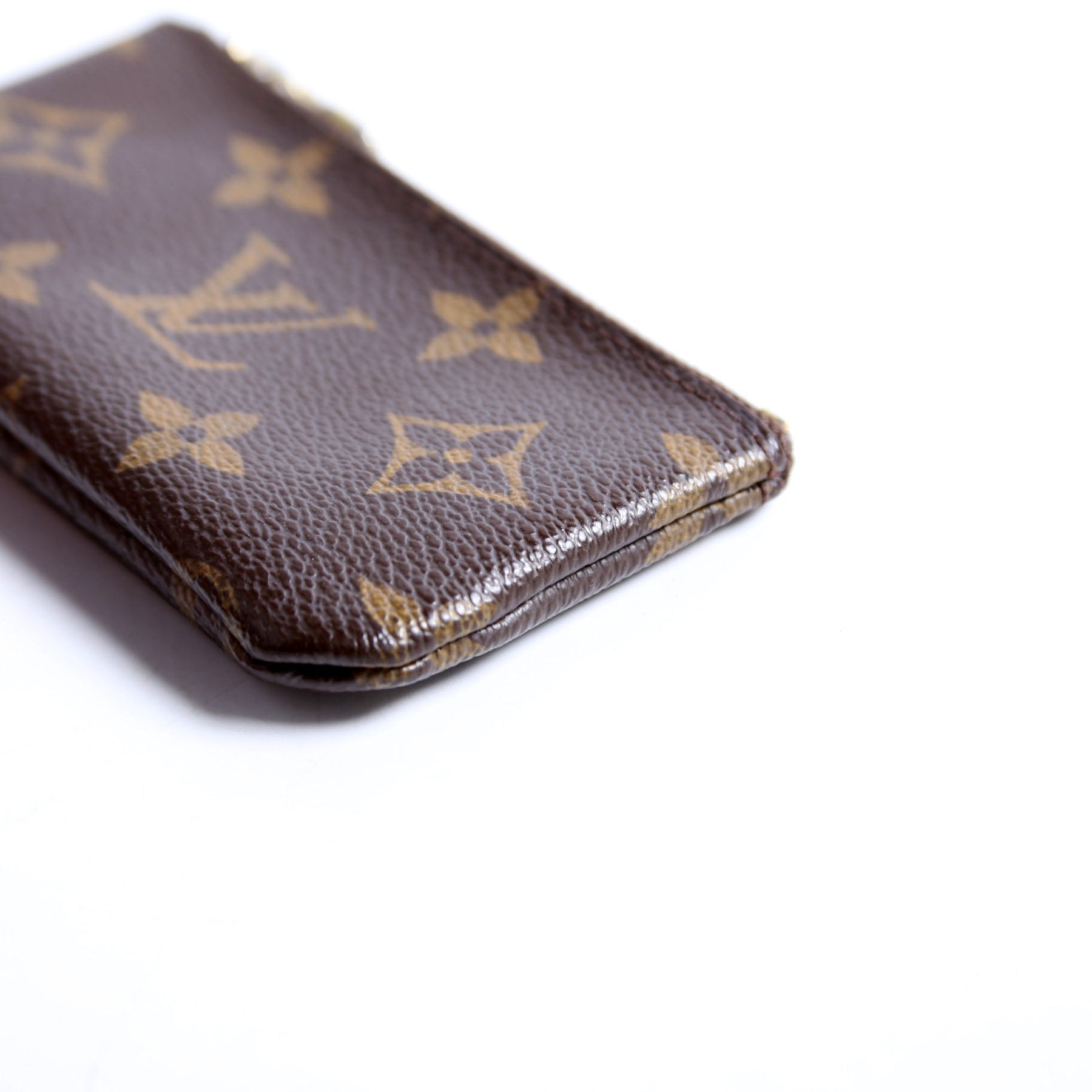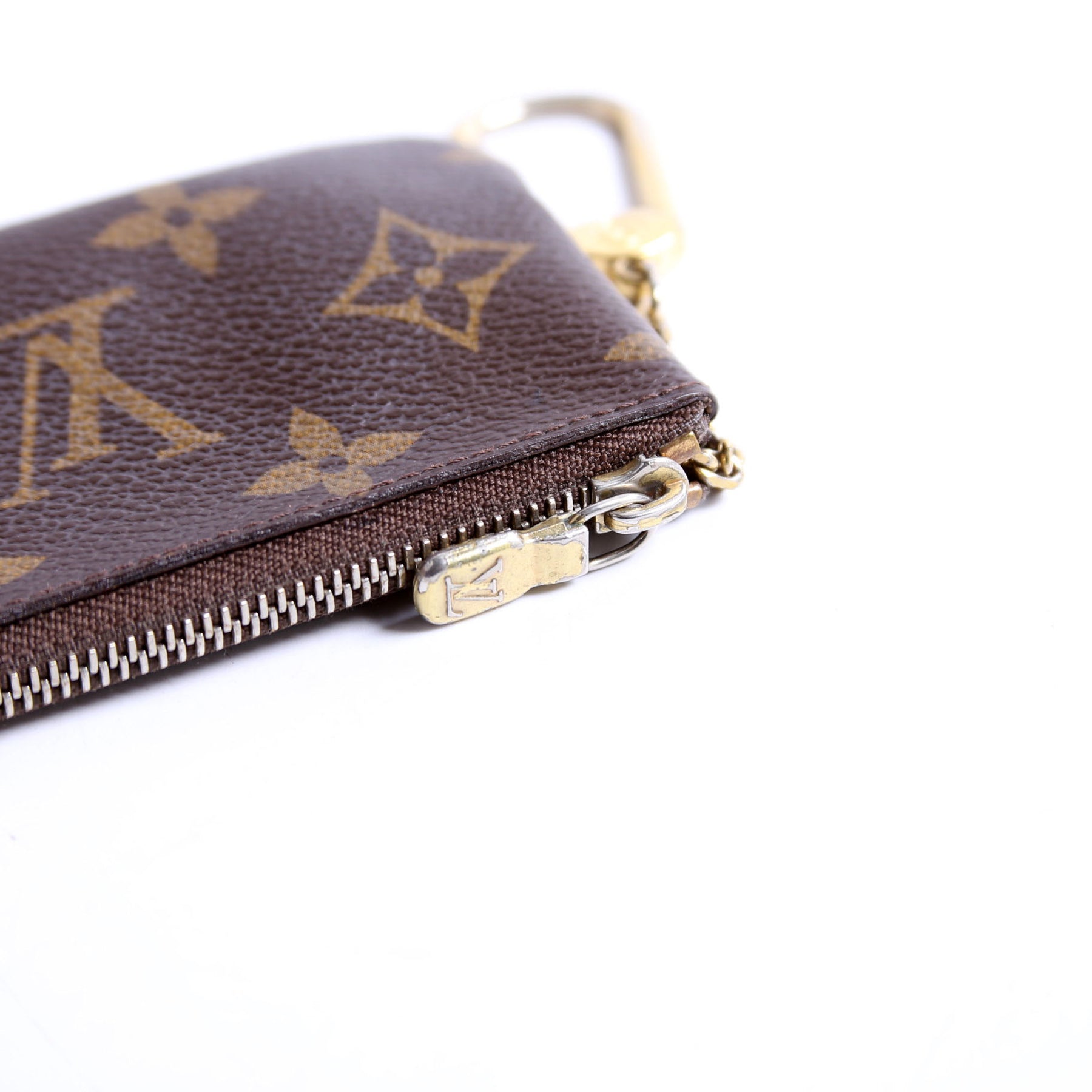 This pre-owned Louis Vuitton Pochette Cles is guaranteed 100% authentic. The exterior is in the classic Louis Vuitton Monogram coated canvas.