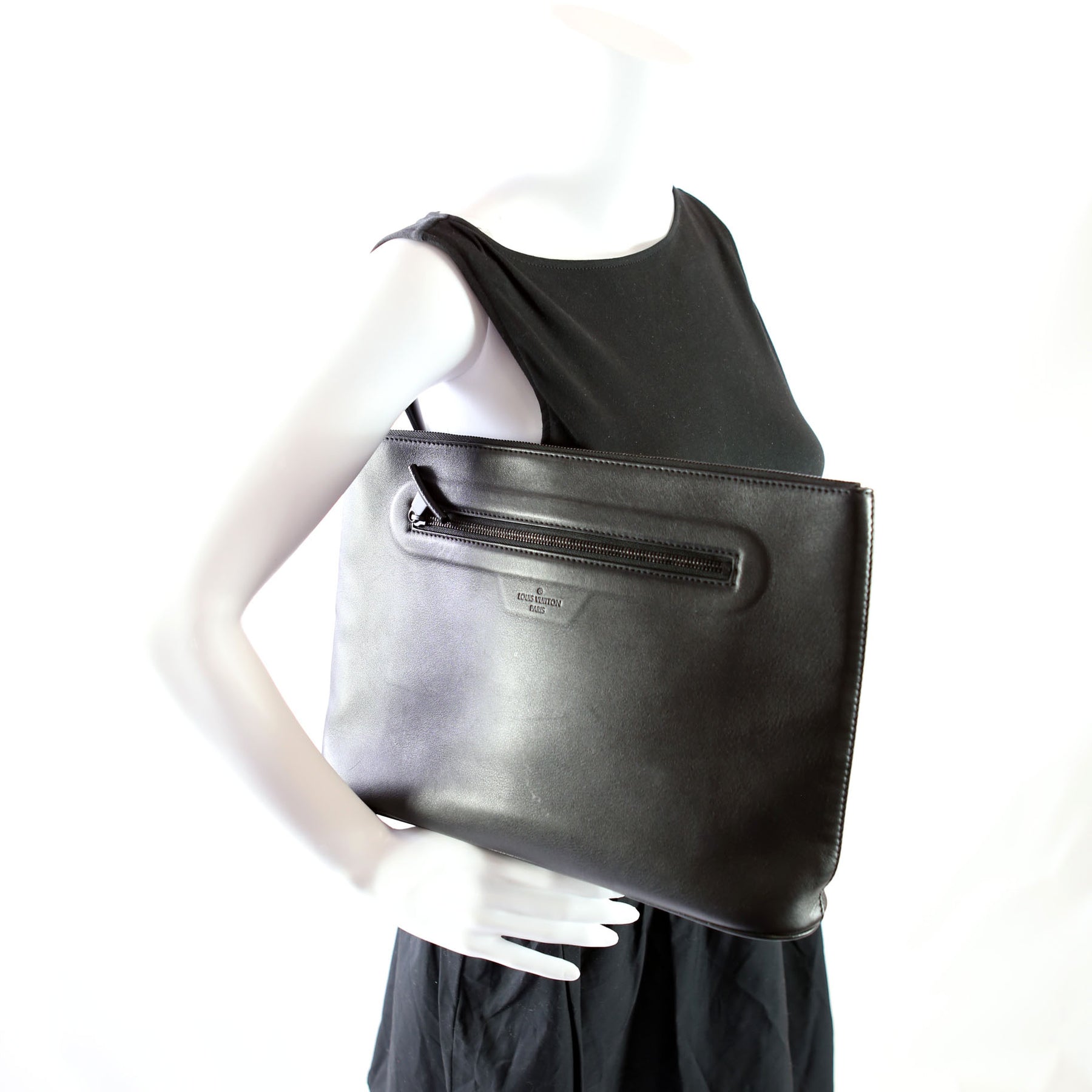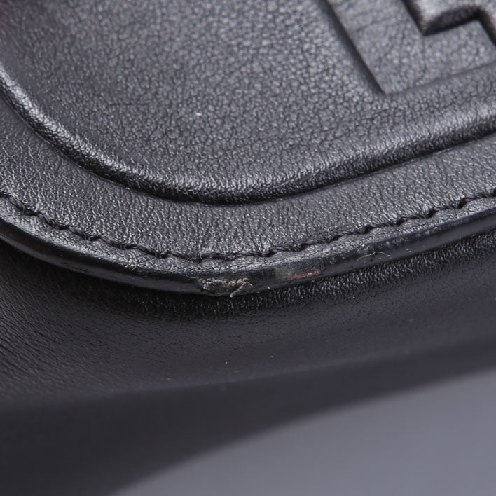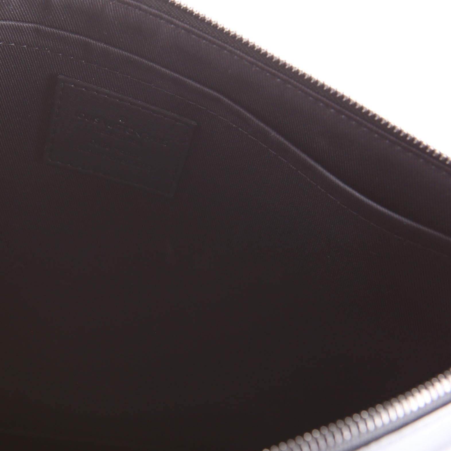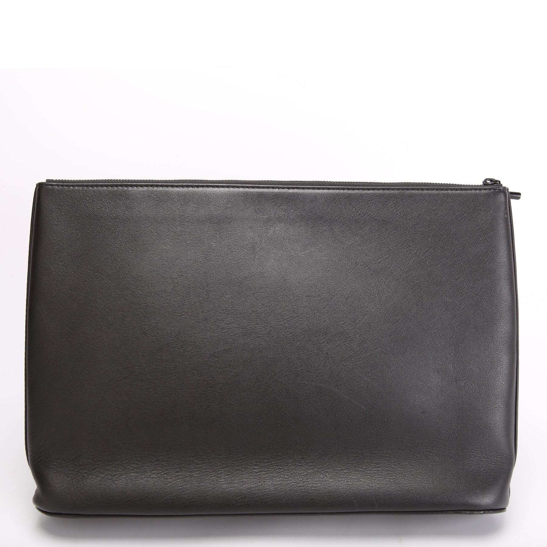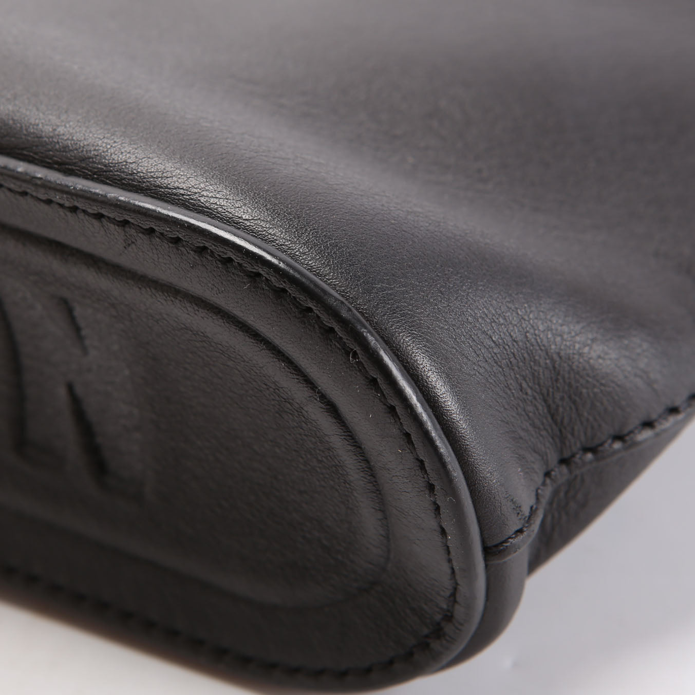Exterior: The exterior leather shows light scuffs throughout. The corners and leather piping show light wear. It features one zip closure pocket.