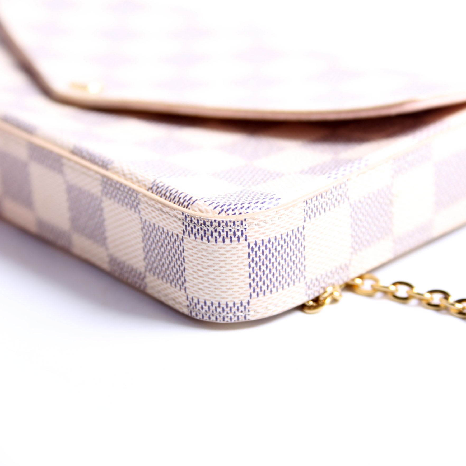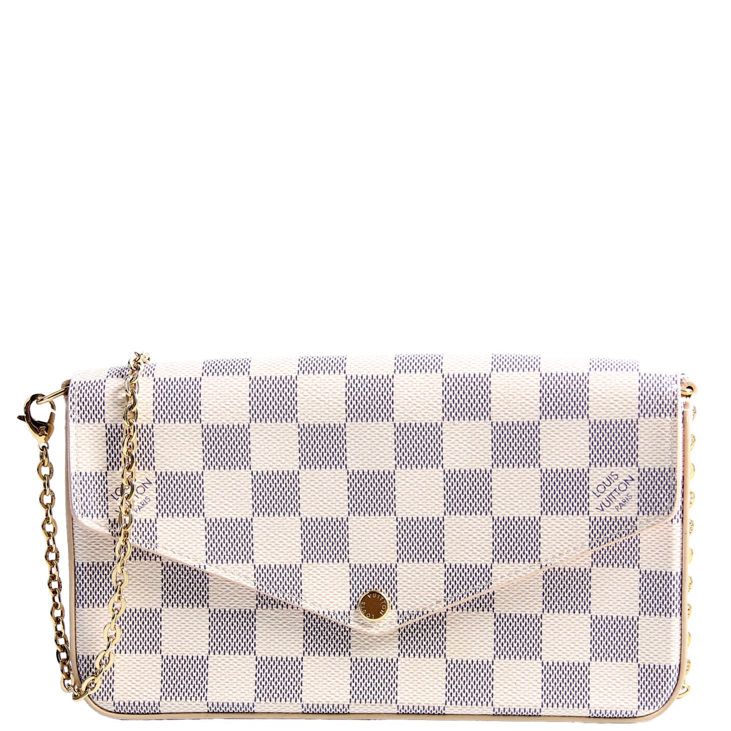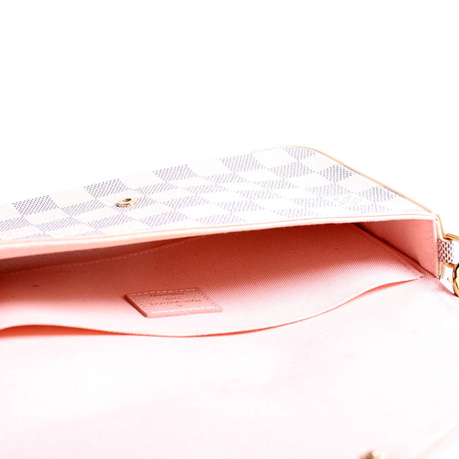 This pre-owned Louis Vuitton Pochette Felicie is guaranteed 100% authentic. The exterior is in the classic Louis Vuitton Damier Azur.