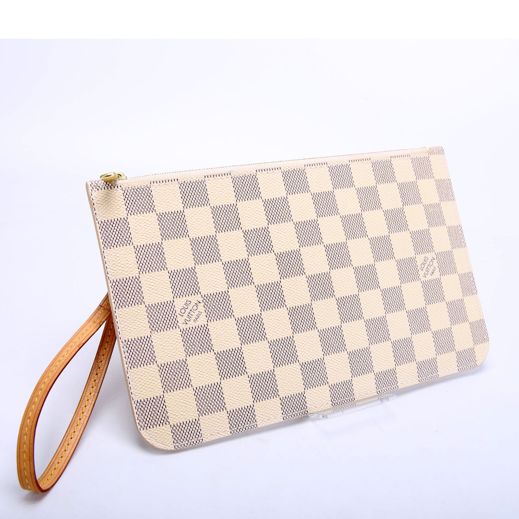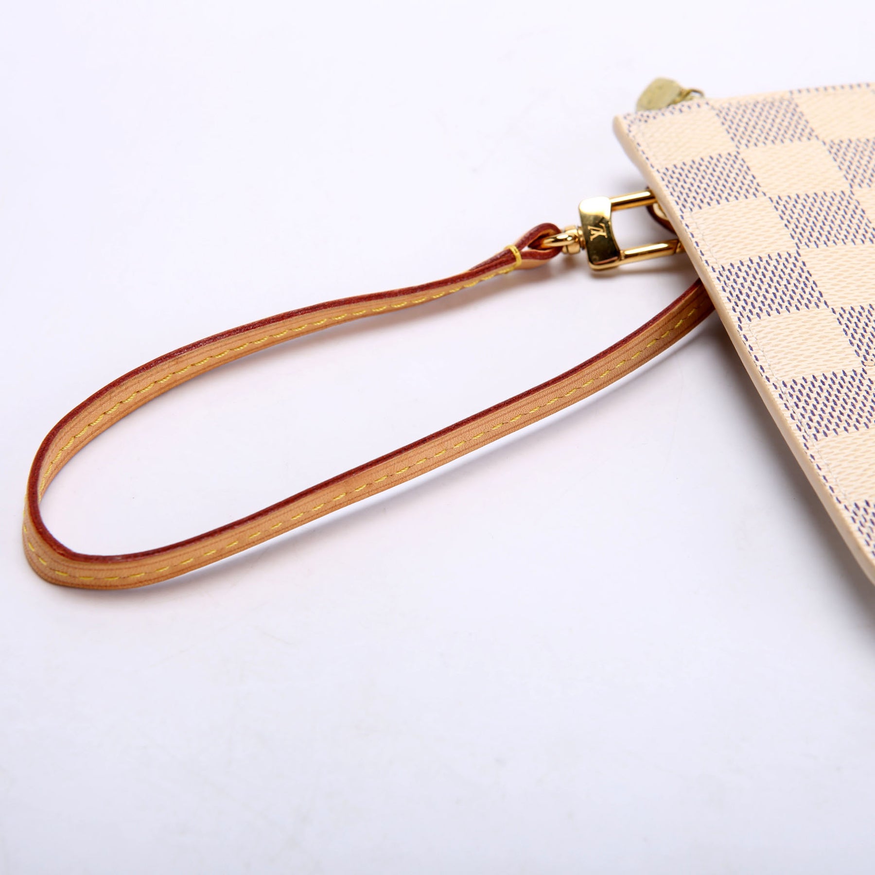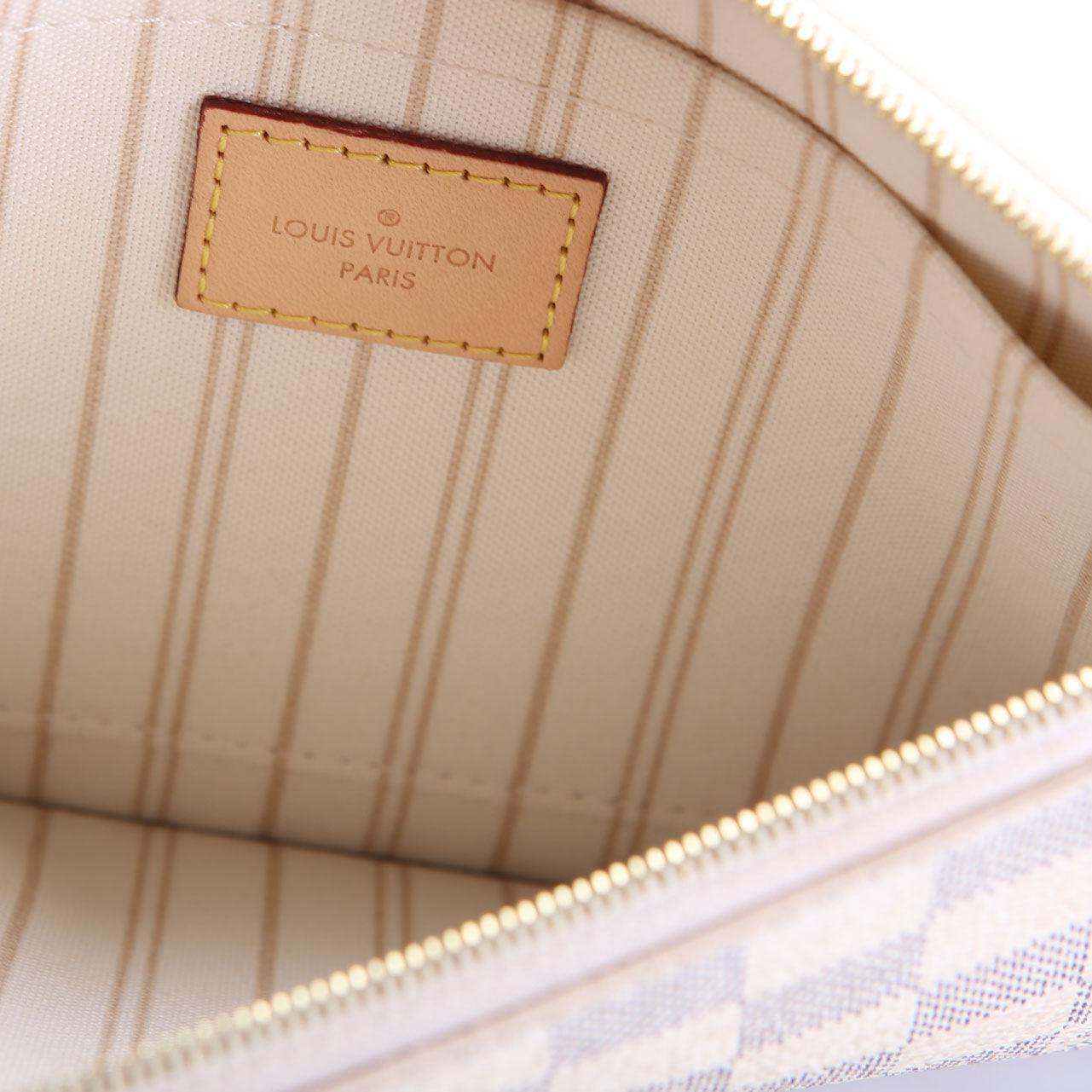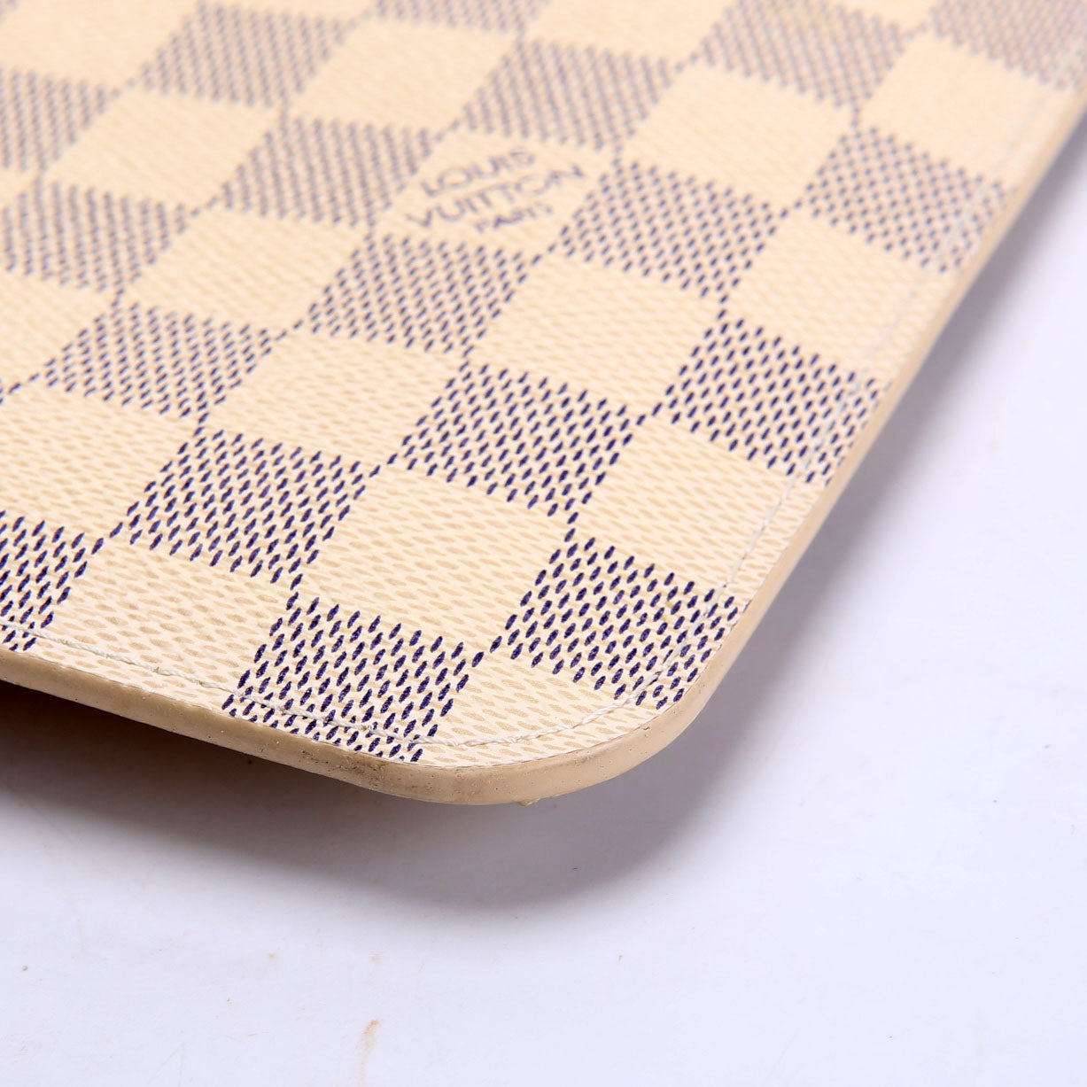 This pre-owned Louis Vuitton Pochette Only Neverfull is guaranteed 100% authentic. The exterior is in the classic Louis Vuitton Damier Azur coated canvas.