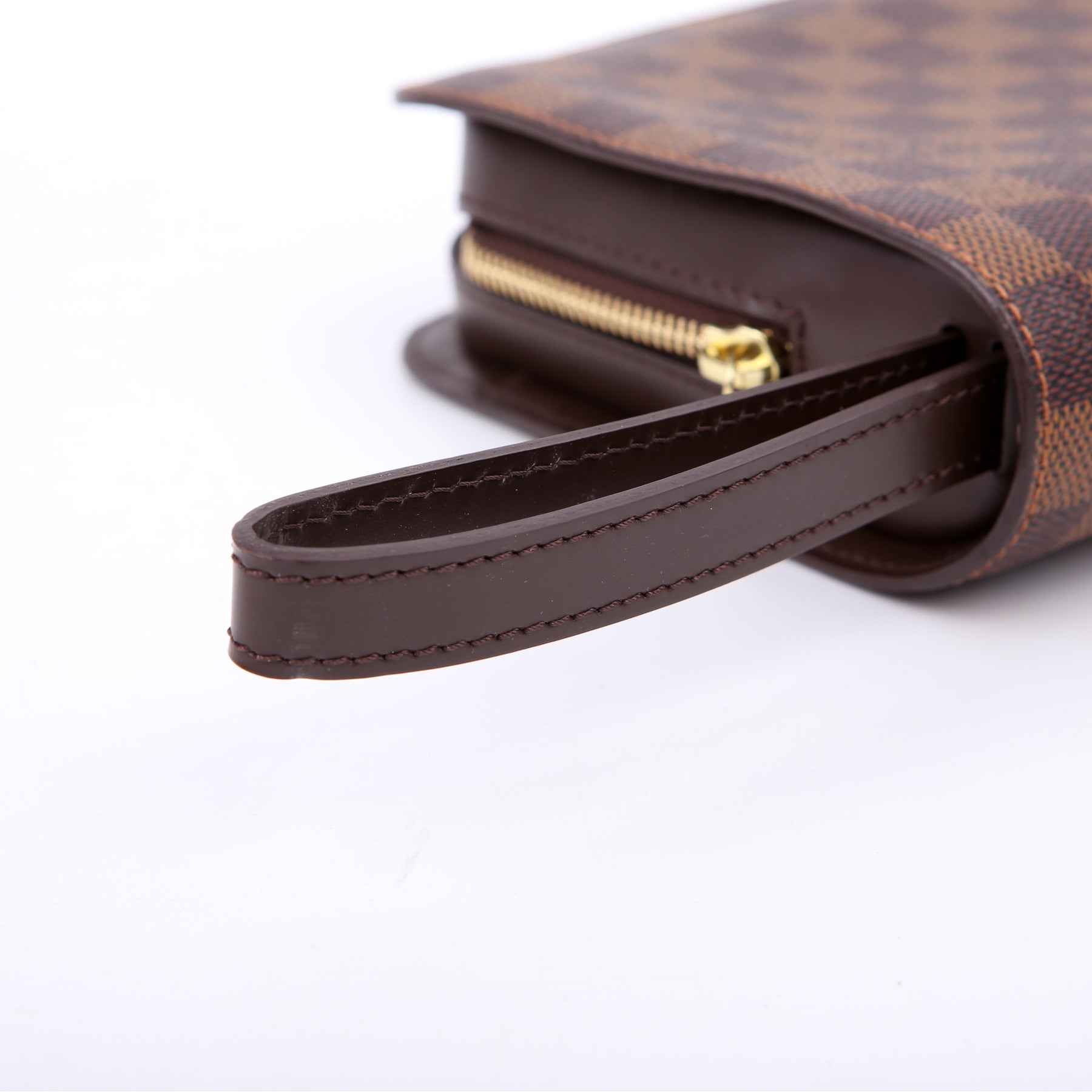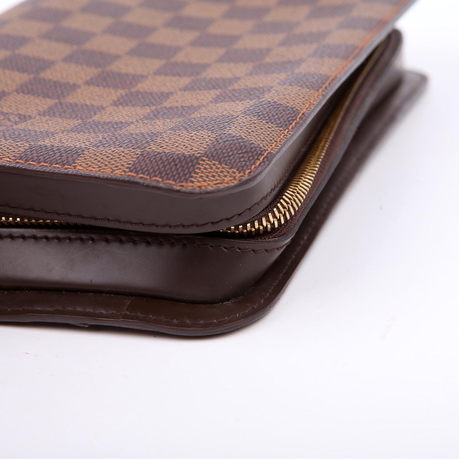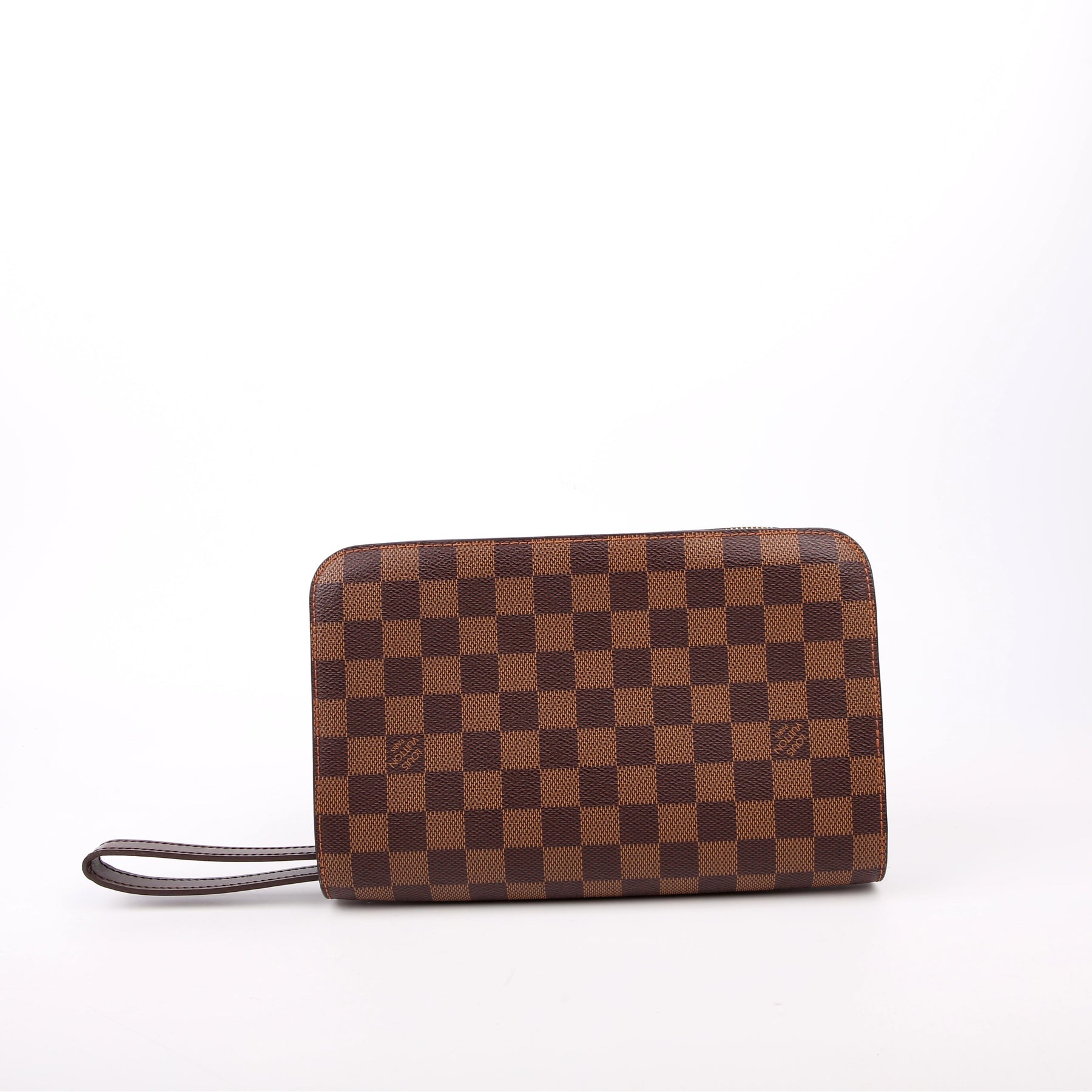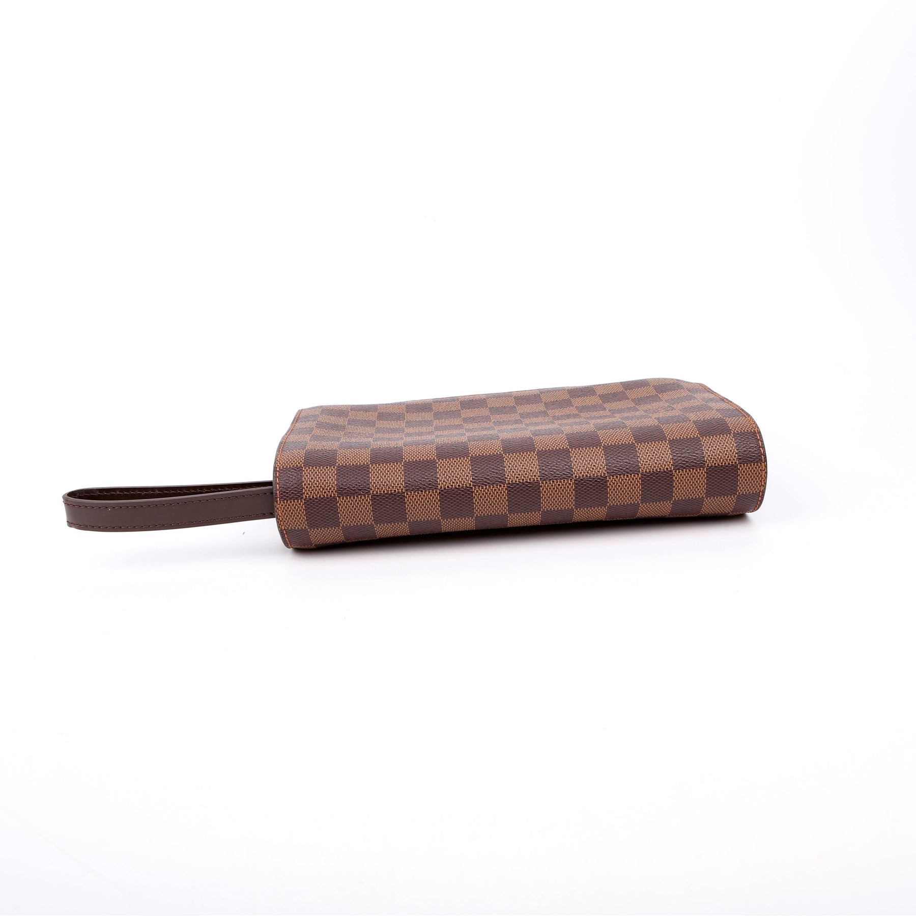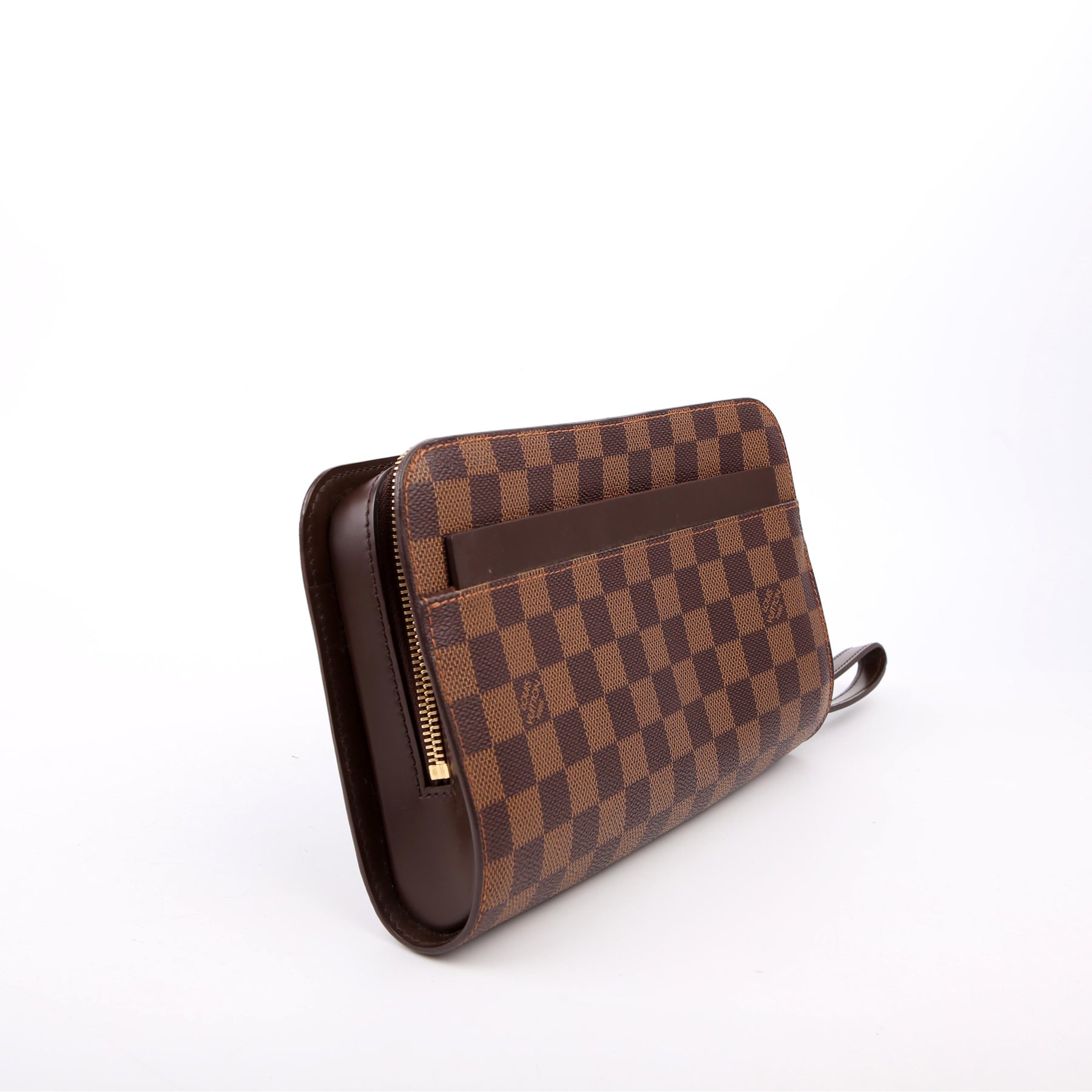 This pre-owned Louis Vuitton Pochette Saint Louis Clutch is guaranteed 100% authentic. The exterior is in the classic Louis Vuitton Damier Ebene coated canvas.