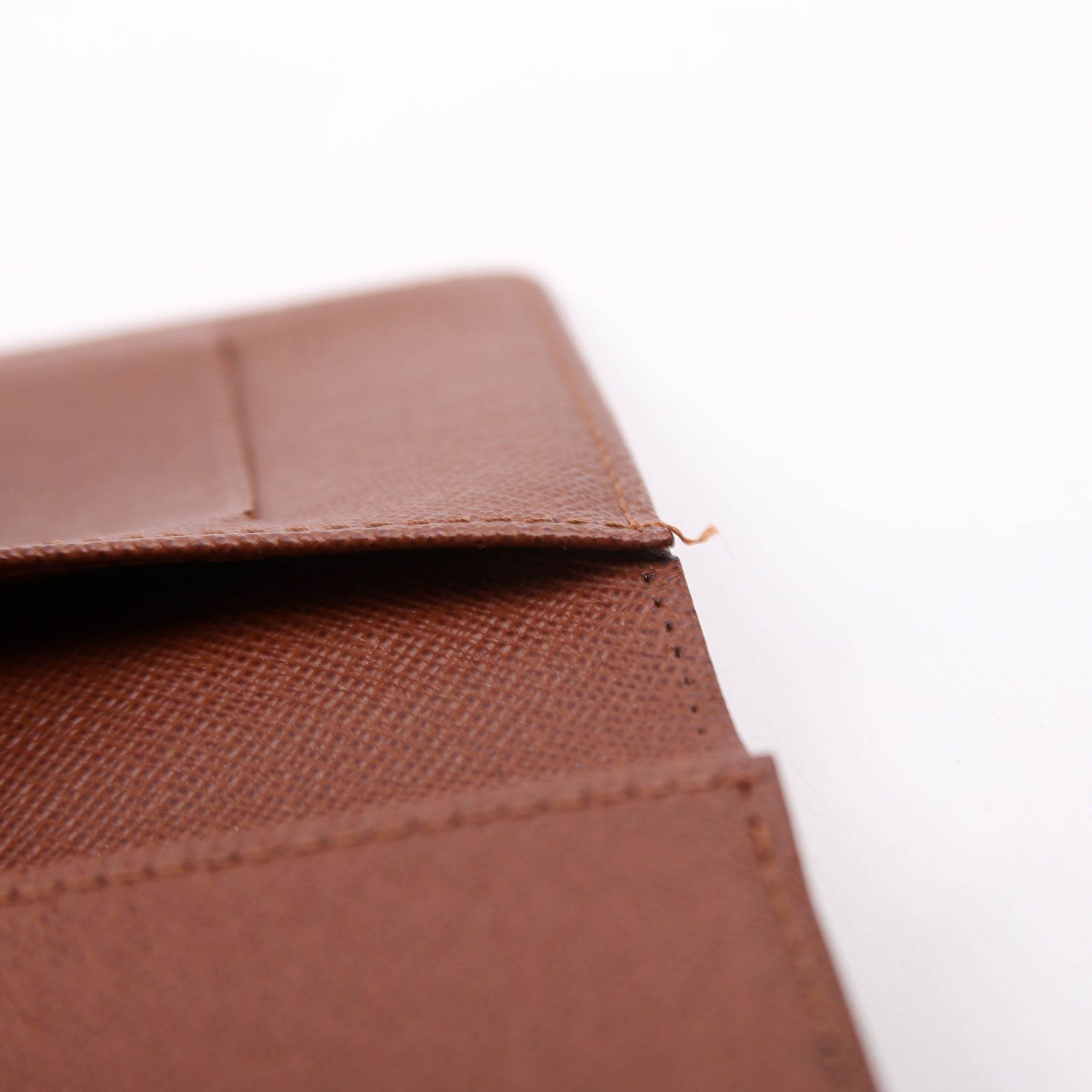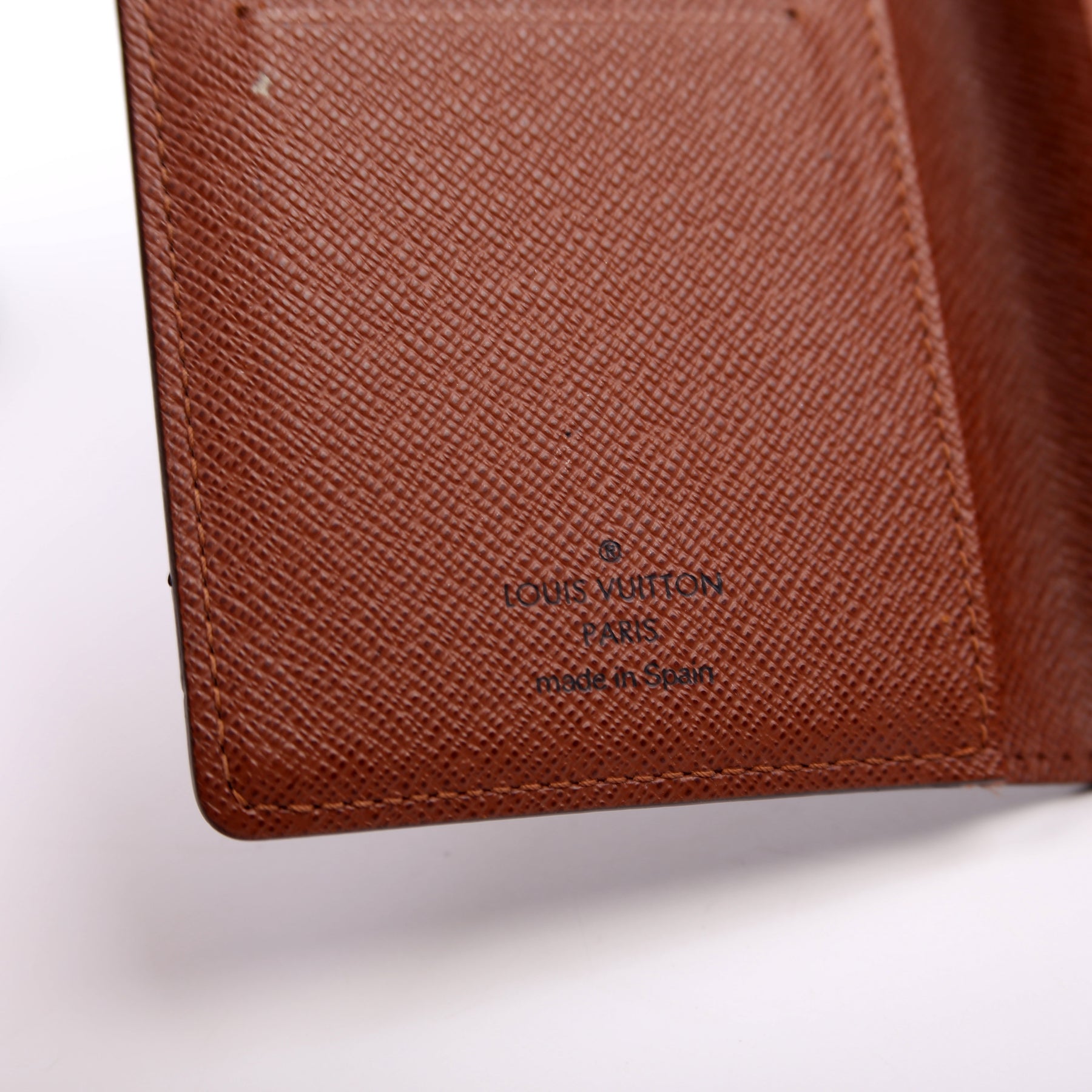 Interior: The interior shows minor wear and staining throughout. The interior features three card slots and two open pockets.