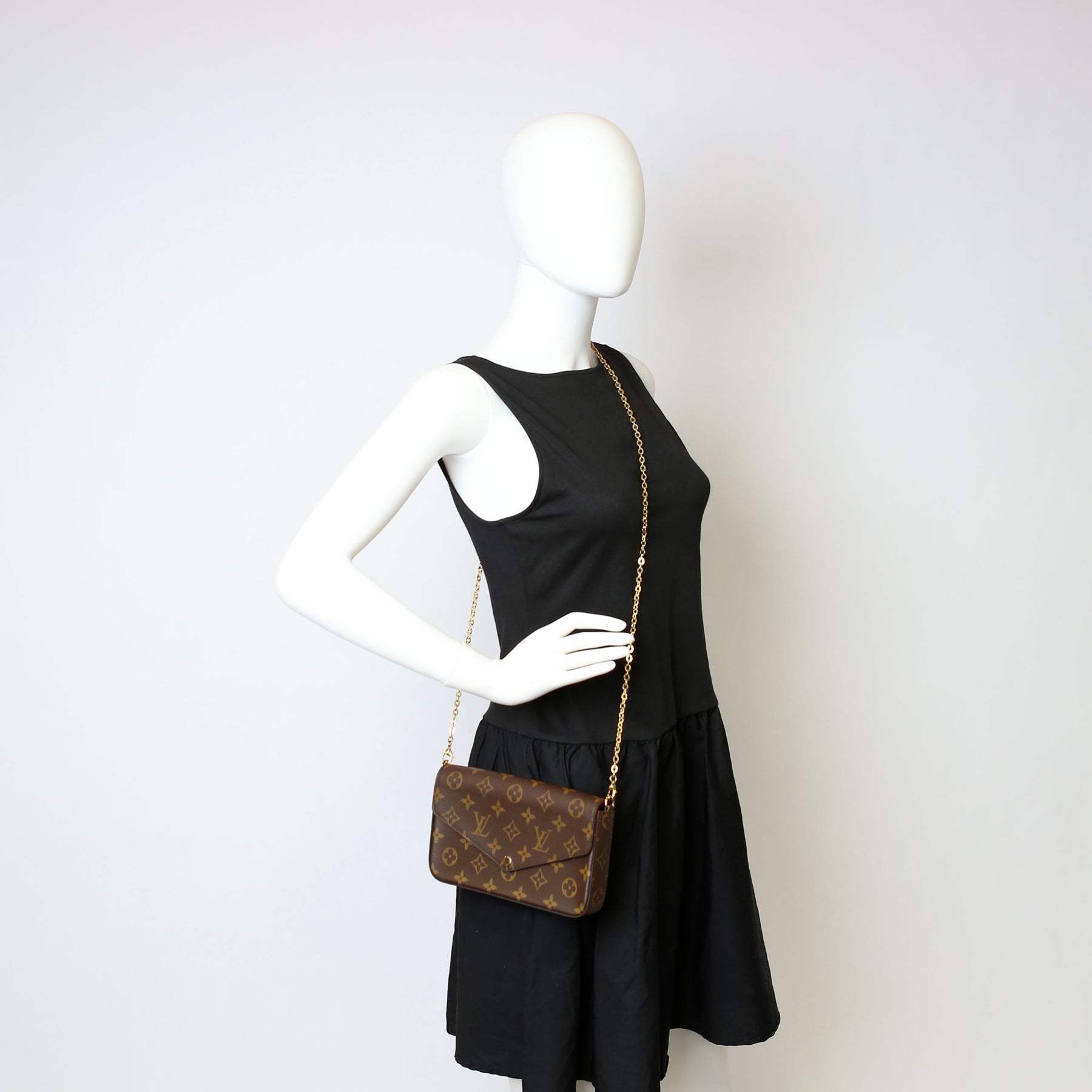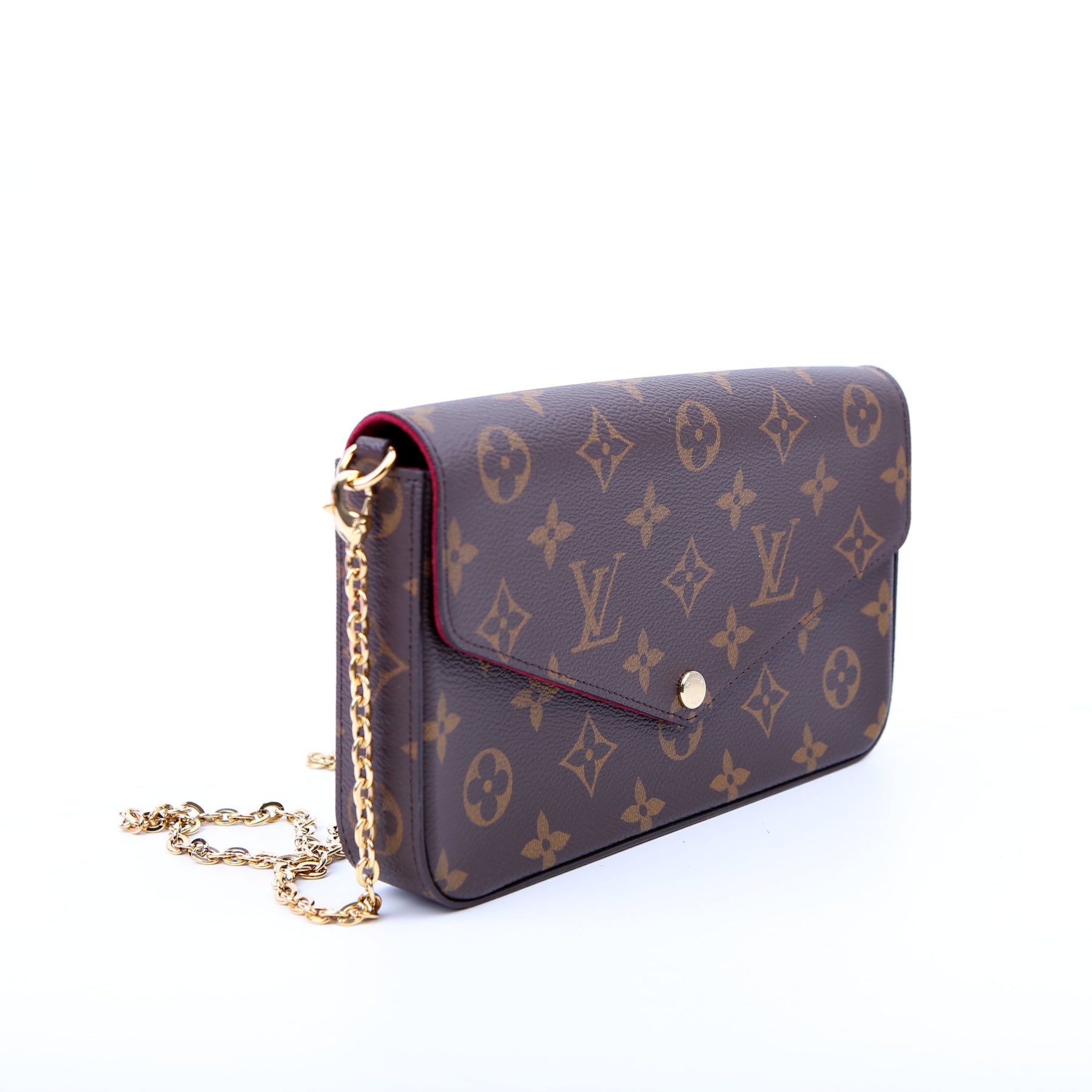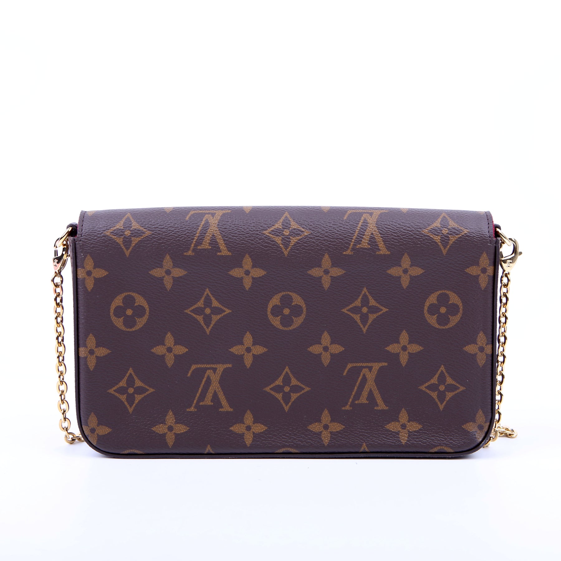 This pre-owned Louis Vuitton Pochette Felicie is guaranteed 100% authentic. The exterior is in the classic Louis Vuitton Monogram coated canvas.
