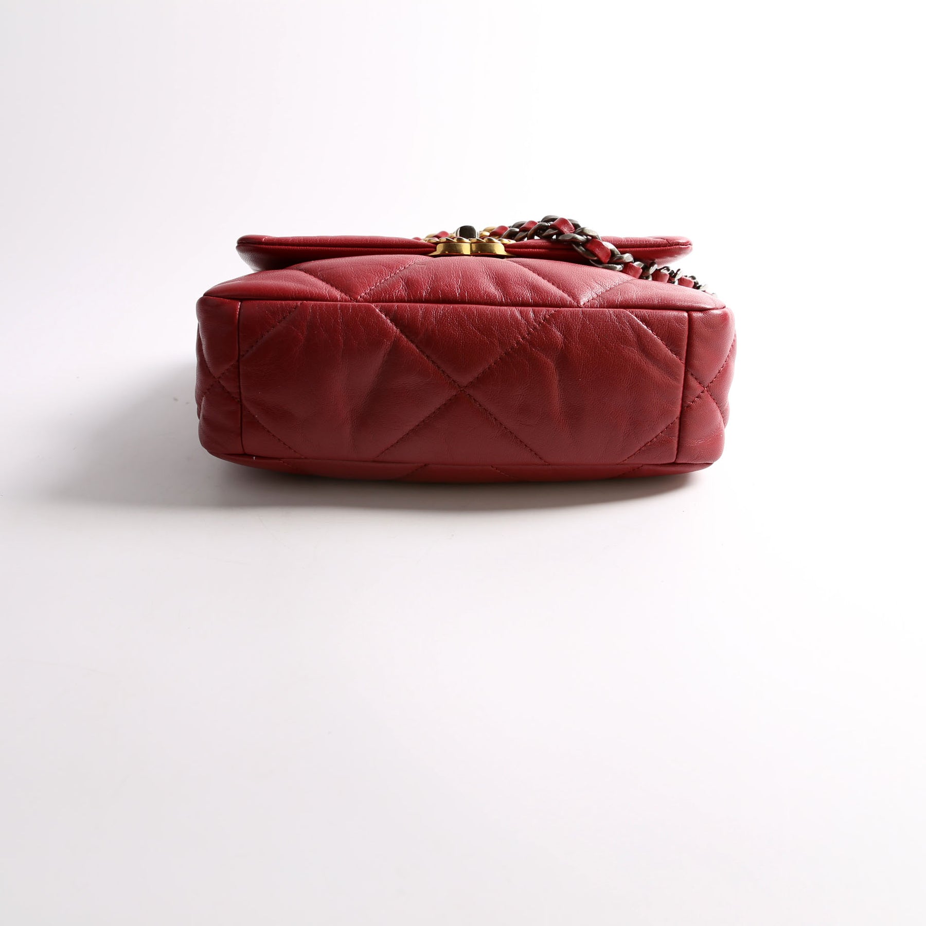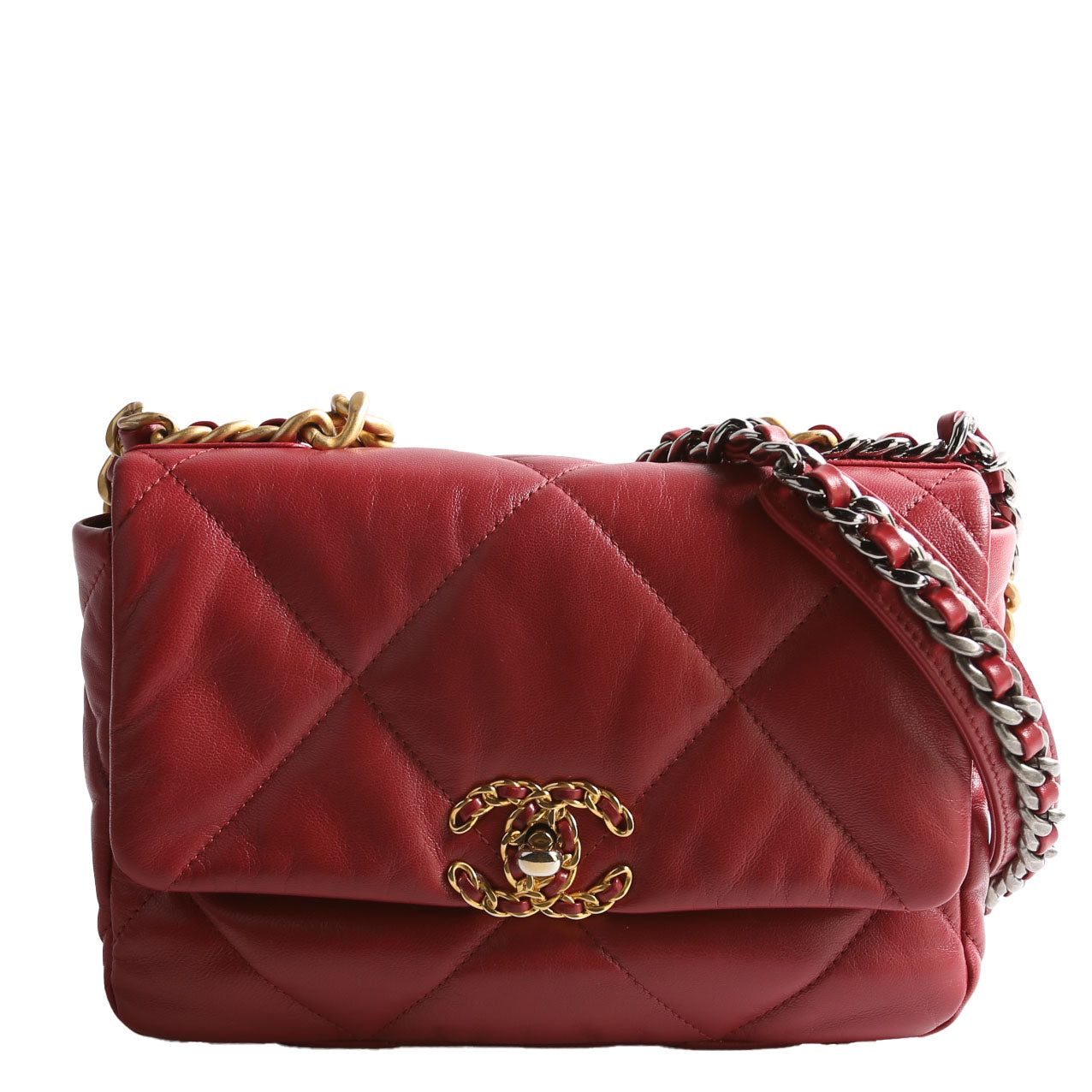 This pre-owned Chanel 19 Medium Flap is guaranteed 100% authentic. The exterior is in the classic Chanel Quilted Goatskin leather.