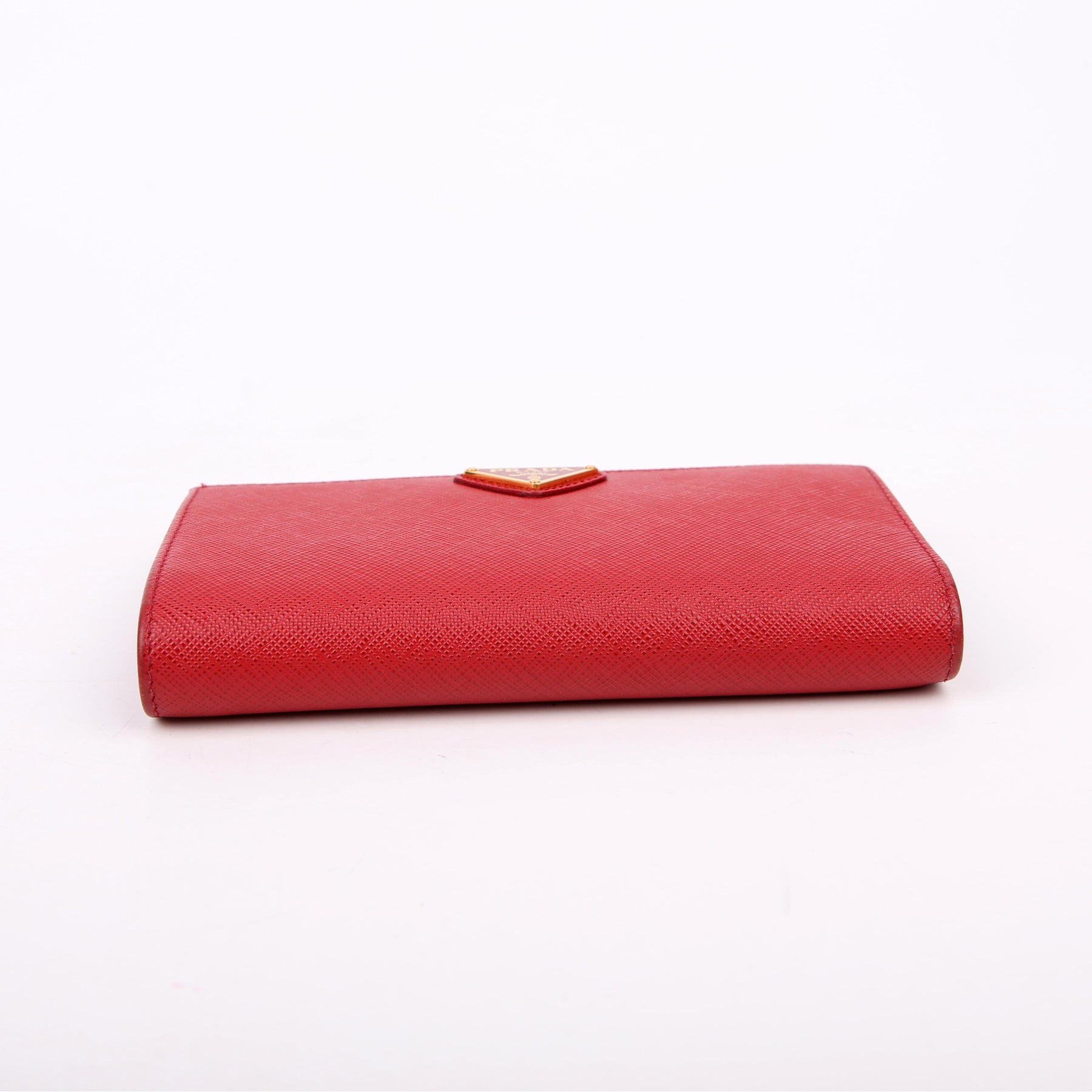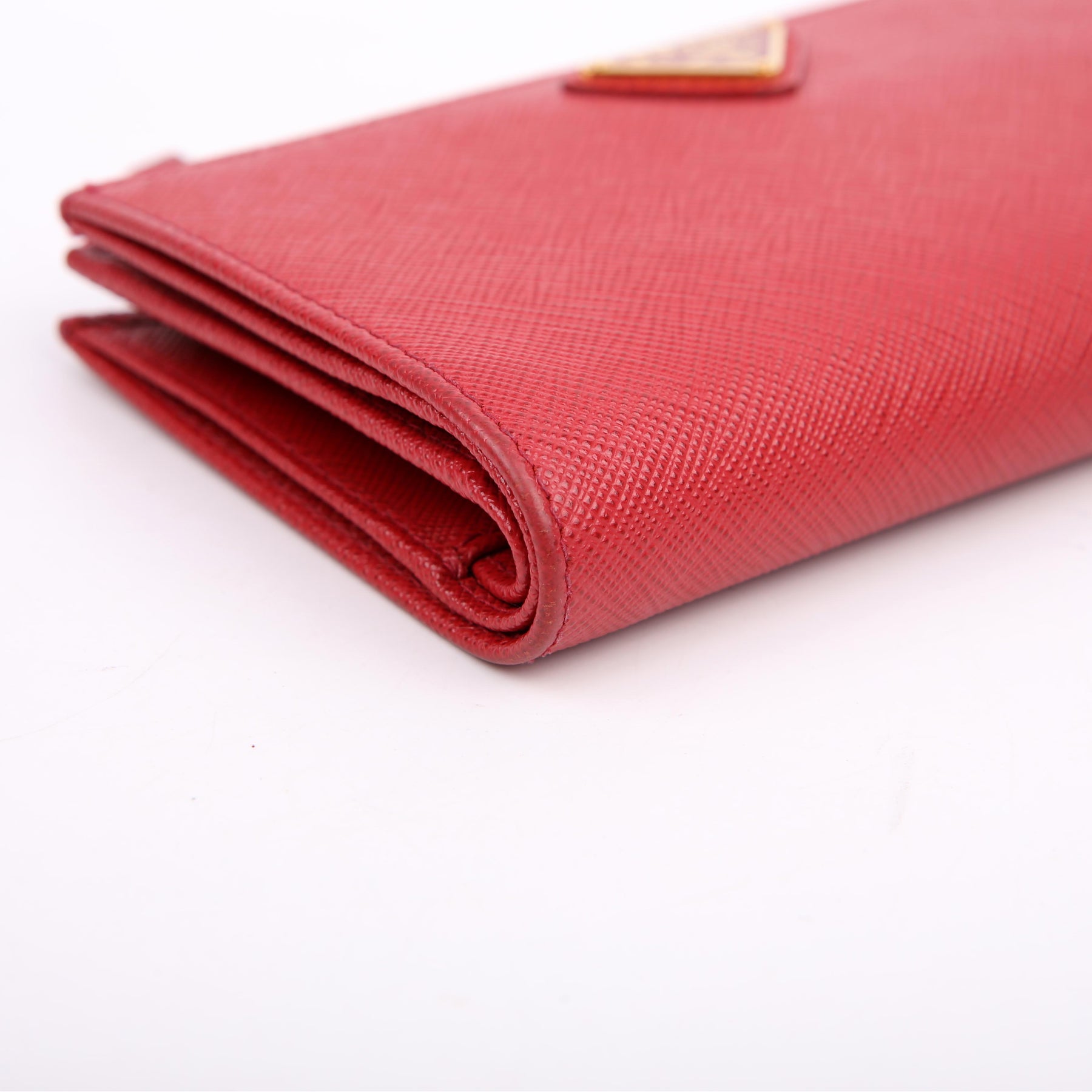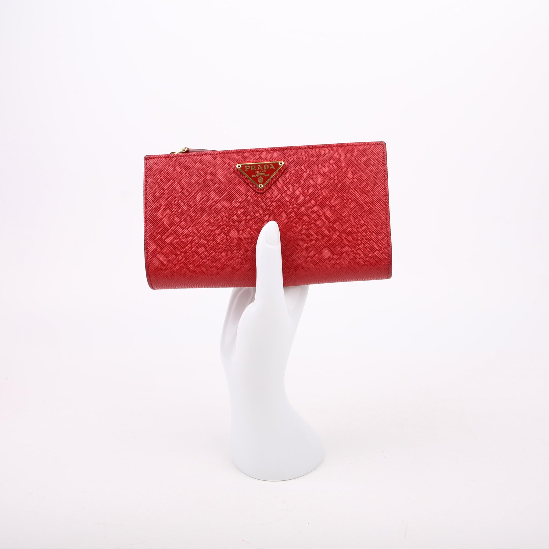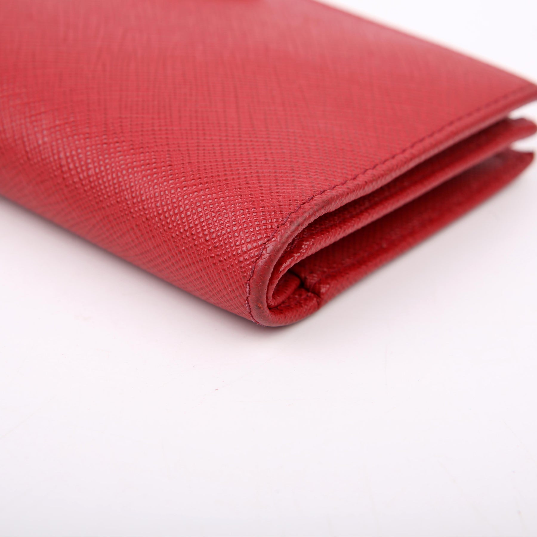 This pre-owned Prada Continental Wallet is guaranteed 100% authentic. The exterior is in the classic Prada Saffiano leather.
