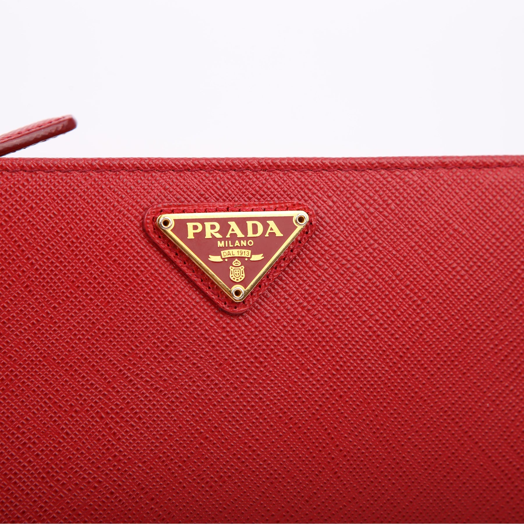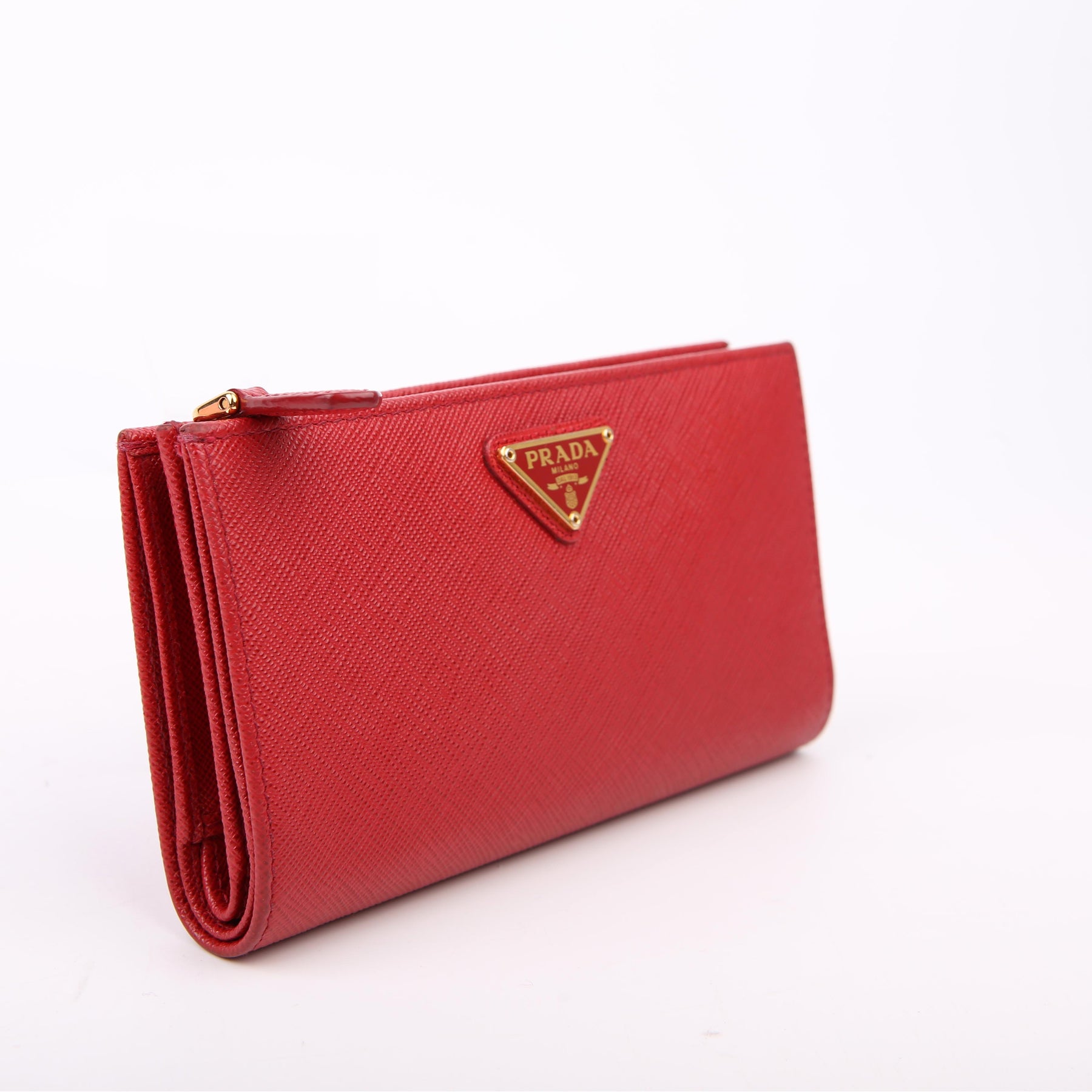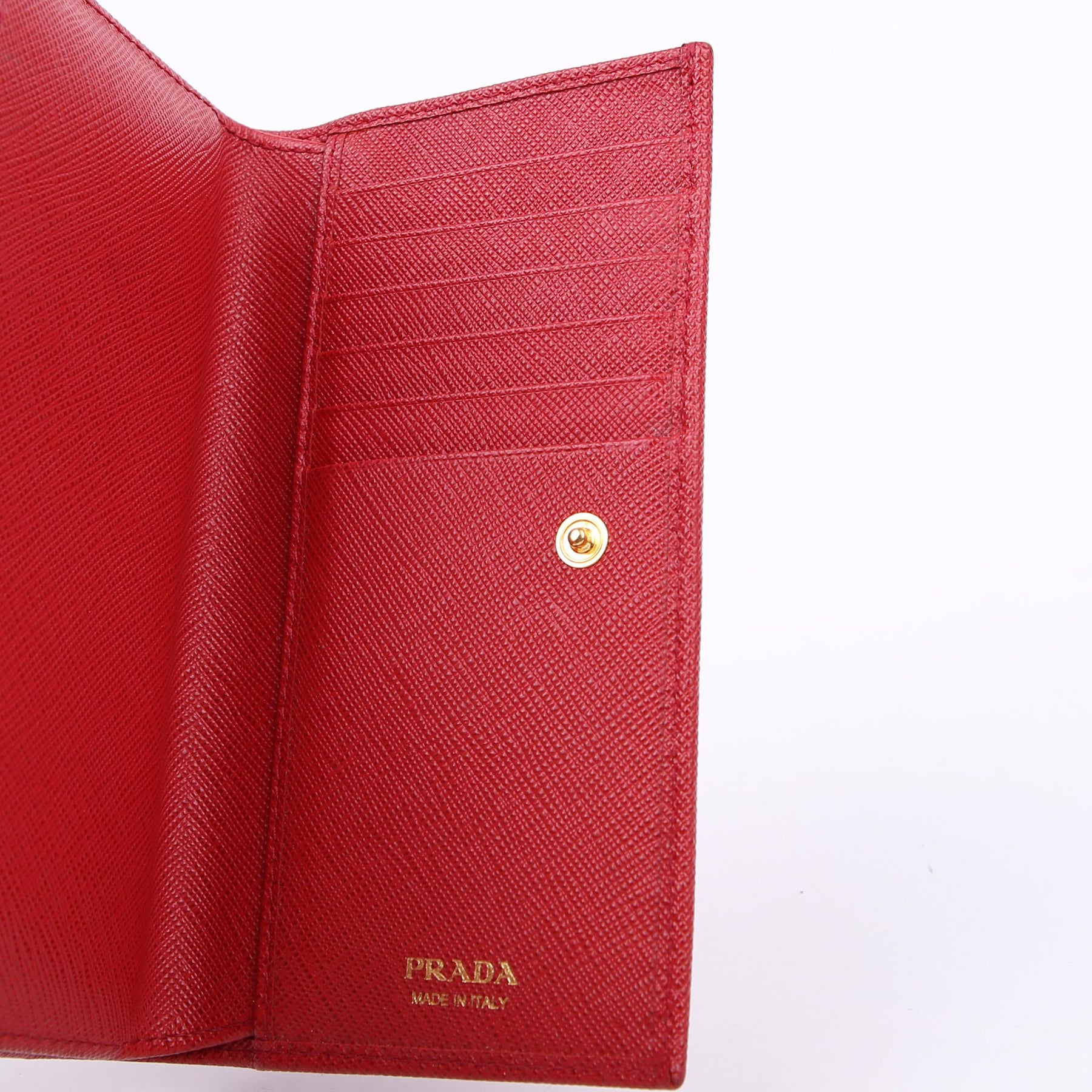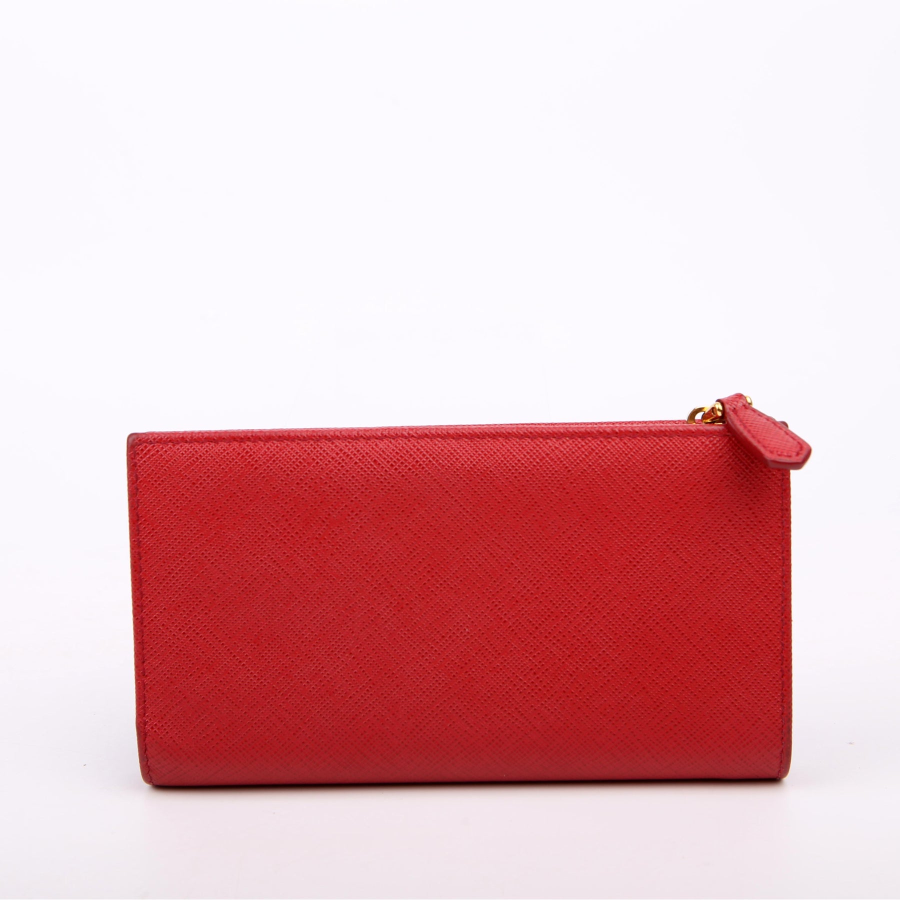 This pre-owned Prada Continental Wallet is guaranteed 100% authentic. The exterior is in the classic Prada Saffiano leather.