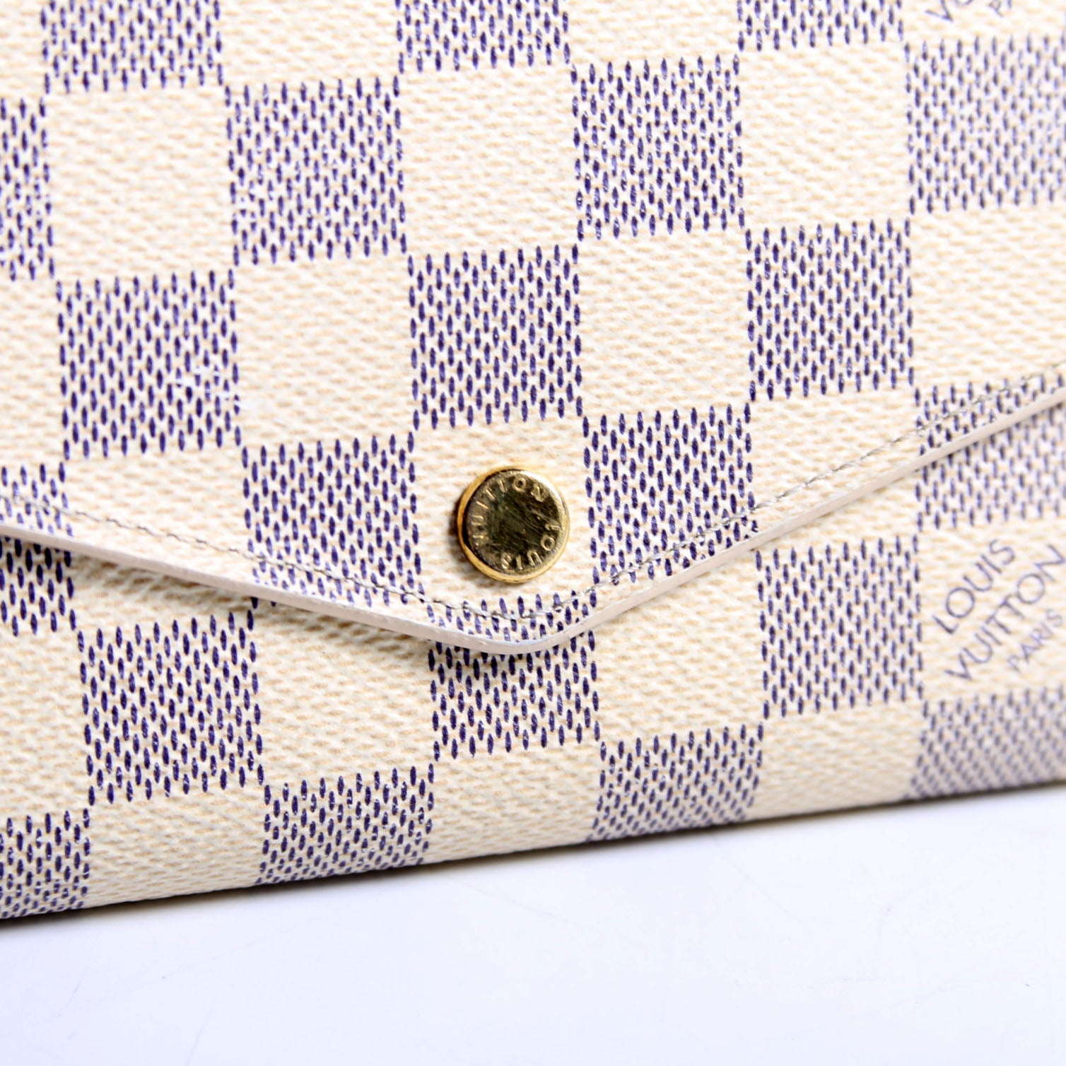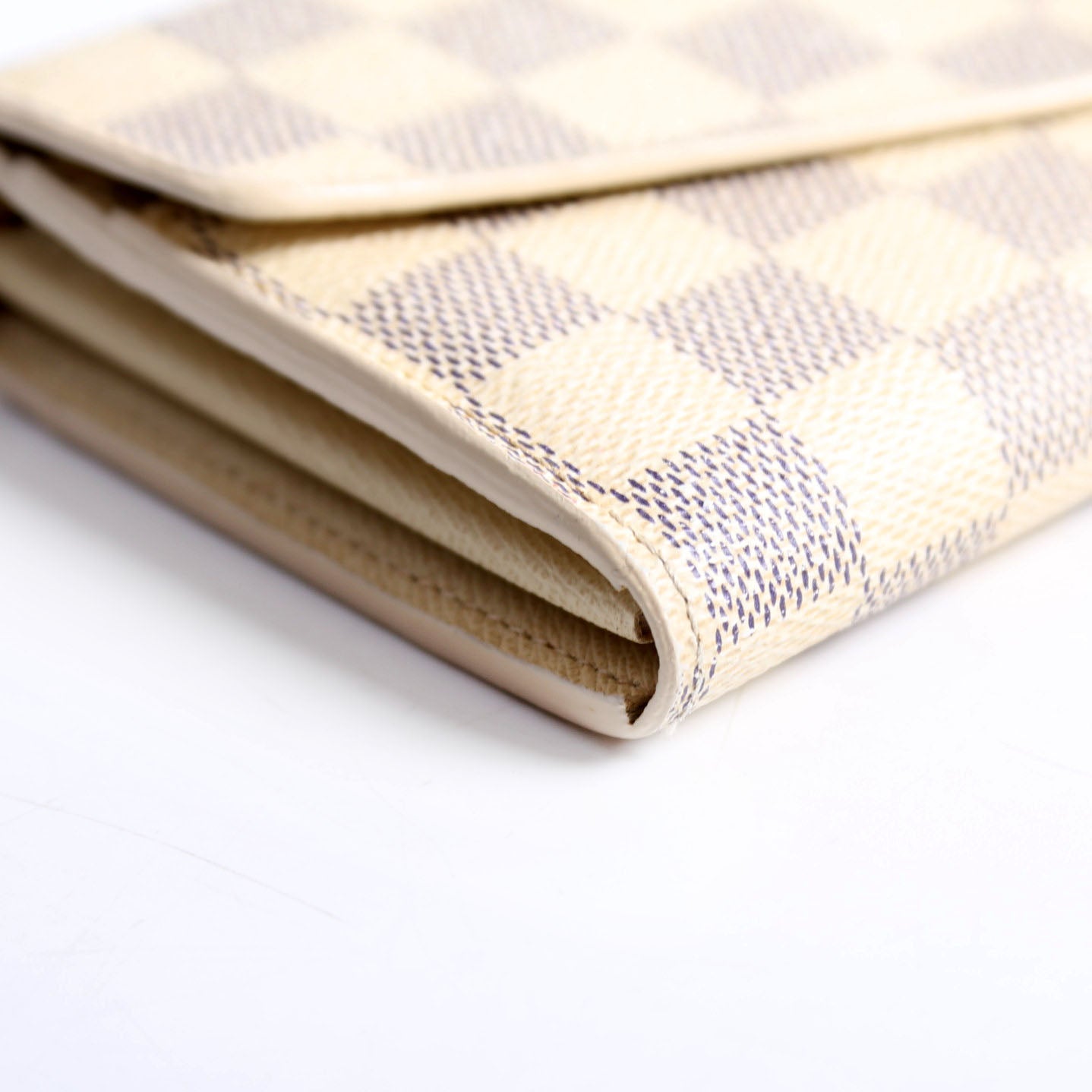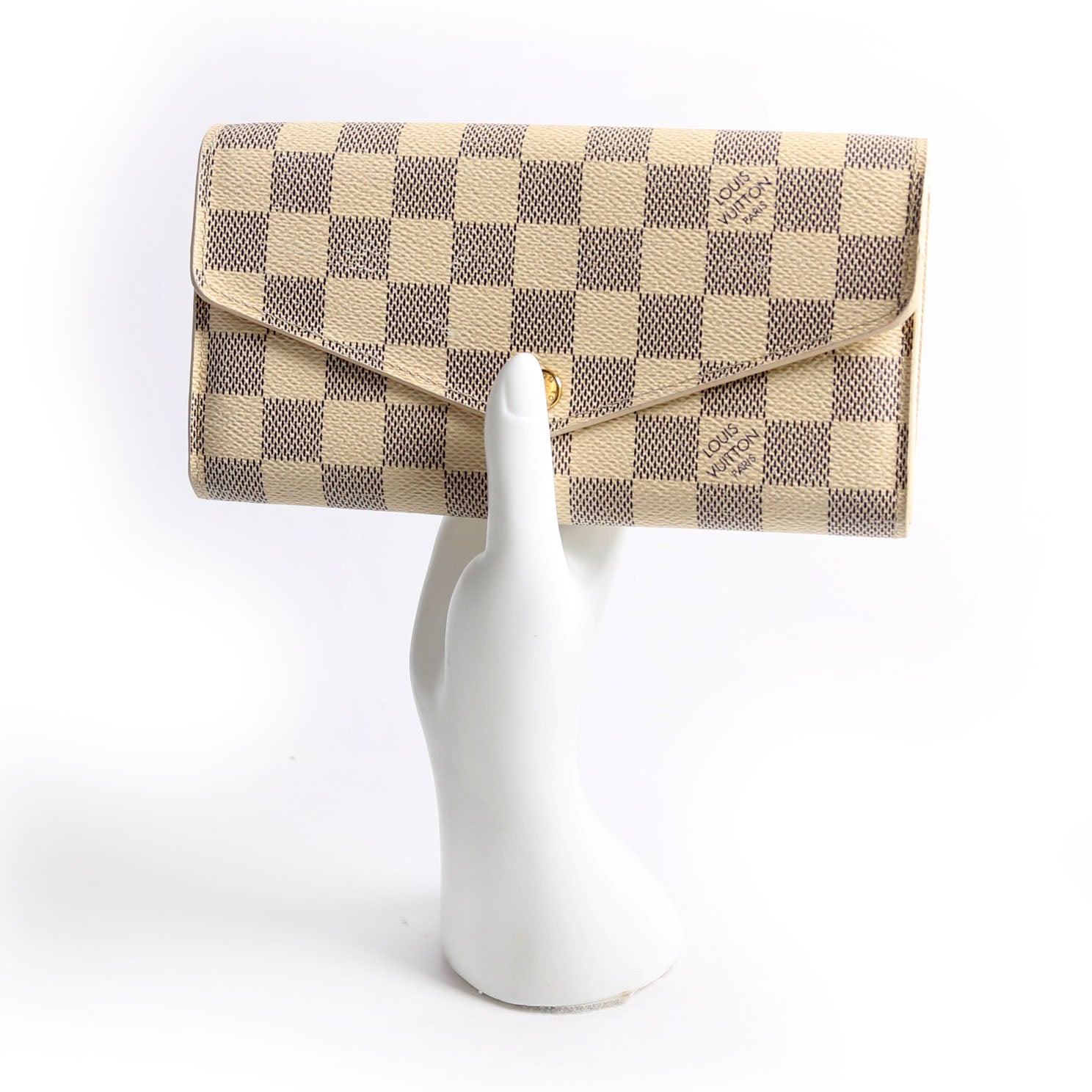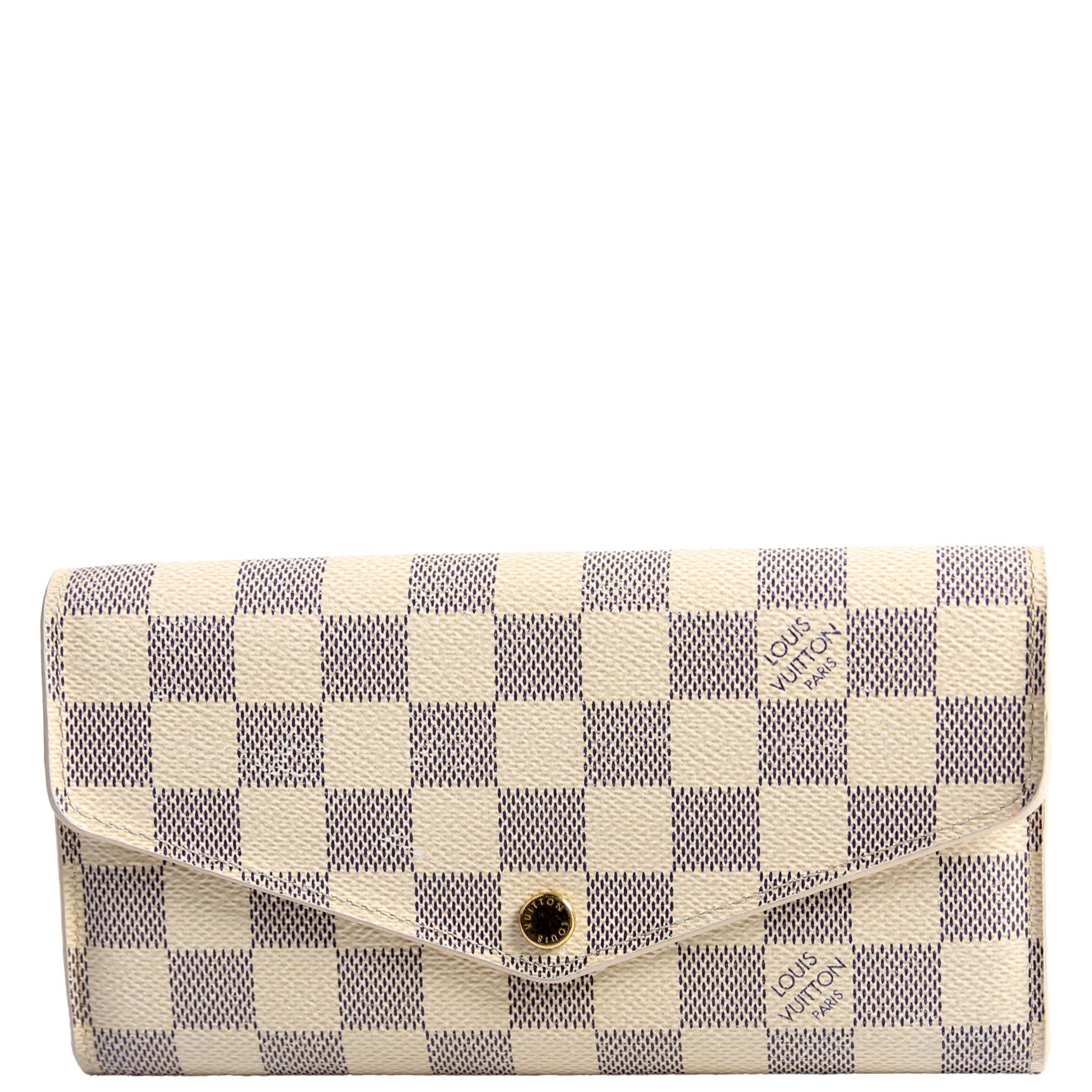 This pre-owned Louis Vuitton Sarah Wallet is guaranteed 100% authentic. The exterior is in the classic Louis Vuitton Damier Azur coated canvas.