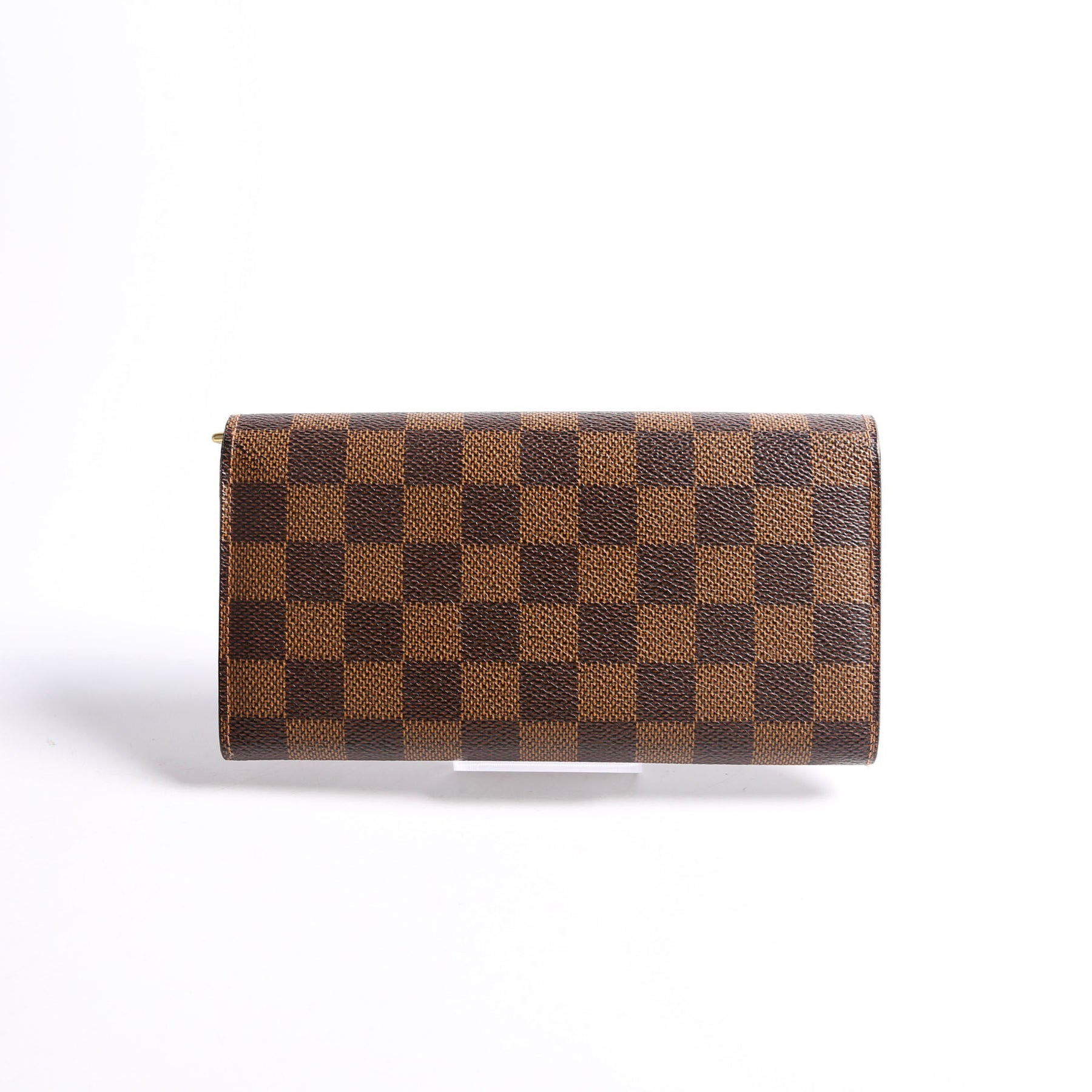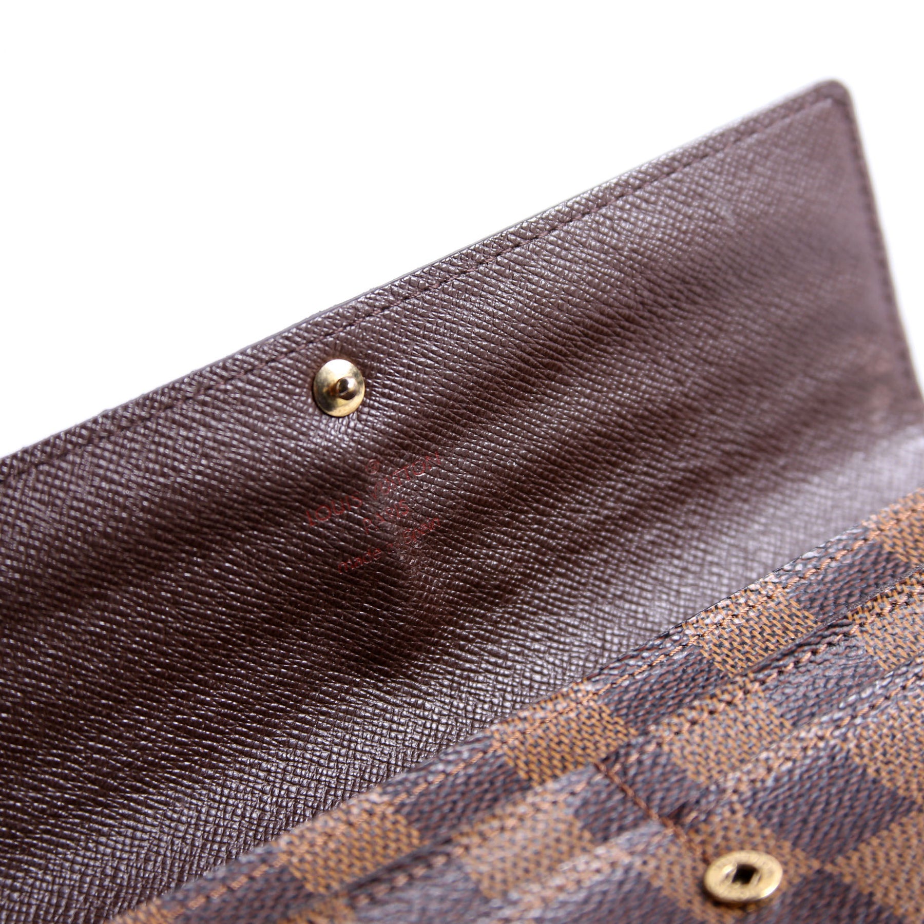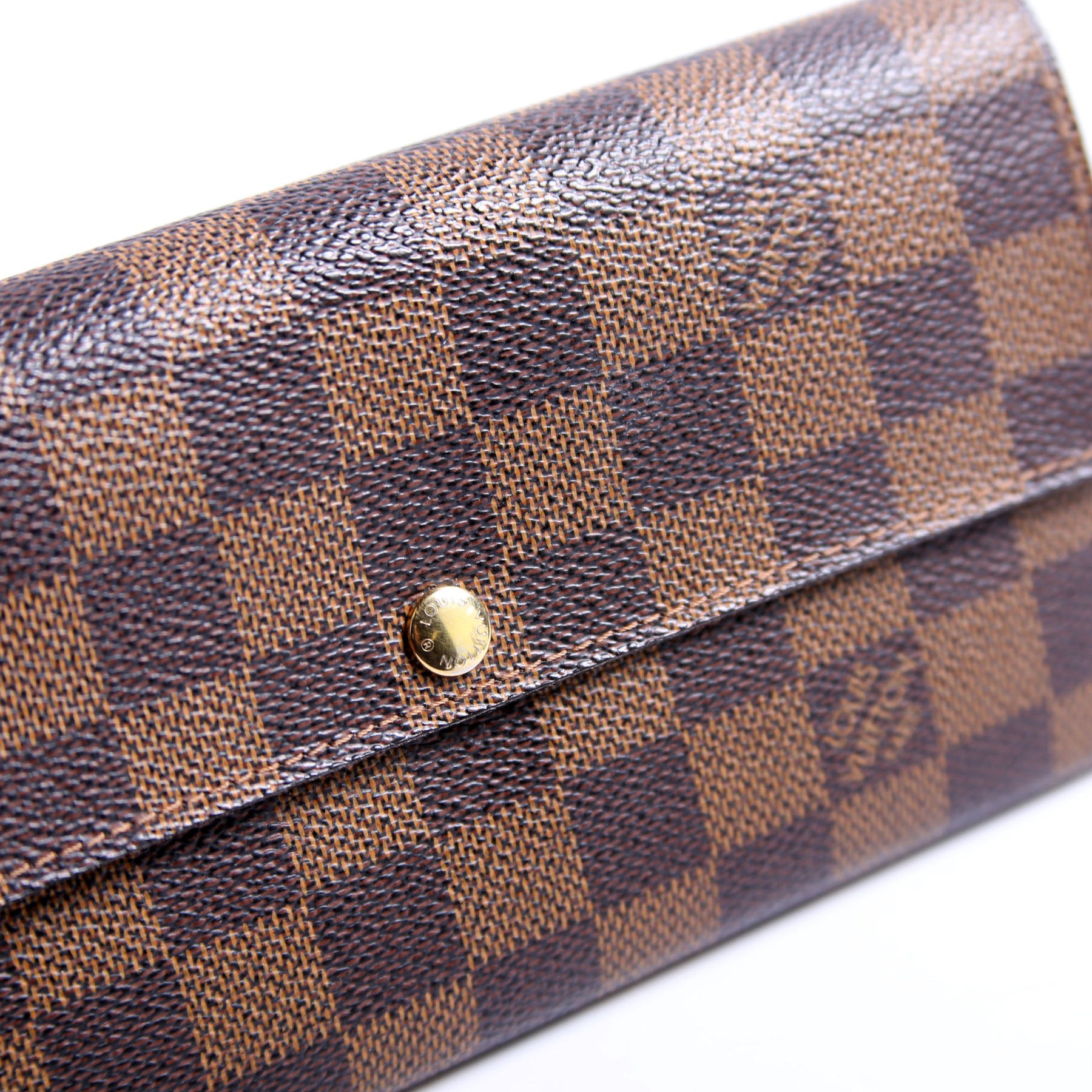 This pre-owned Louis Vuitton Sarah Wallet is guaranteed 100% authentic. The exterior is in the classic Louis Vuitton Damier Ebene coated canvas.