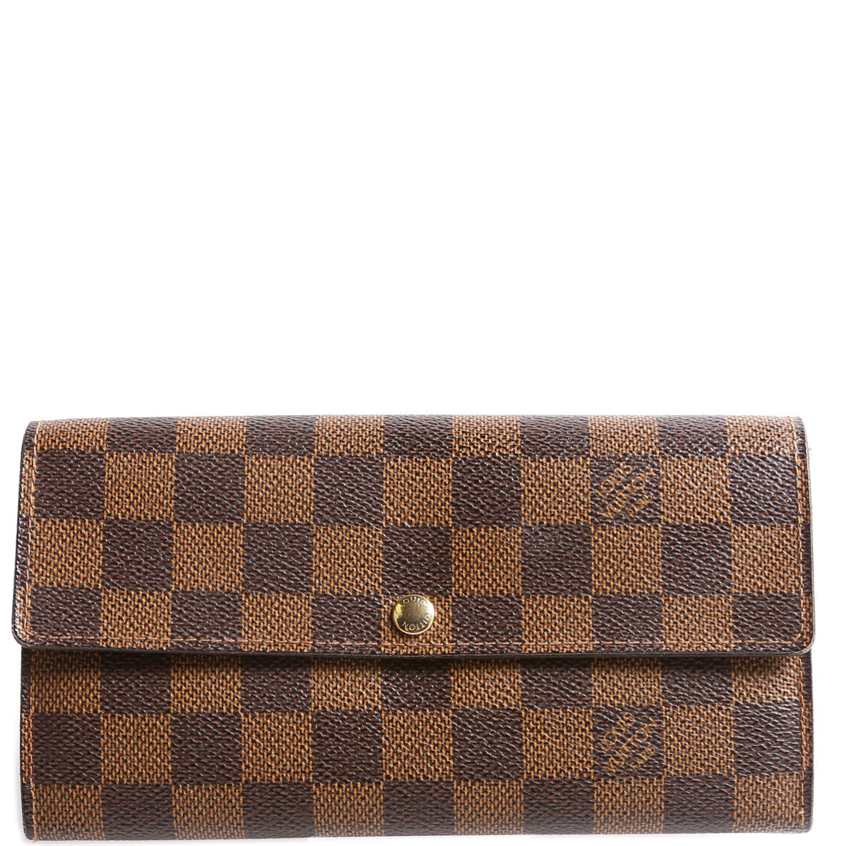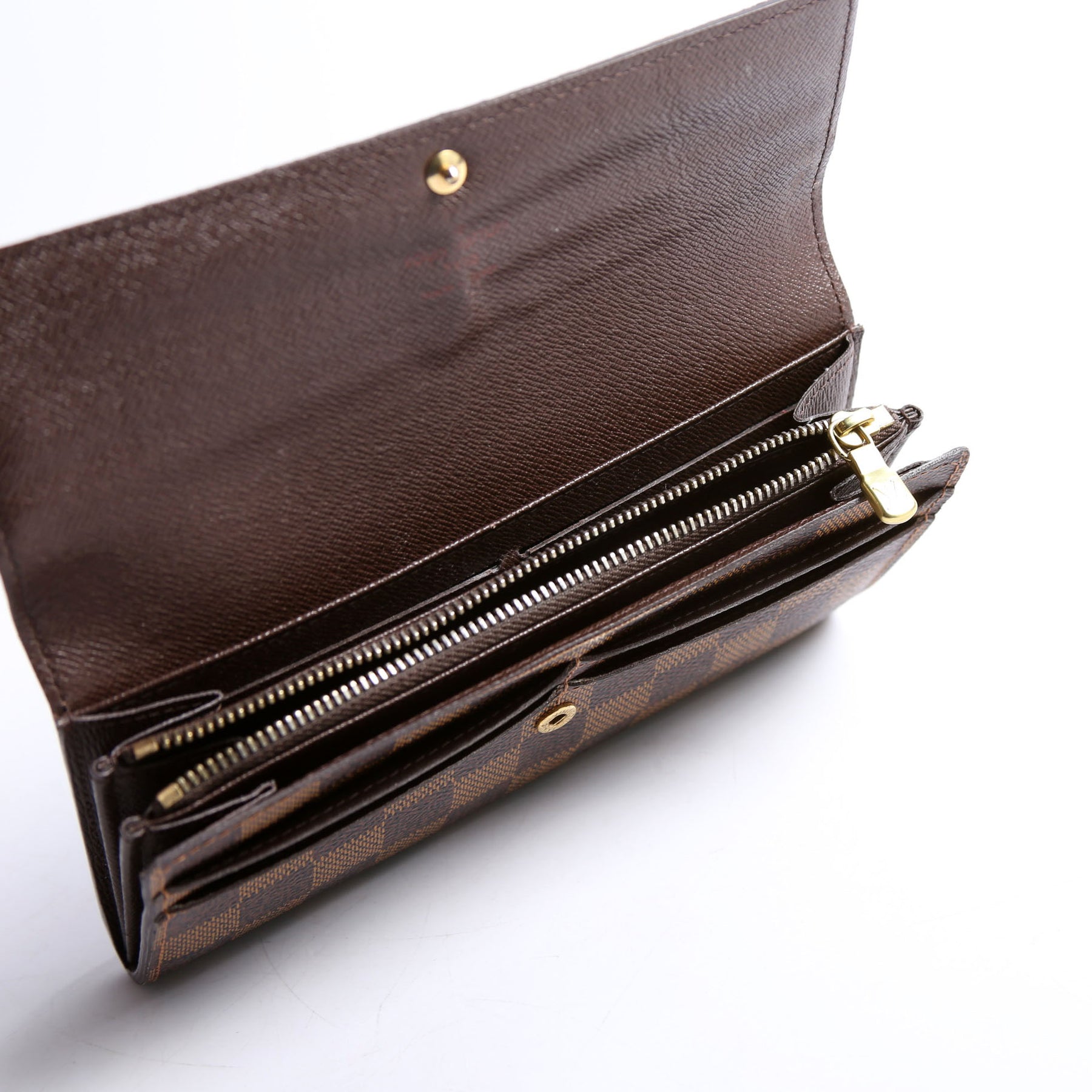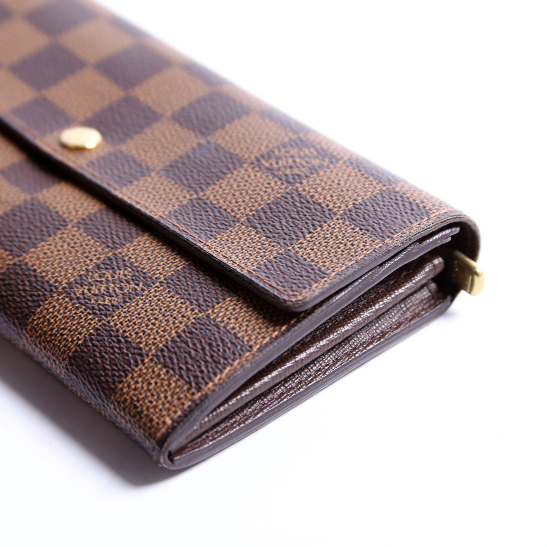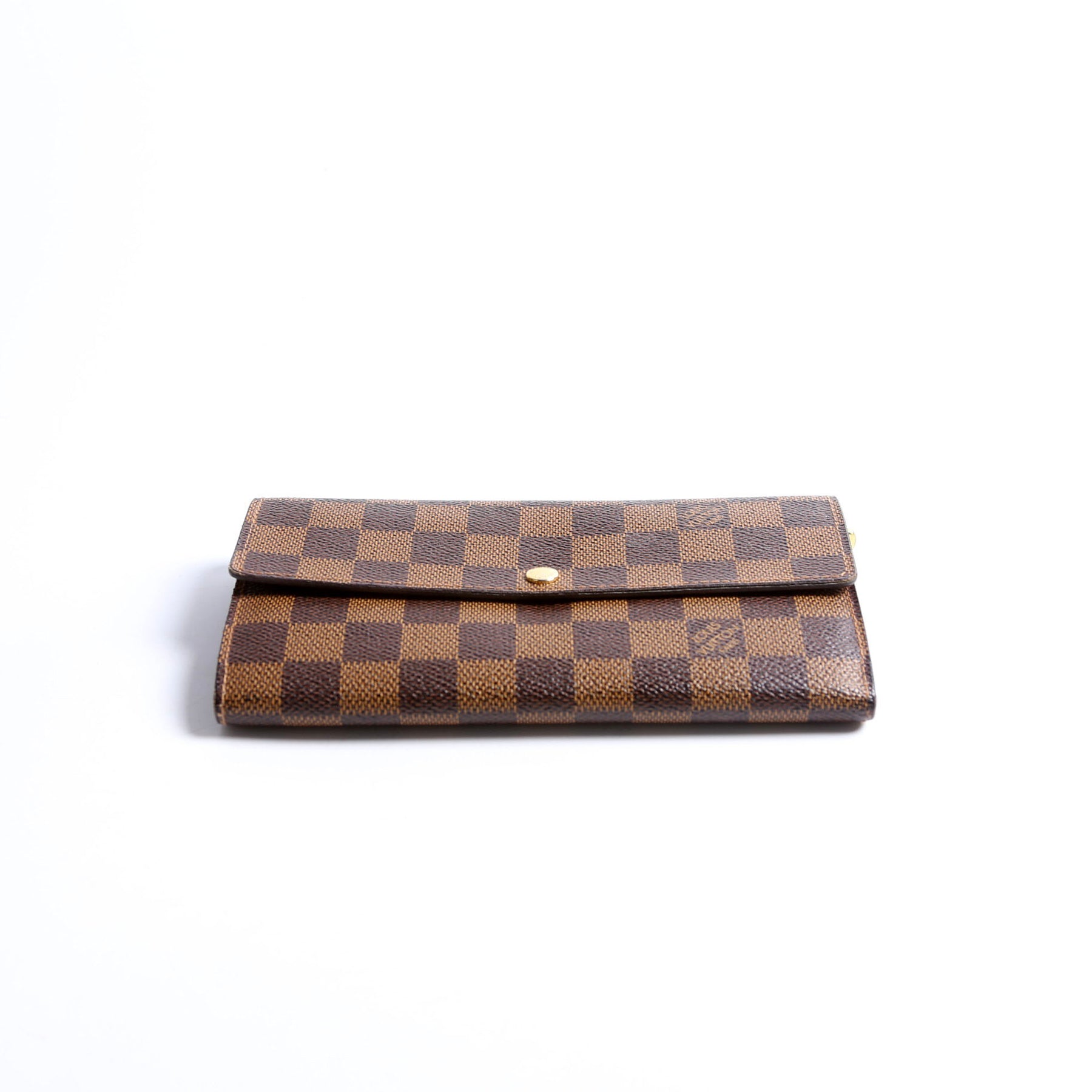 This pre-owned Louis Vuitton Sarah Wallet is guaranteed 100% authentic. The exterior is in the classic Louis Vuitton Damier Ebene coated canvas.