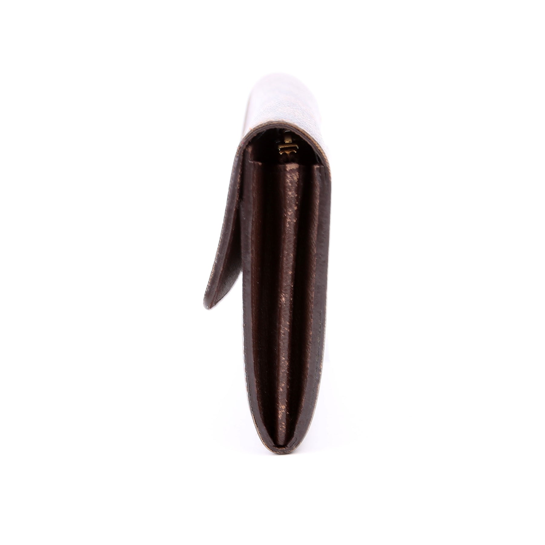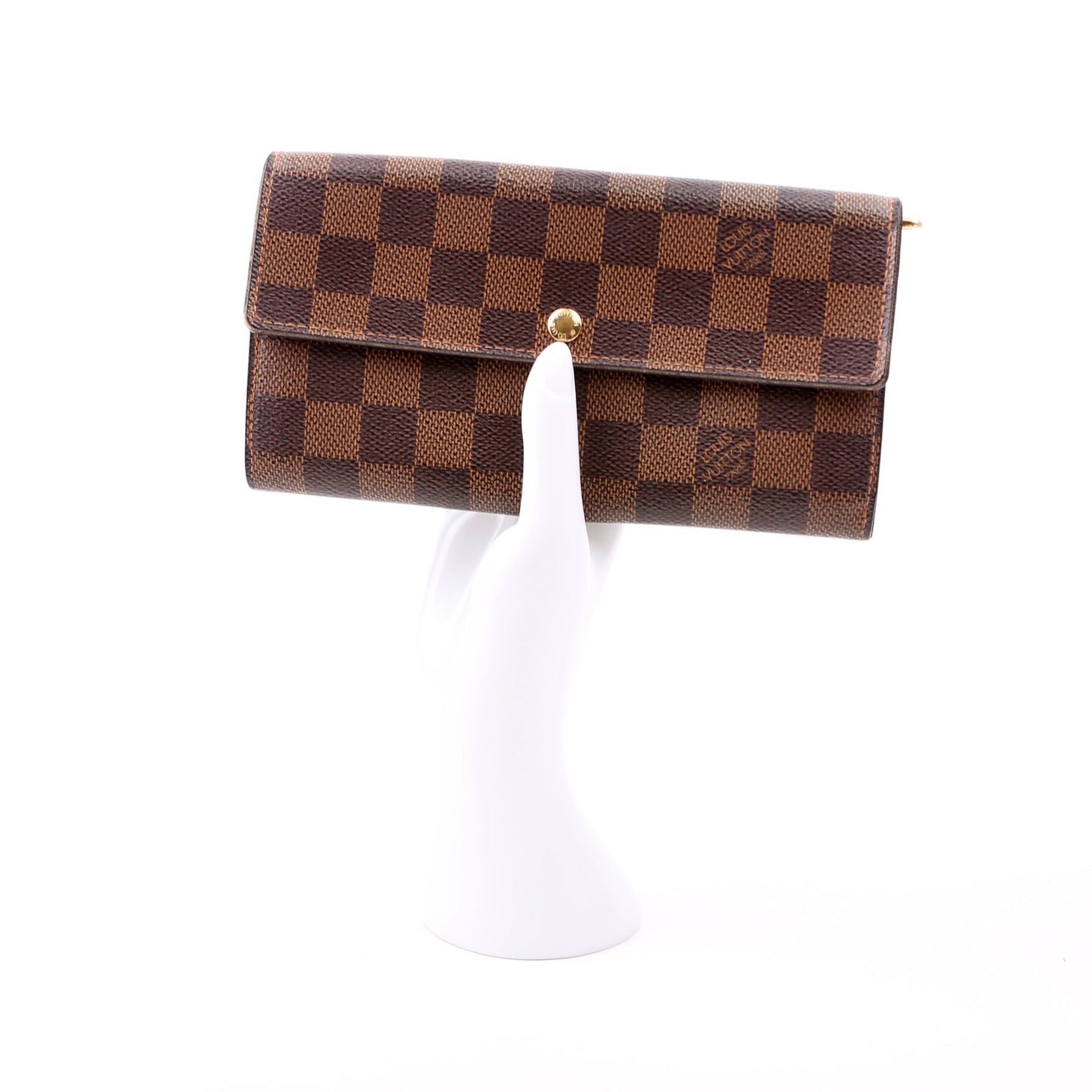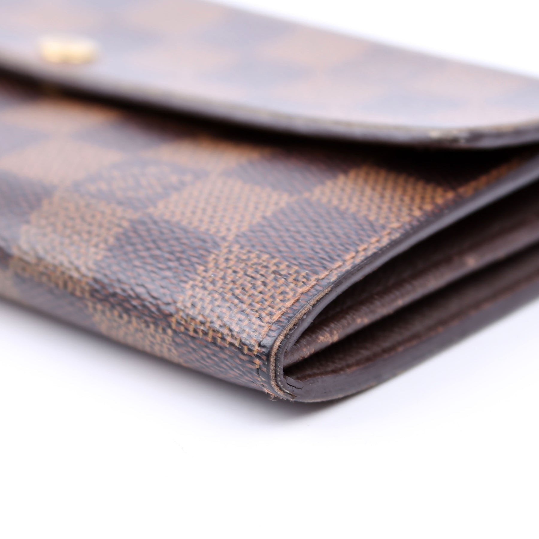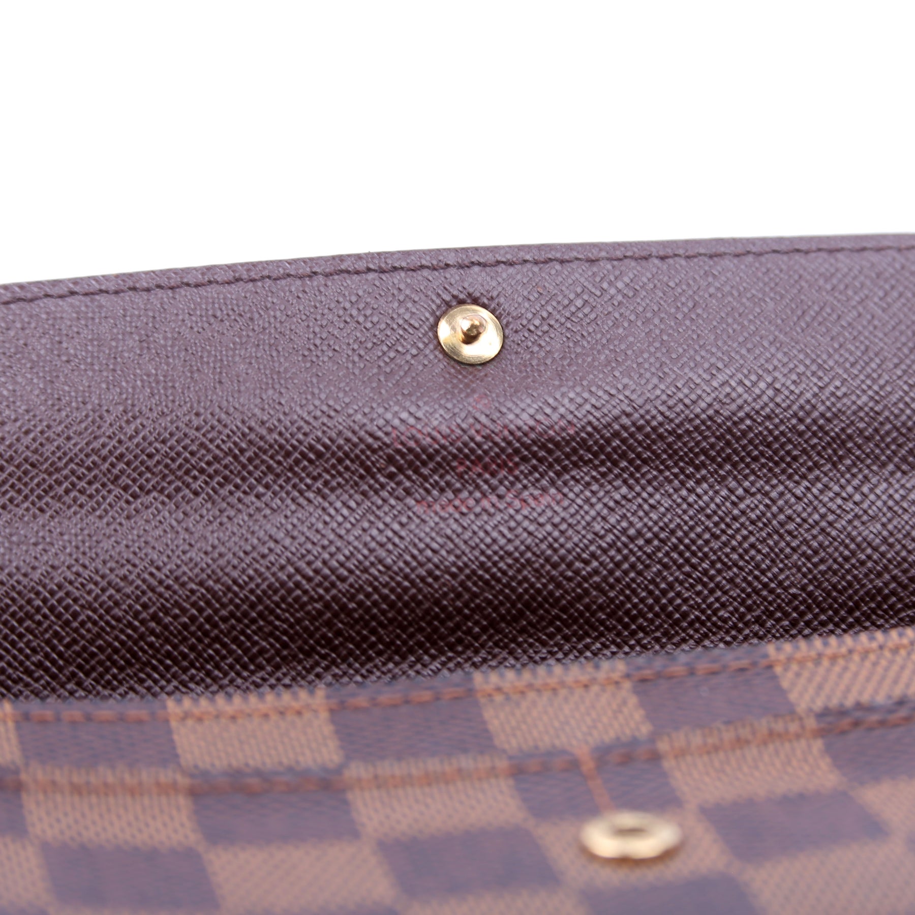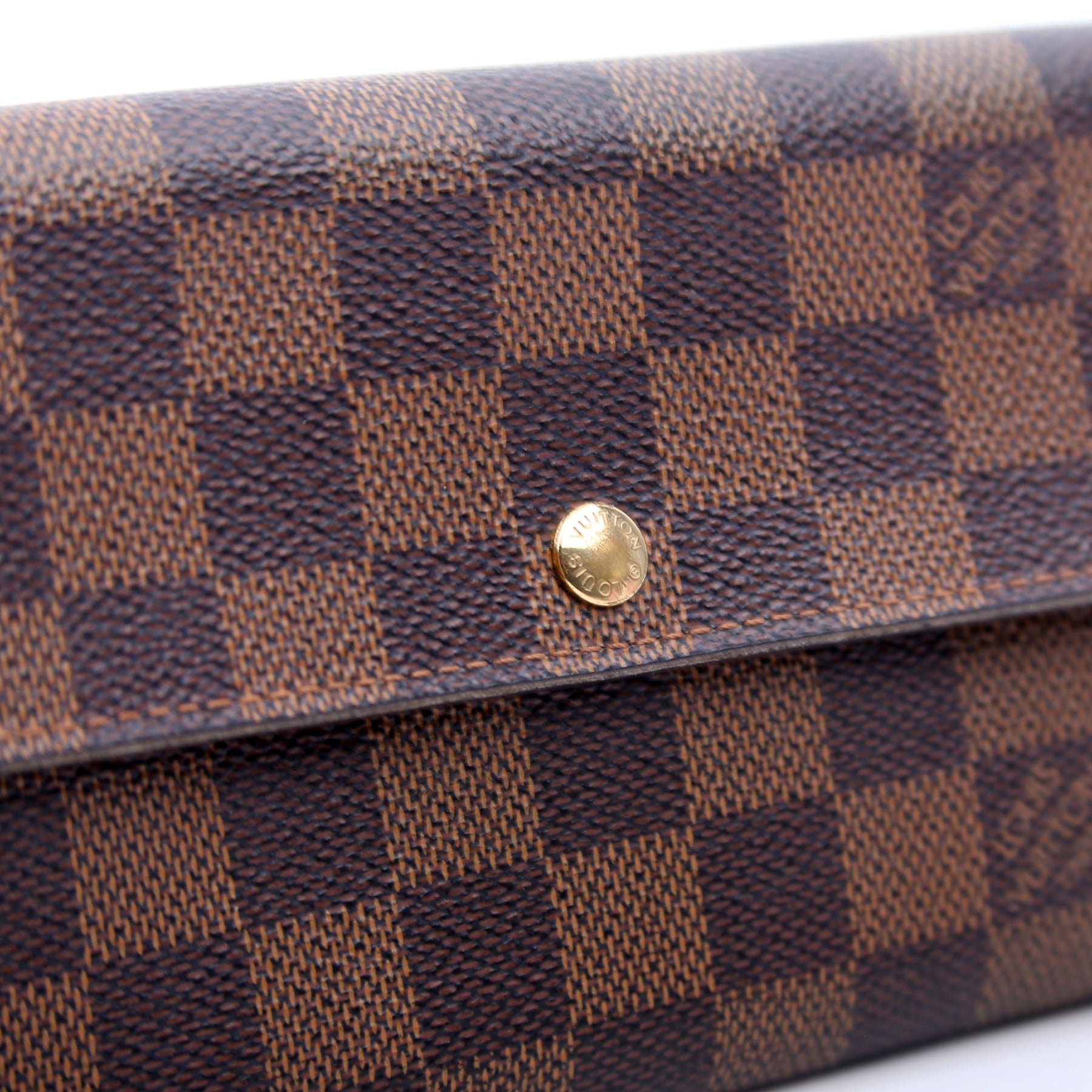 This pre-owned Louis Vuitton Sarah Wallet is guaranteed 100% authentic. The exterior is in the classic Louis Vuitton Damier Ebene coated canvas.
