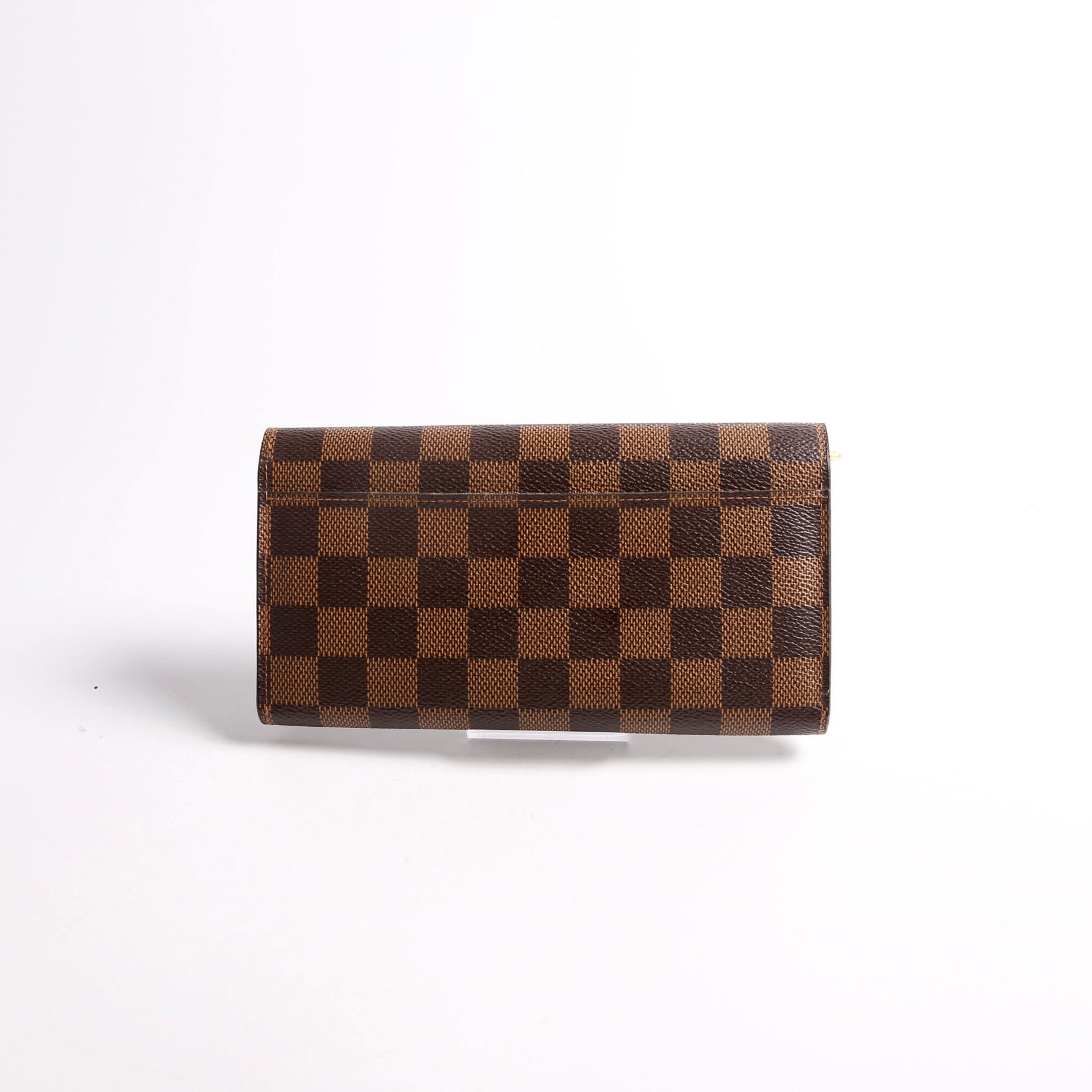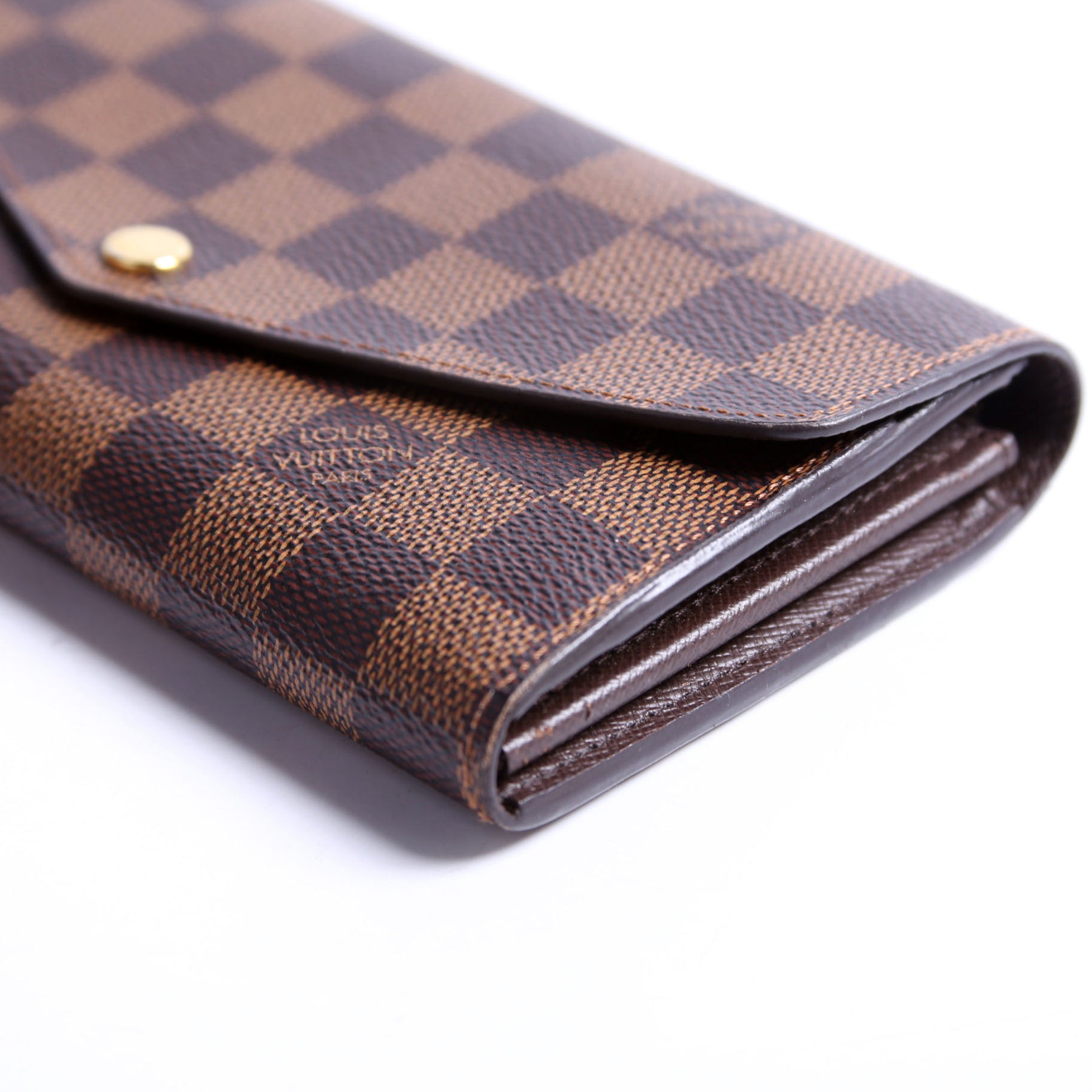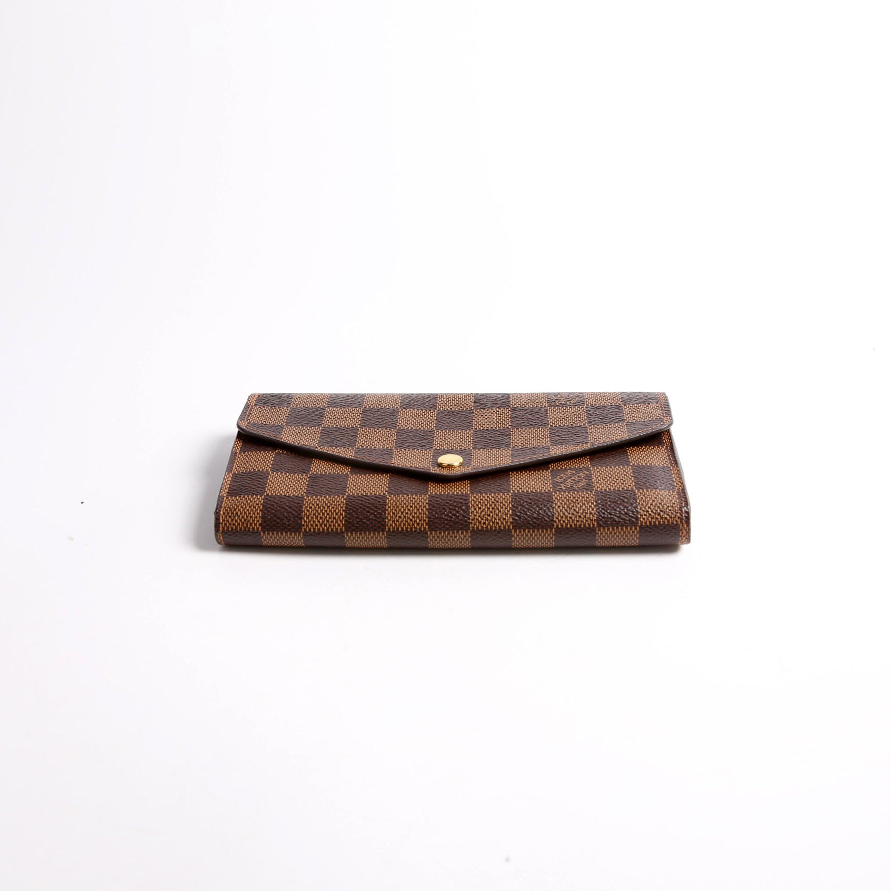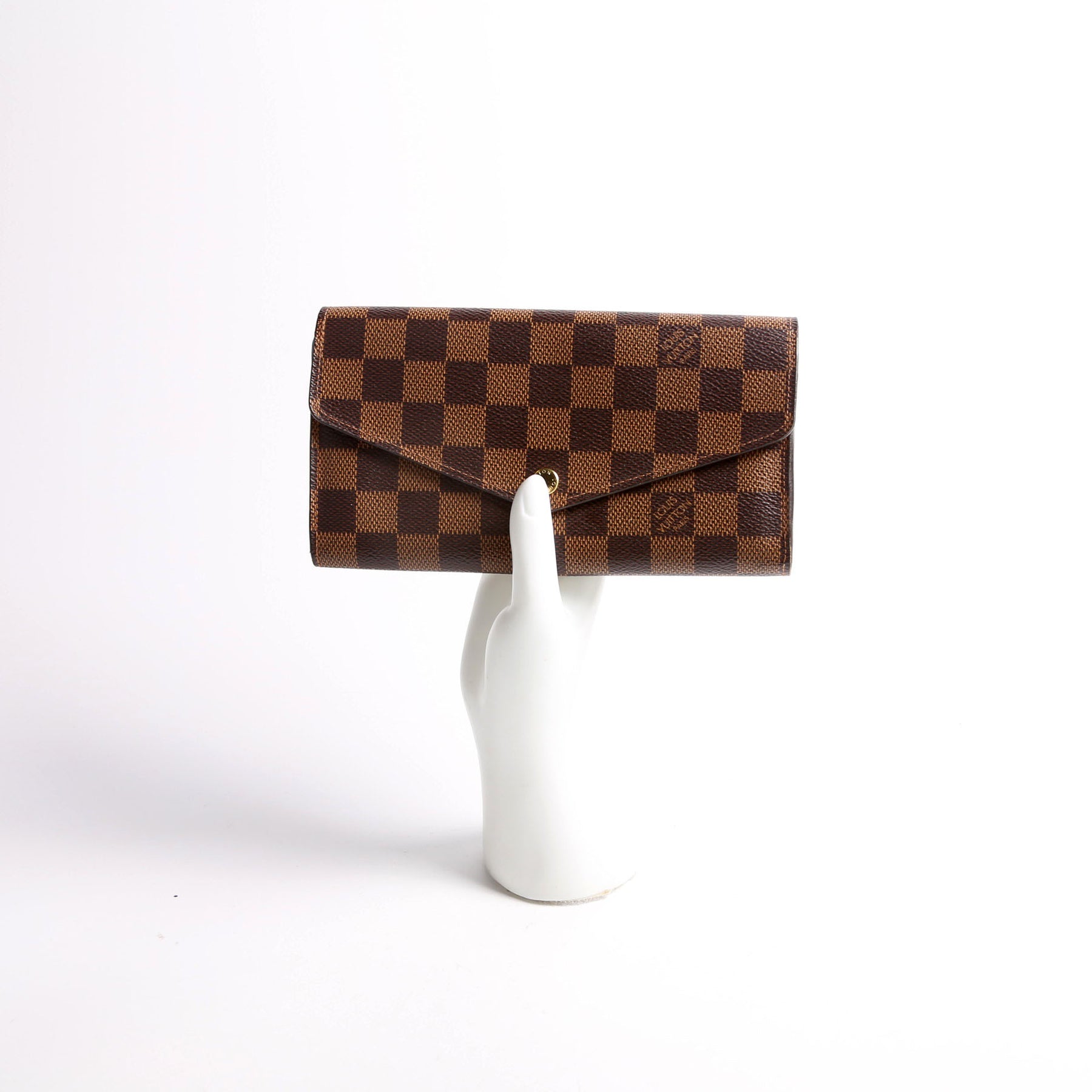 This pre-owned Louis Vuitton Sarah Wallet Newer is guaranteed 100% authentic. The exterior is in the classic Louis Vuitton Damier Ebene coated canvas.