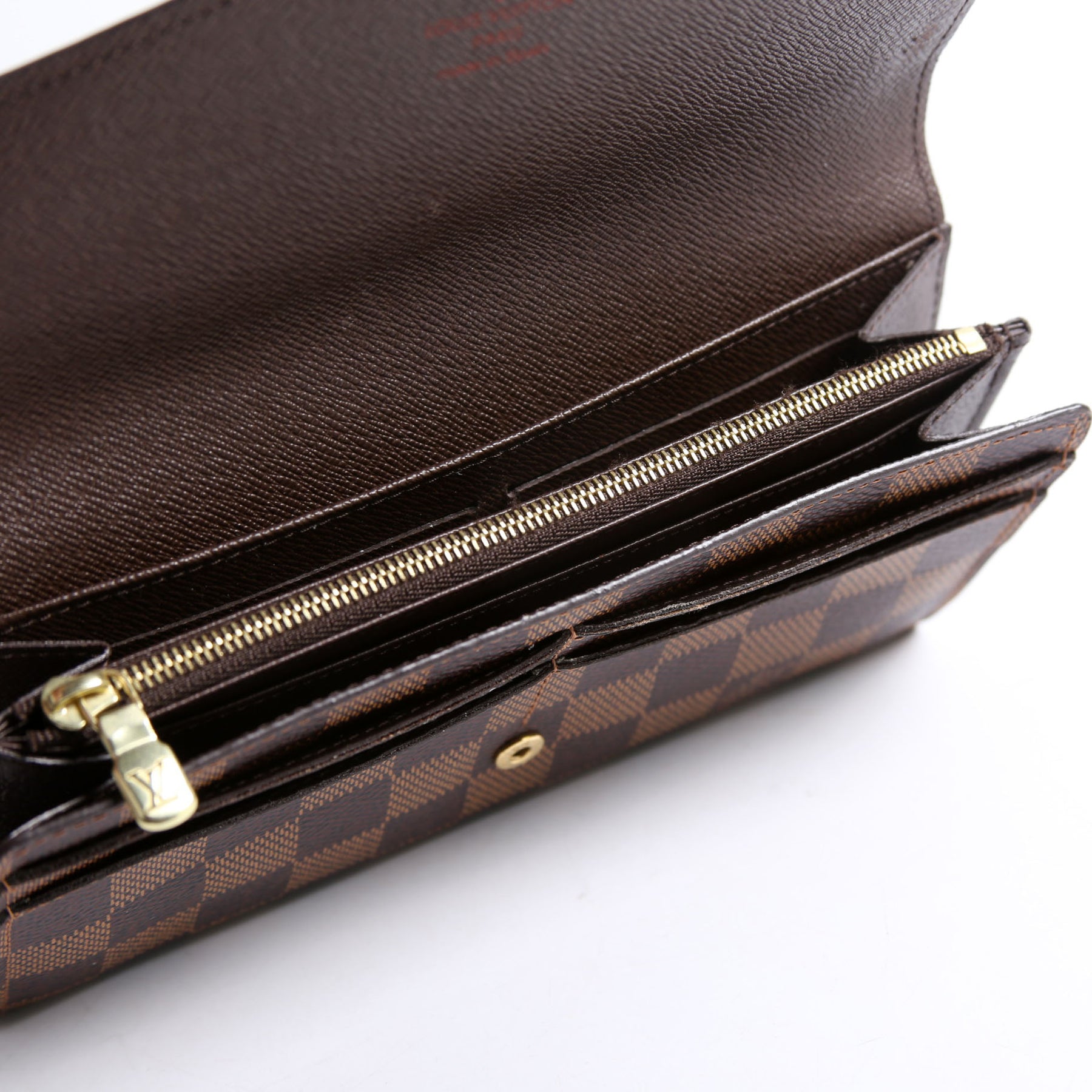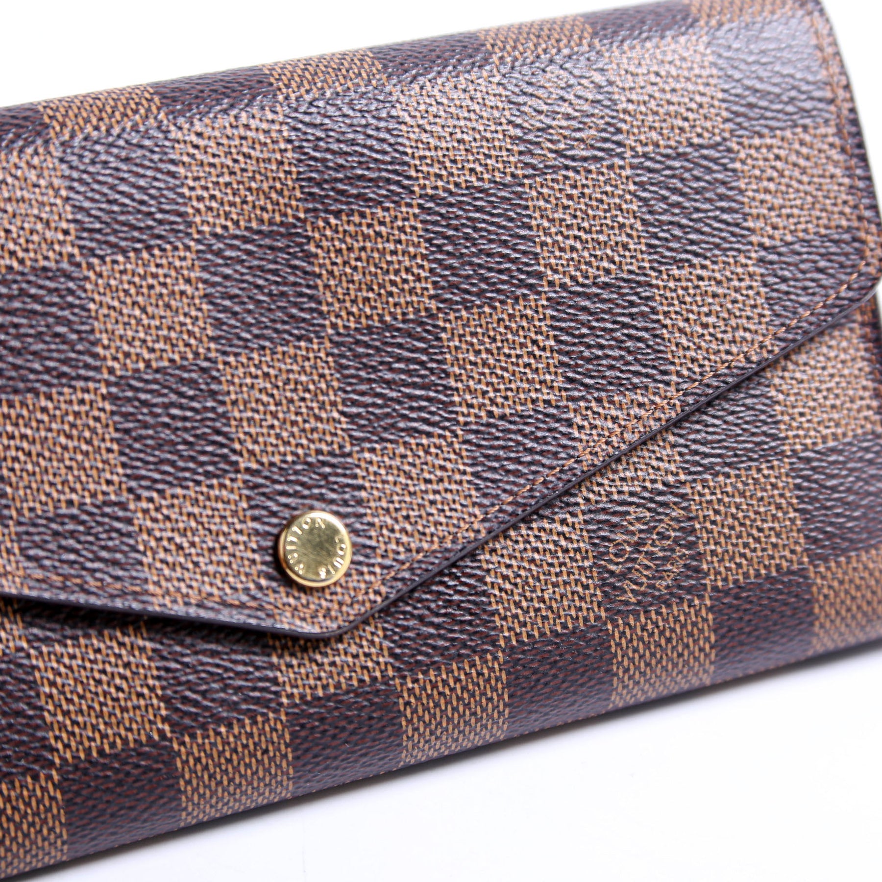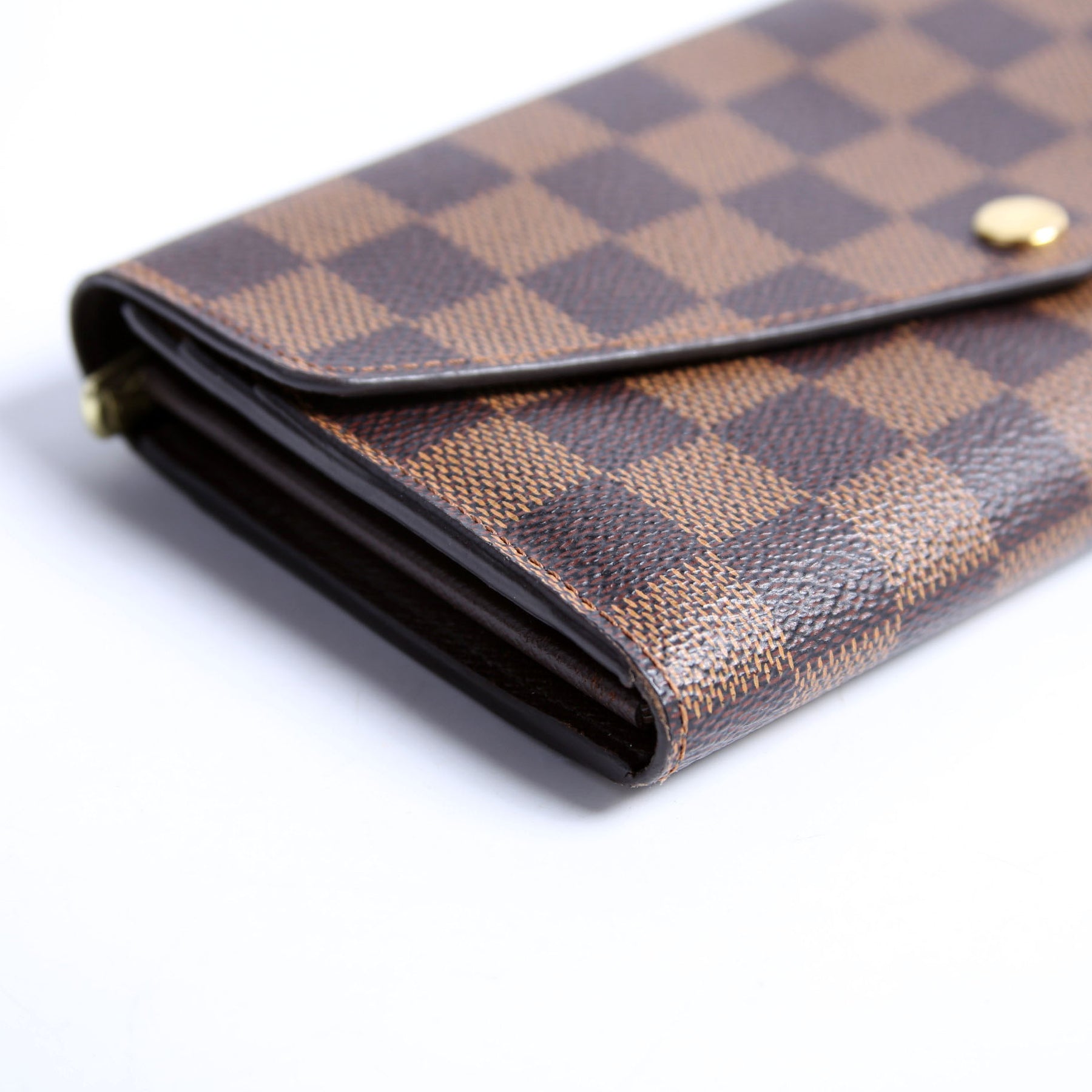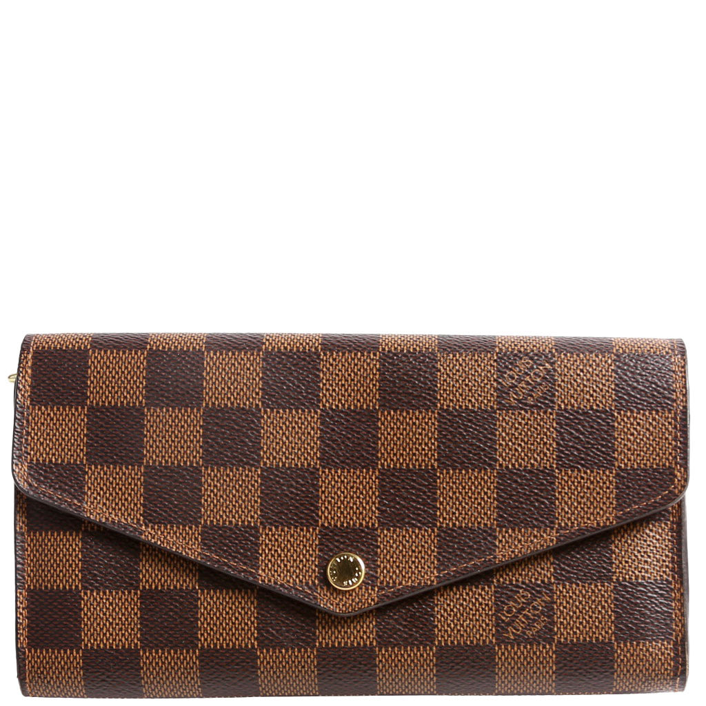 This pre-owned Louis Vuitton Sarah Wallet Newer is guaranteed 100% authentic. The exterior is in the classic Louis Vuitton Damier Ebene coated canvas.
