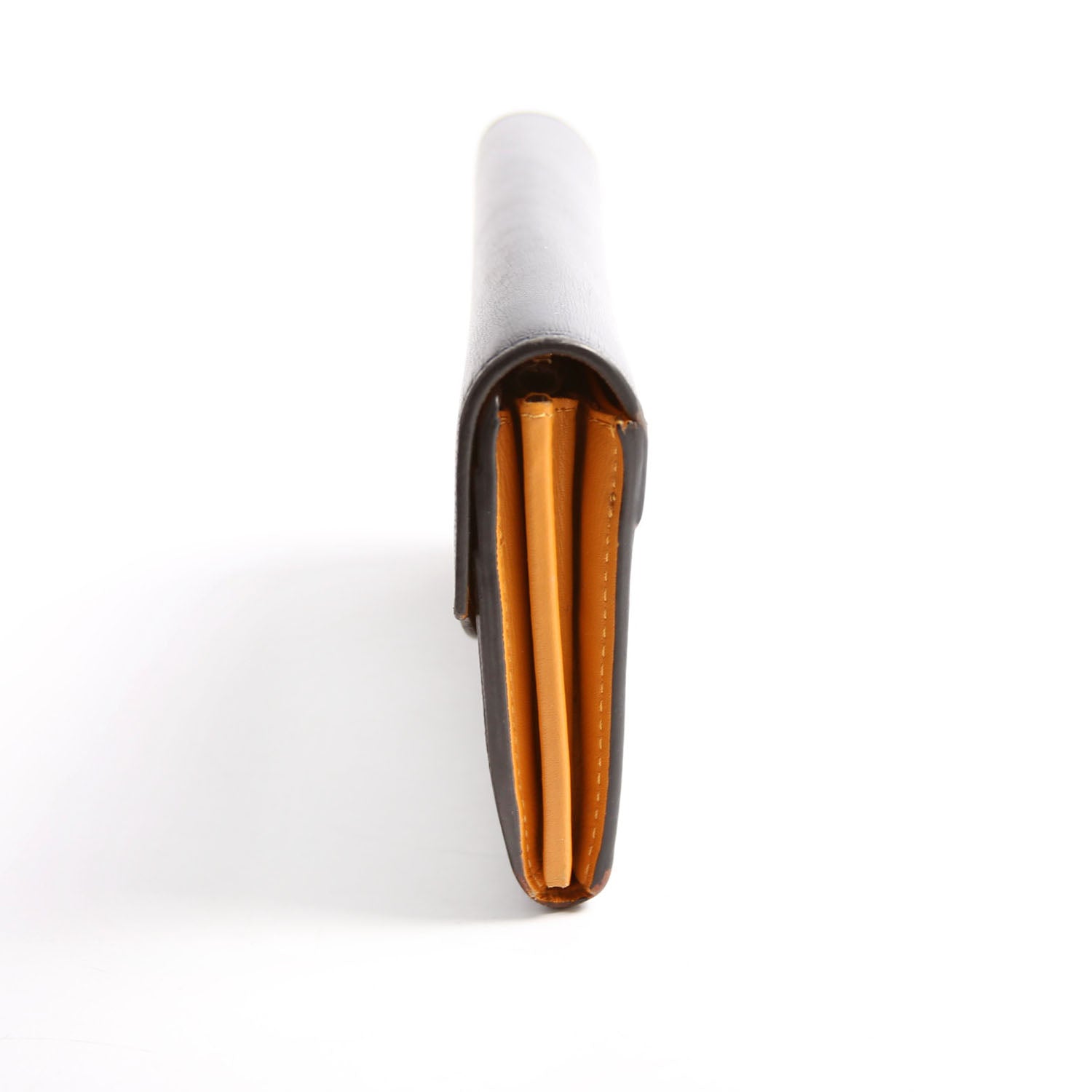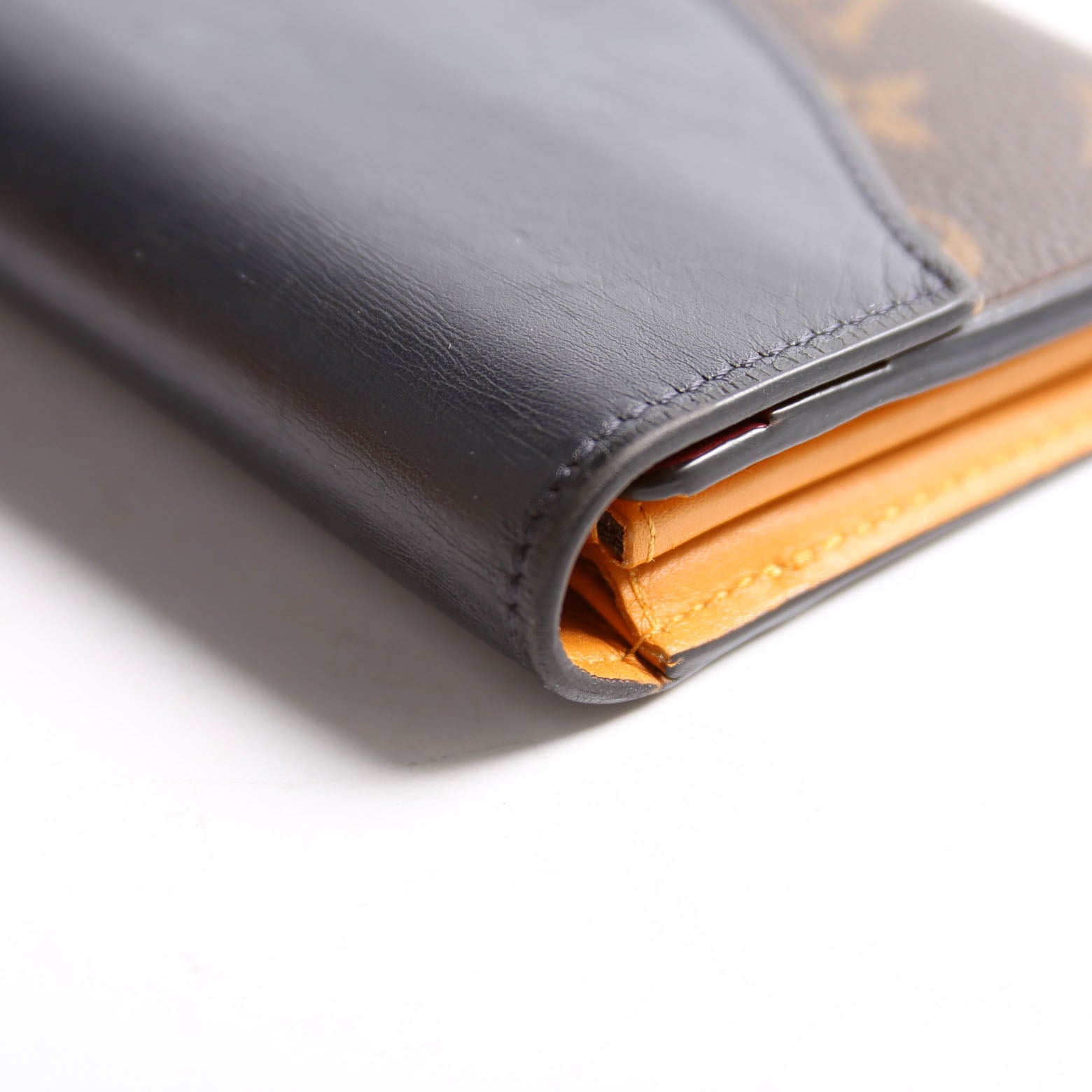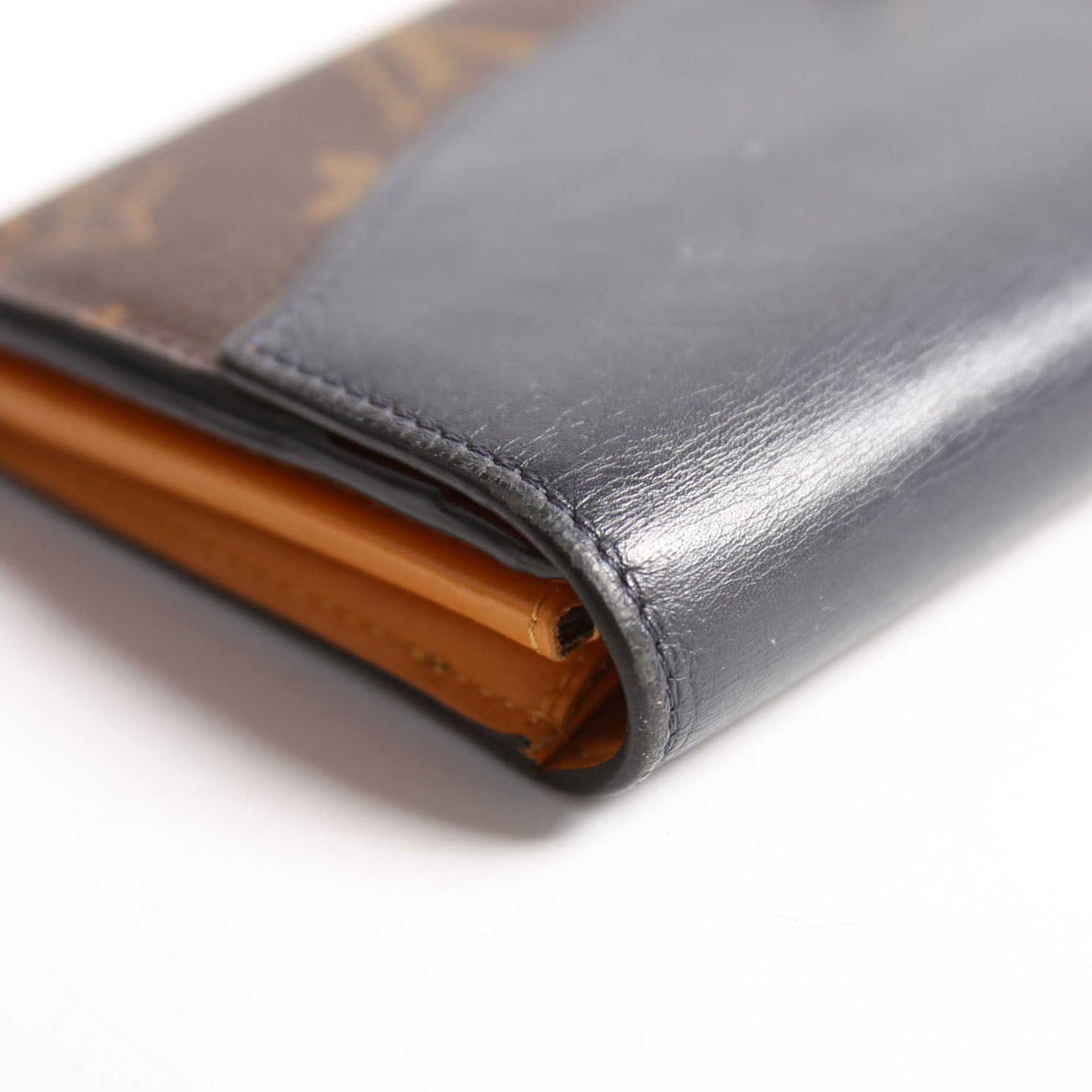 Interior: The interior shows wear, marks, and scuffs throughout. It features sixteen card slots, one open pocket, two open sections, and one zip closure pocket.