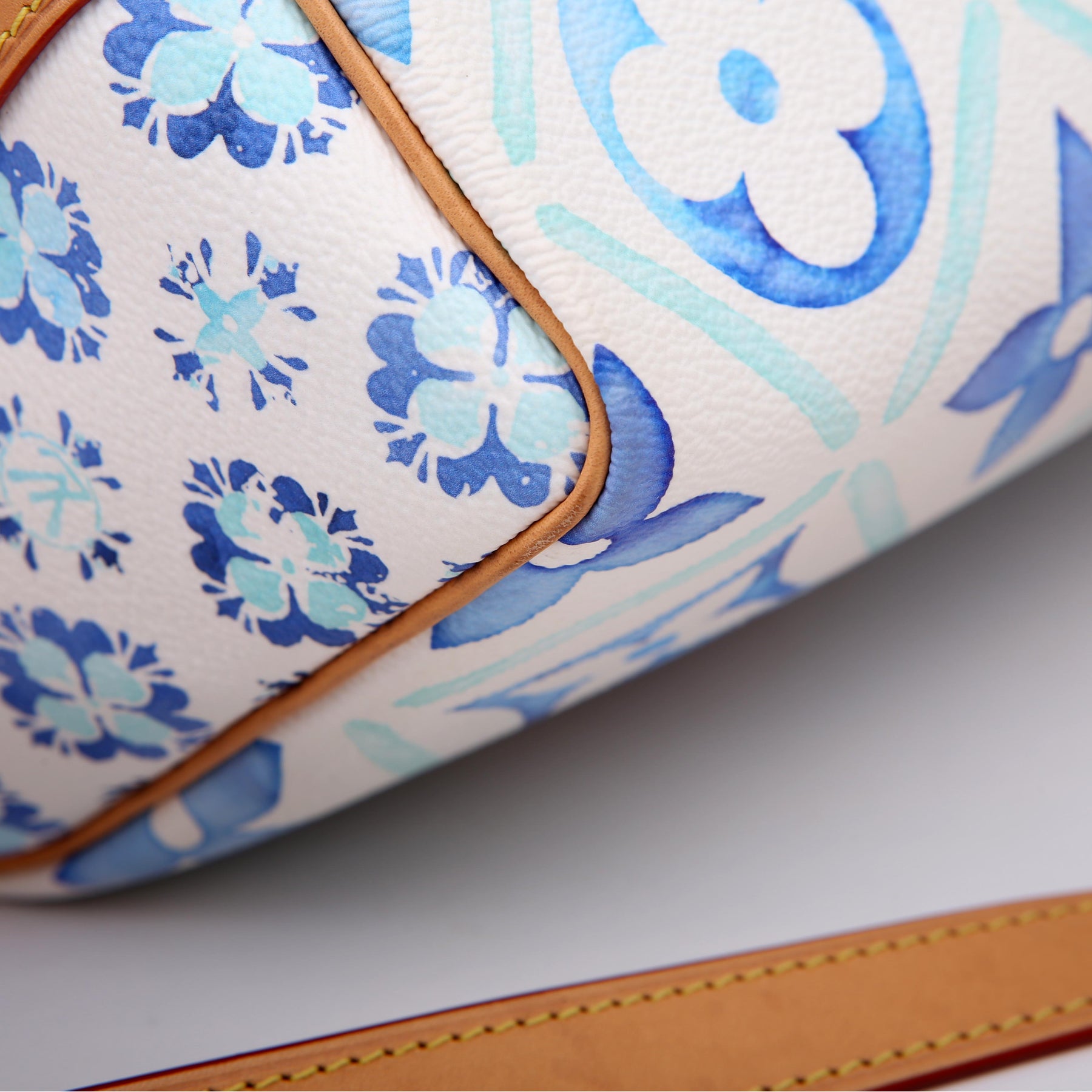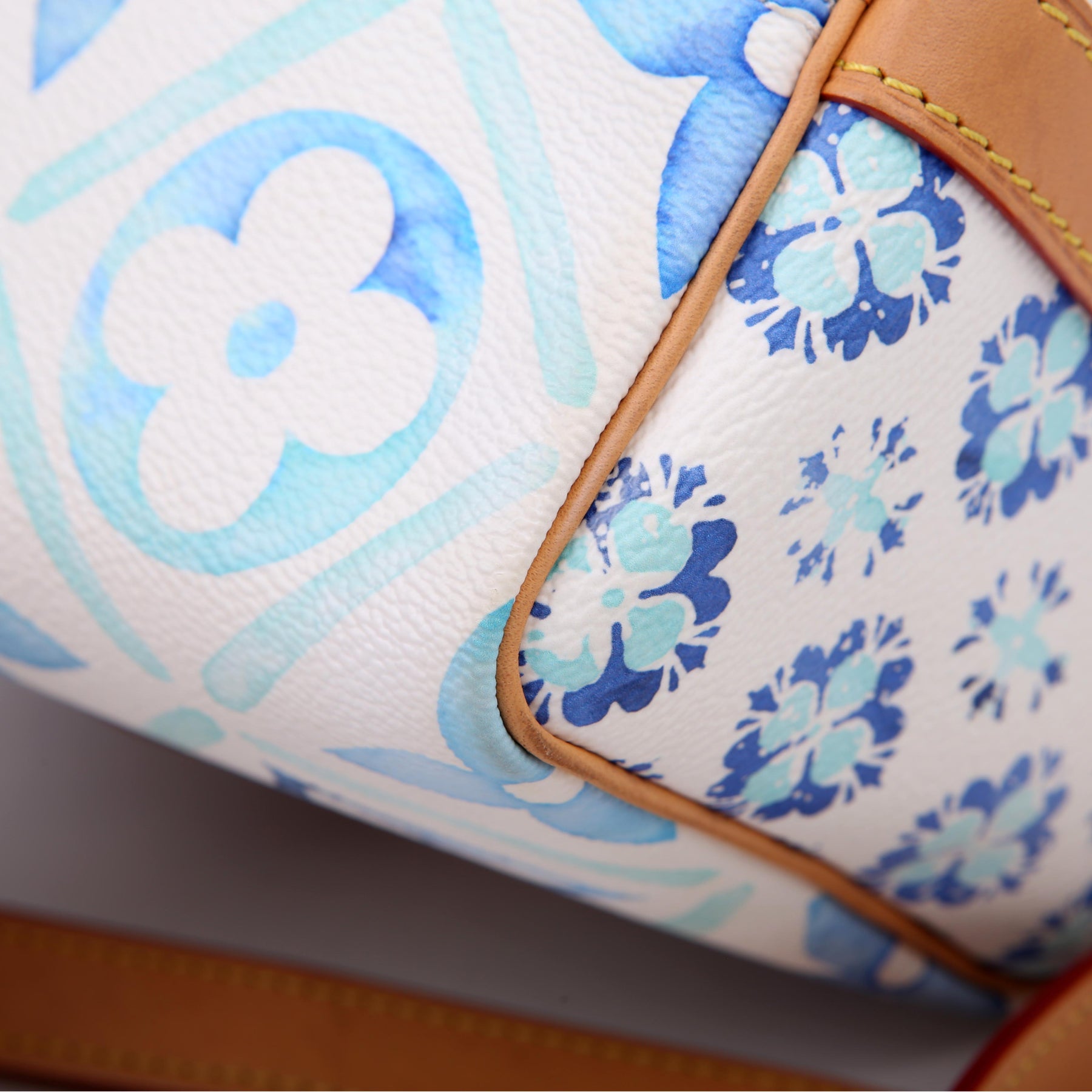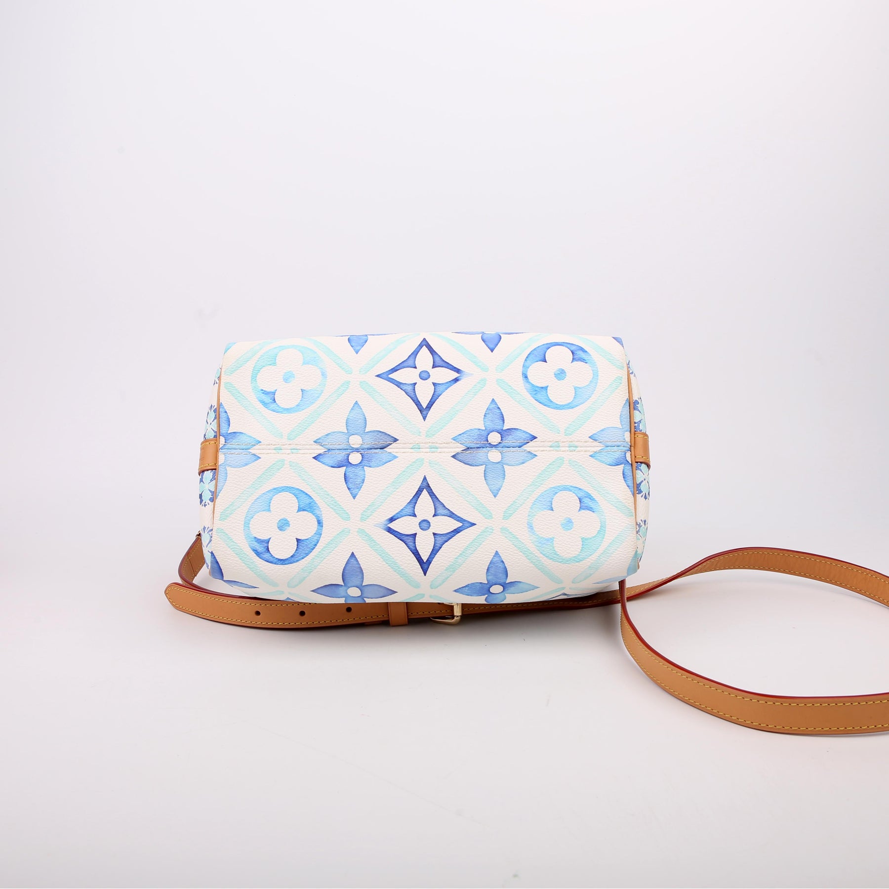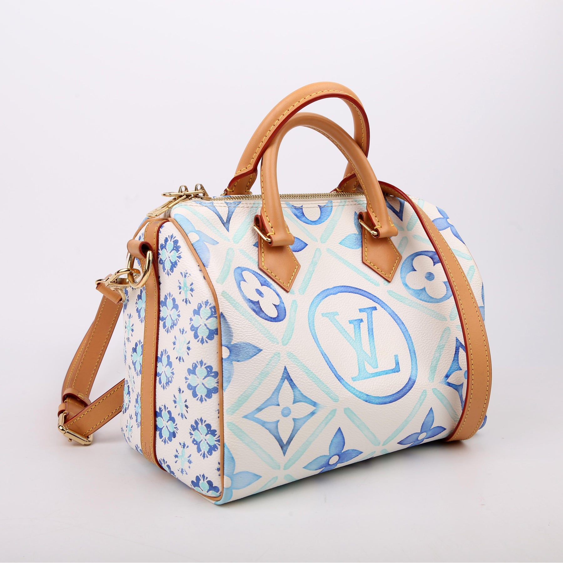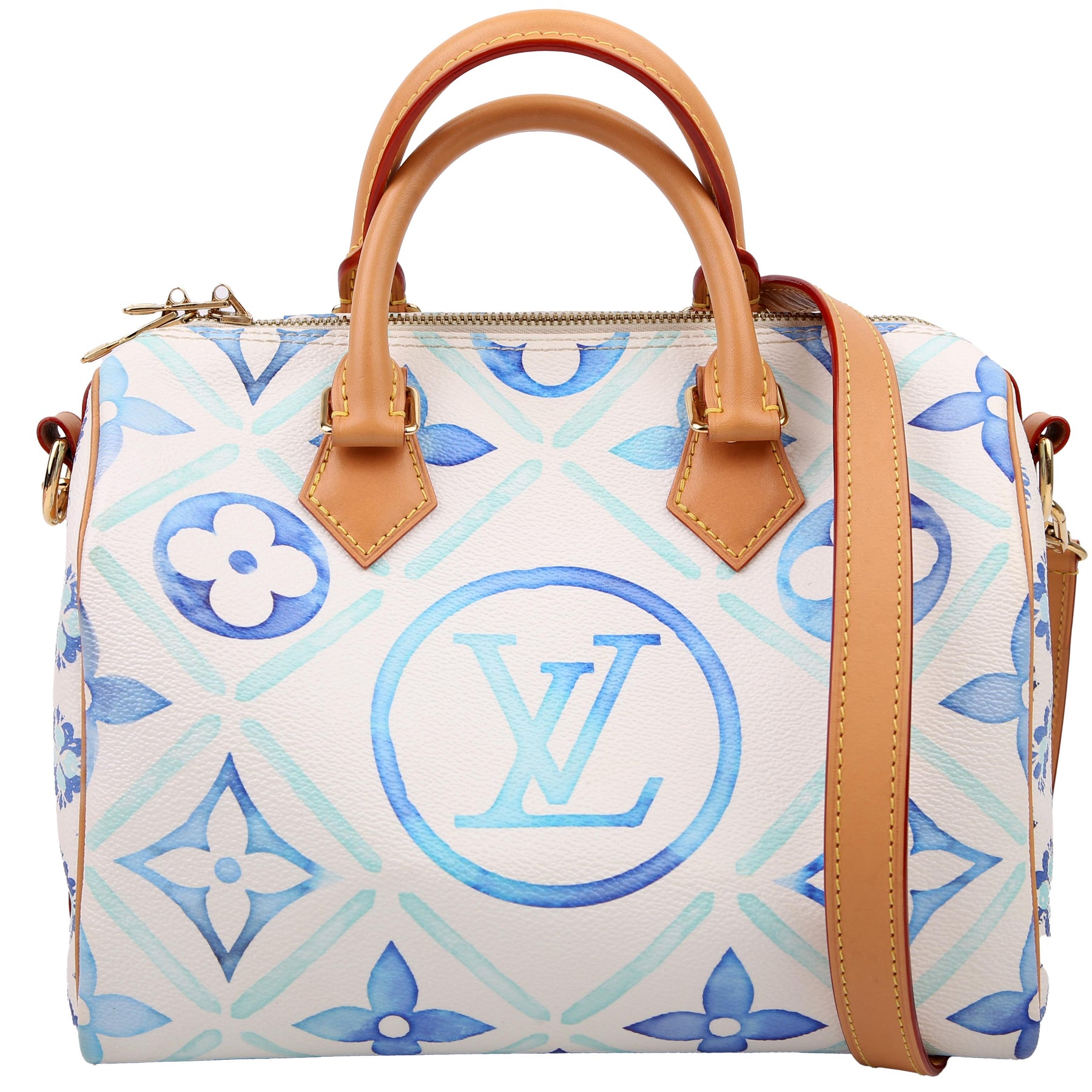 This pre-owned Louis Vuitton Speedy 25 Bandouliere is guaranteed 100% authentic. The exterior is in the classic Louis Vuitton Tiles By the Pool coated canvas.