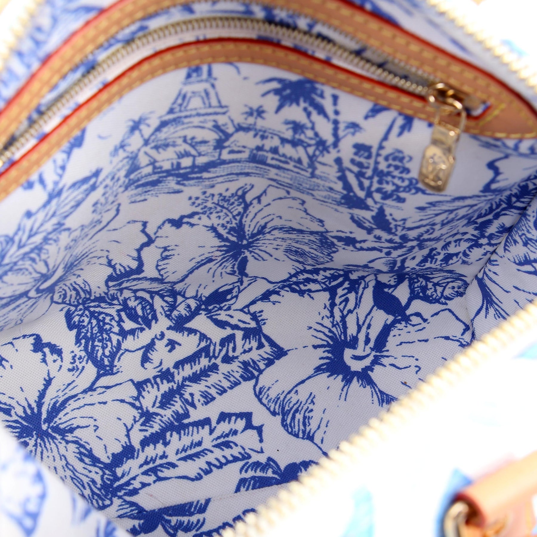 Exterior: The exterior coated canvas is free from wear. The leather has minor discoloration near the strap hooks.