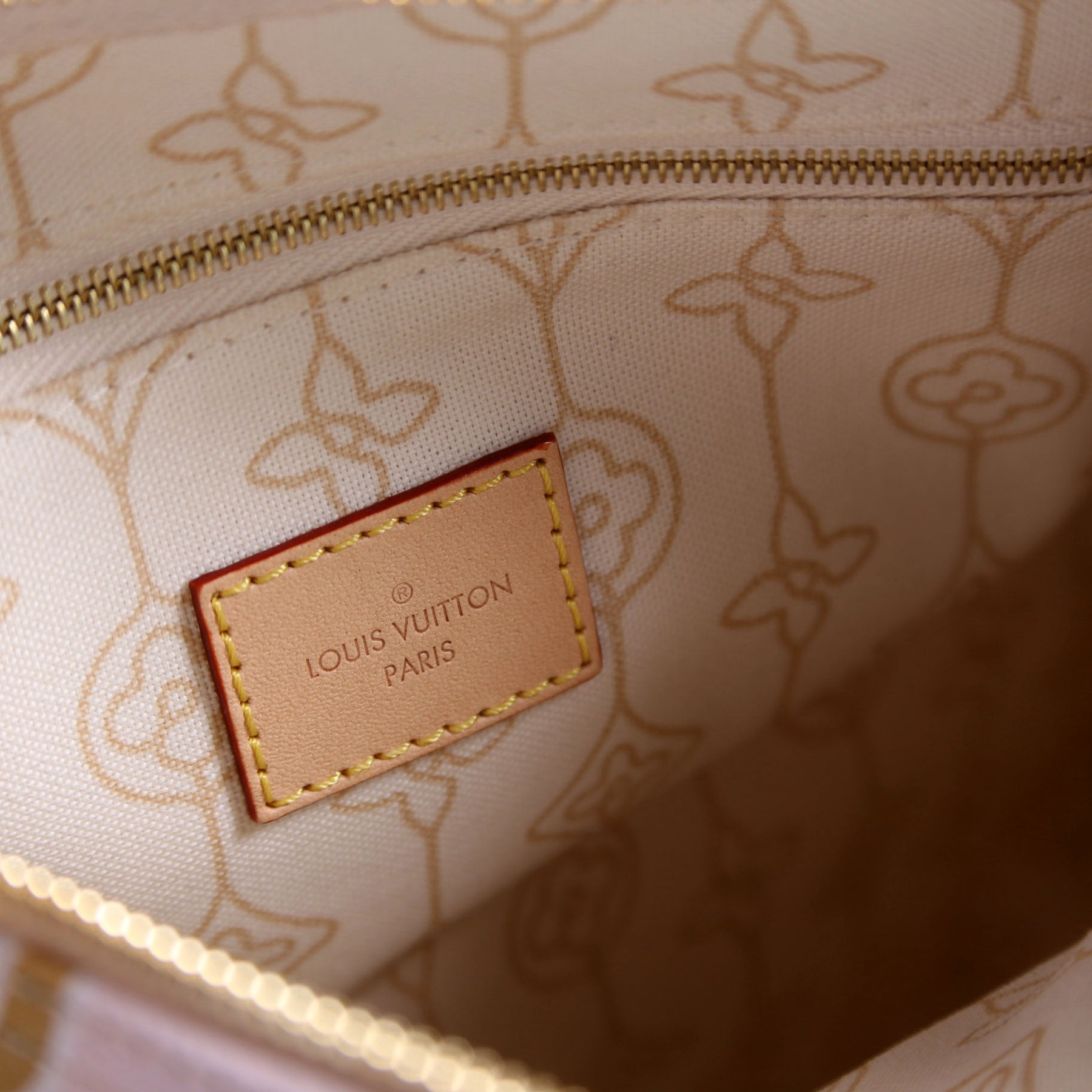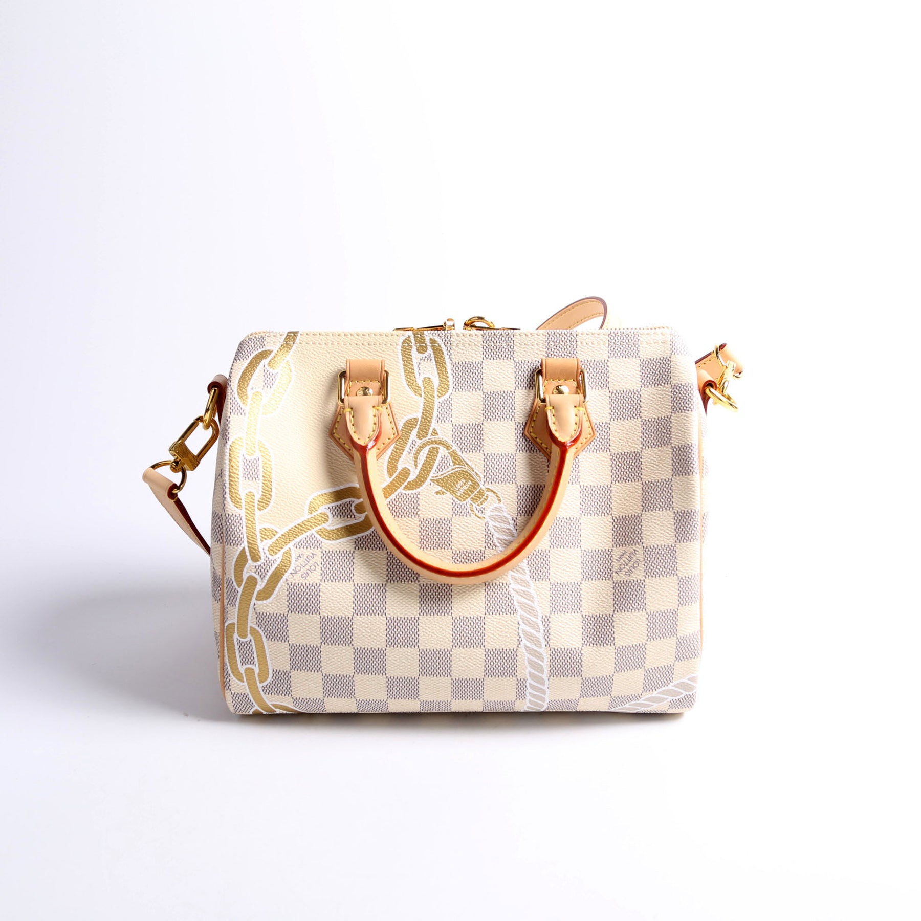 This pre-owned Louis Vuitton Speedy 25 With Strap Nautical Azur is guaranteed 100% authentic. The exterior is in the classic Louis Vuitton Damier Azur coated canvas.