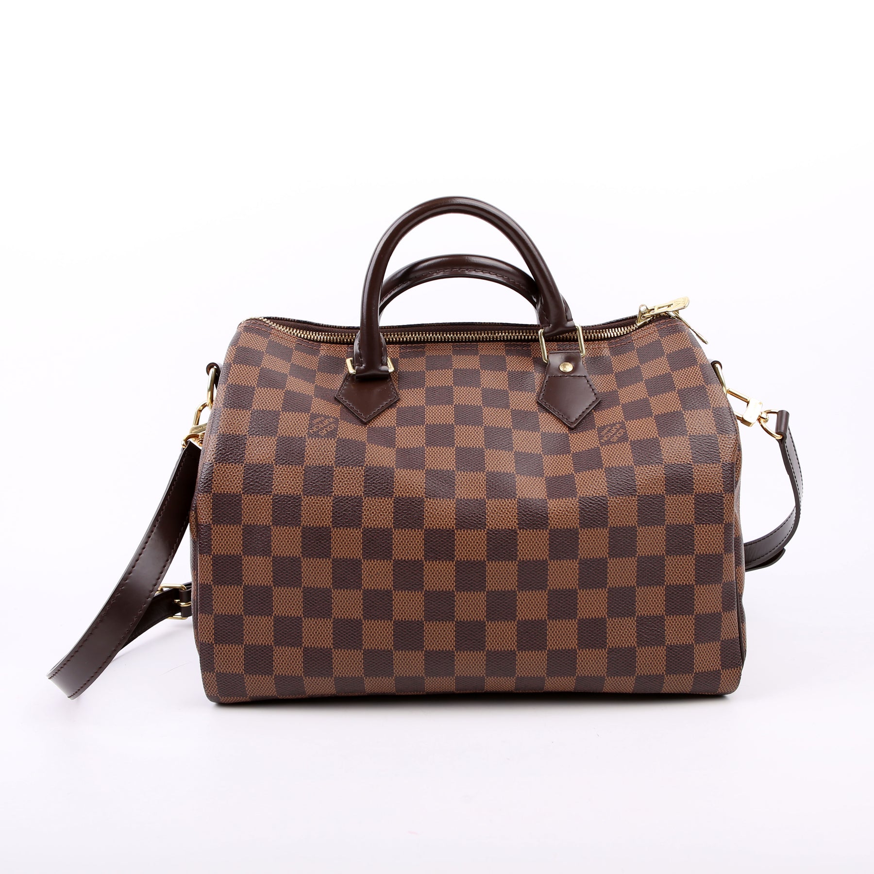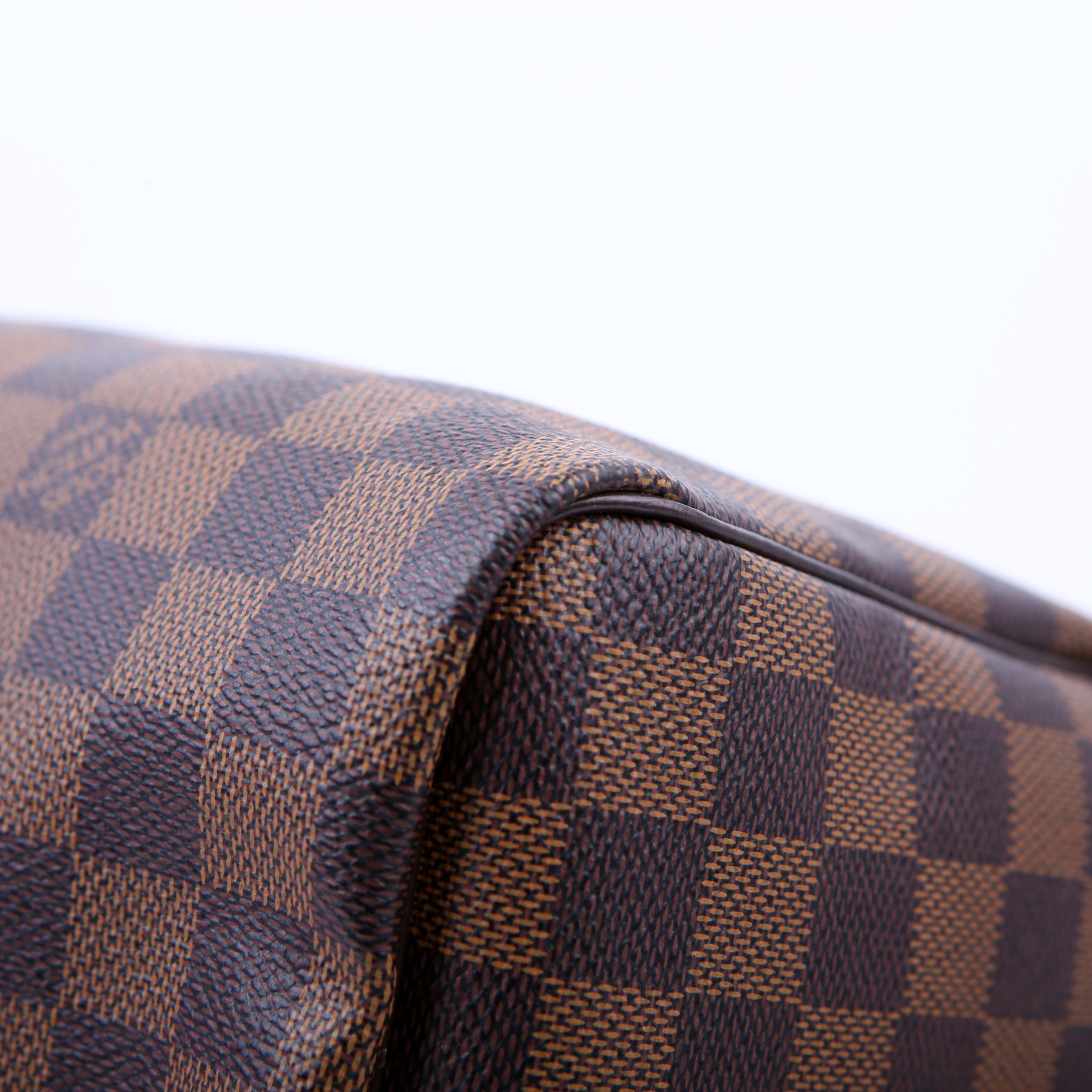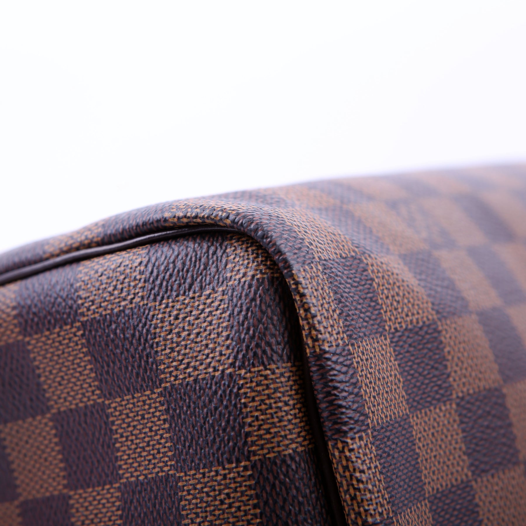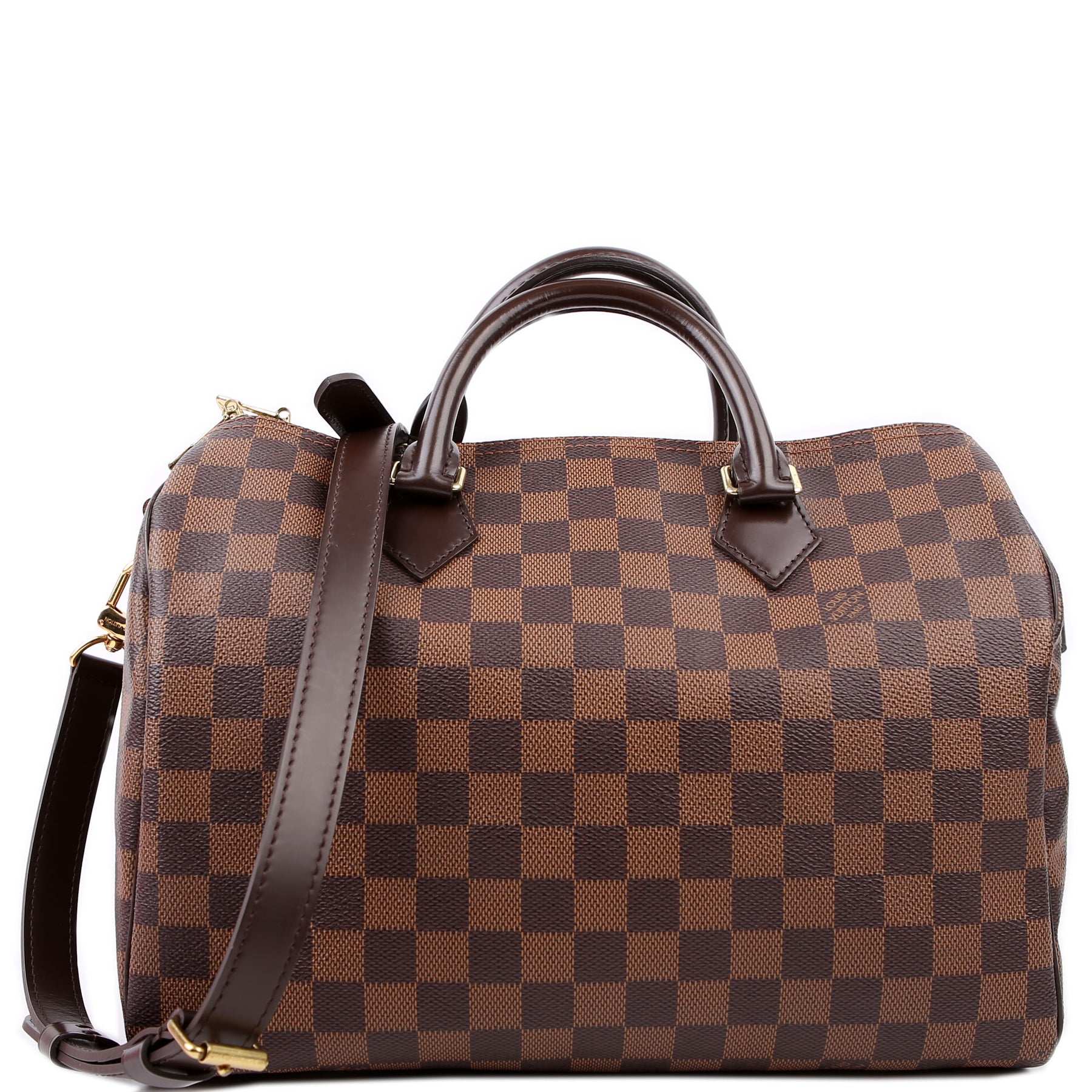 This pre-owned Louis Vuitton Speedy 30 Bandouliere is guaranteed 100% authentic. The exterior is in the classic Louis Vuitton Damier Ebene Coated Canvas.