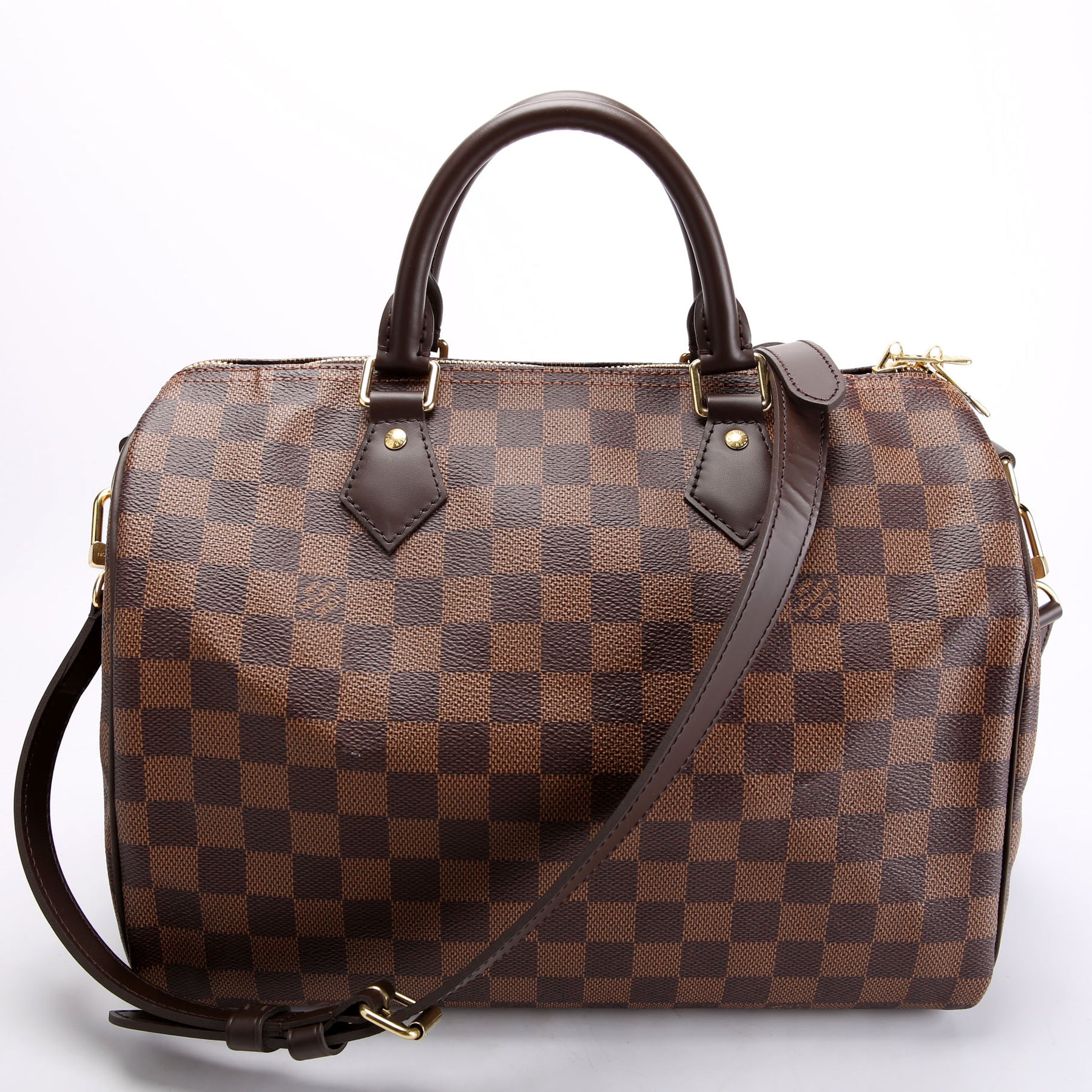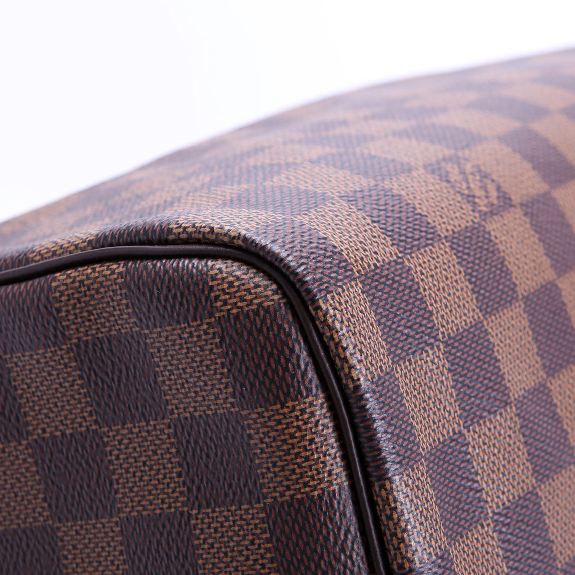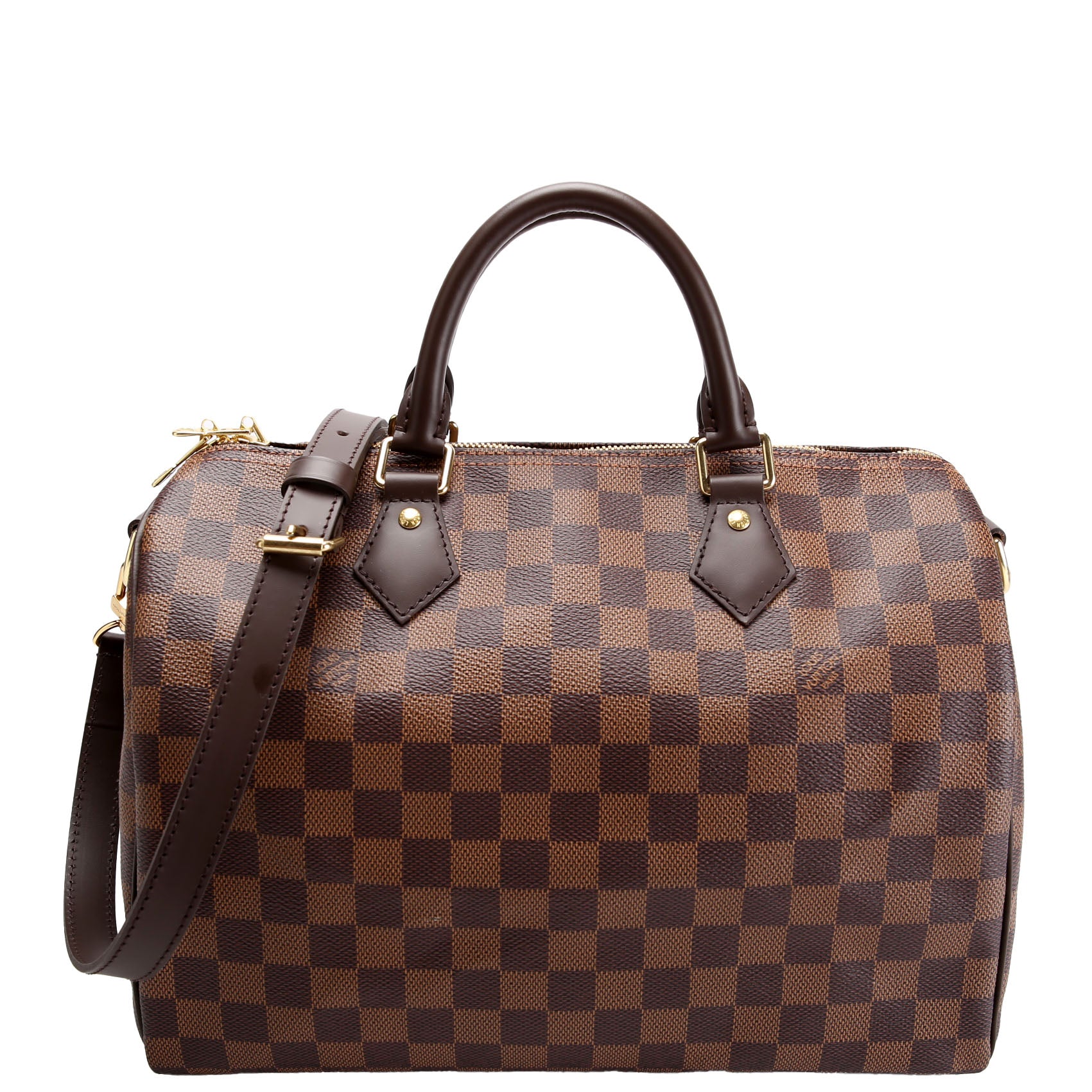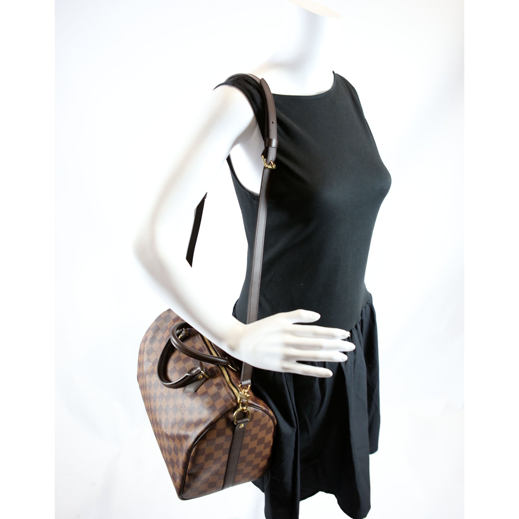 This pre-owned Louis Vuitton Speedy 30 Bandouliere is guaranteed 100% authentic. The exterior is in the classic Louis Vuitton Damier Ebene coated canvas.