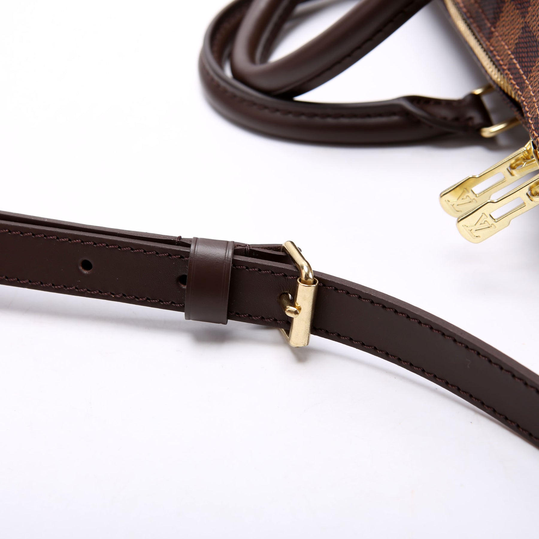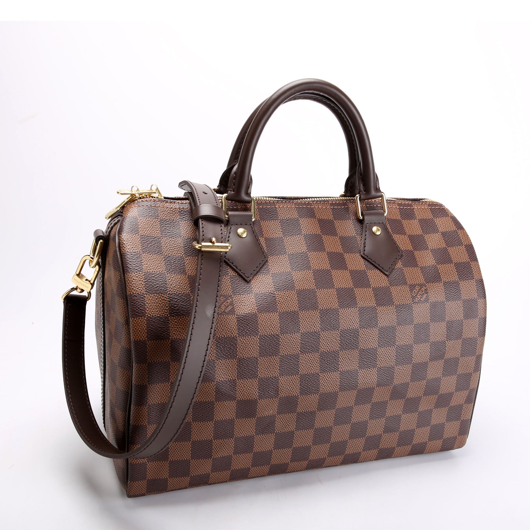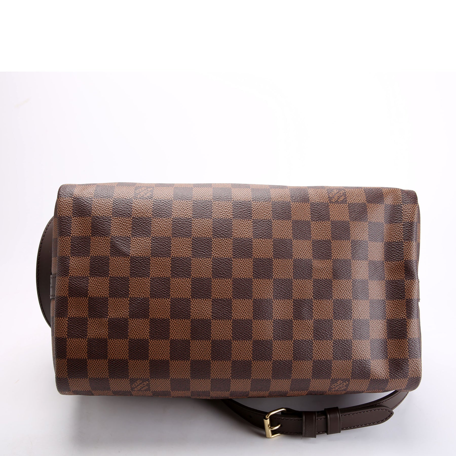 This pre-owned Louis Vuitton Speedy 30 Bandouliere is guaranteed 100% authentic. The exterior is in the classic Louis Vuitton Damier Ebene coated canvas.