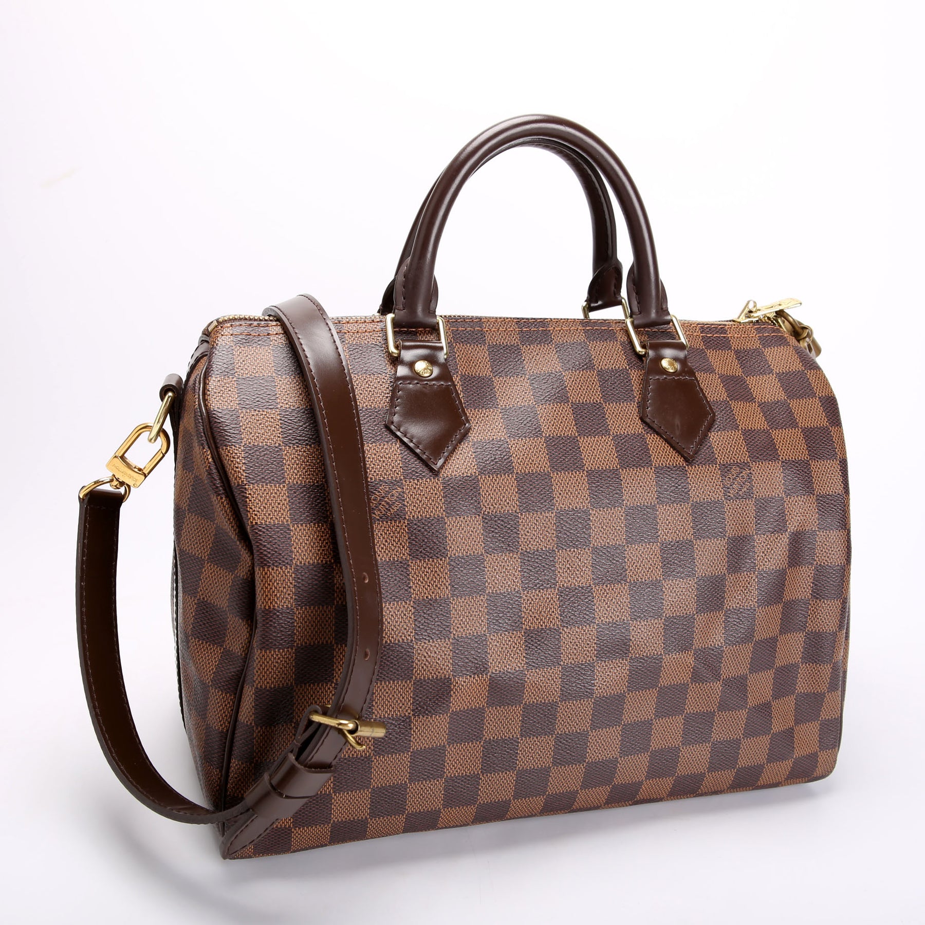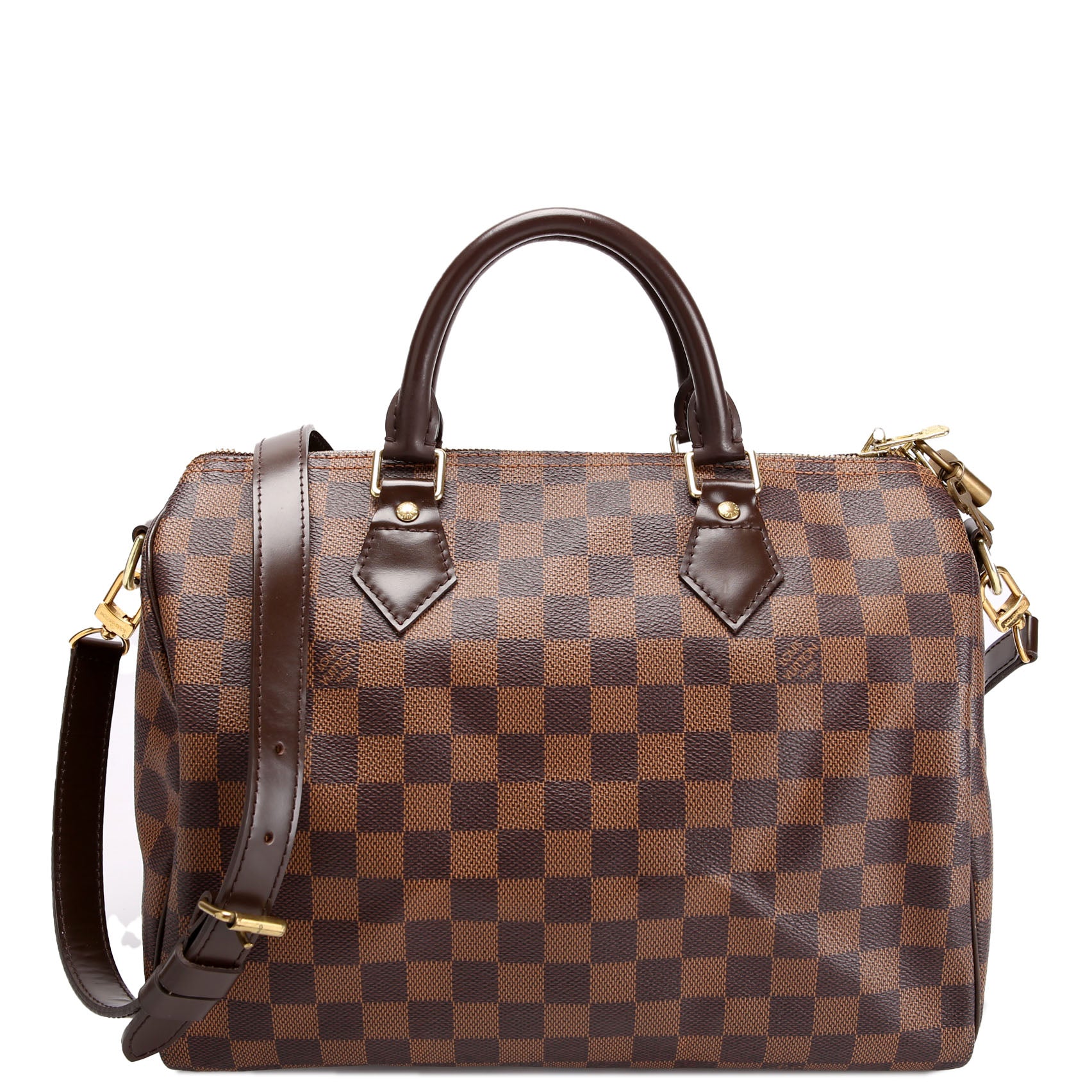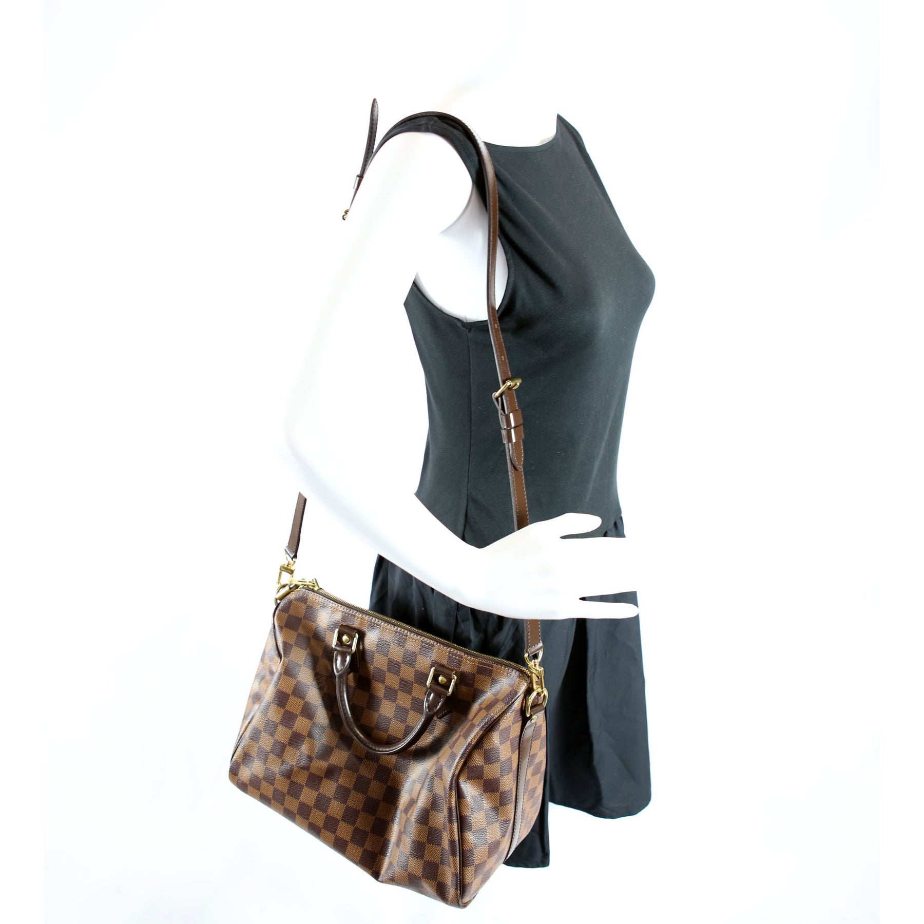 This pre-owned Louis Vuitton Speedy 30 Bandouliere is guaranteed 100% authentic. The exterior is in the classic Louis Vuitton Damier Ebene Coated Canvas.