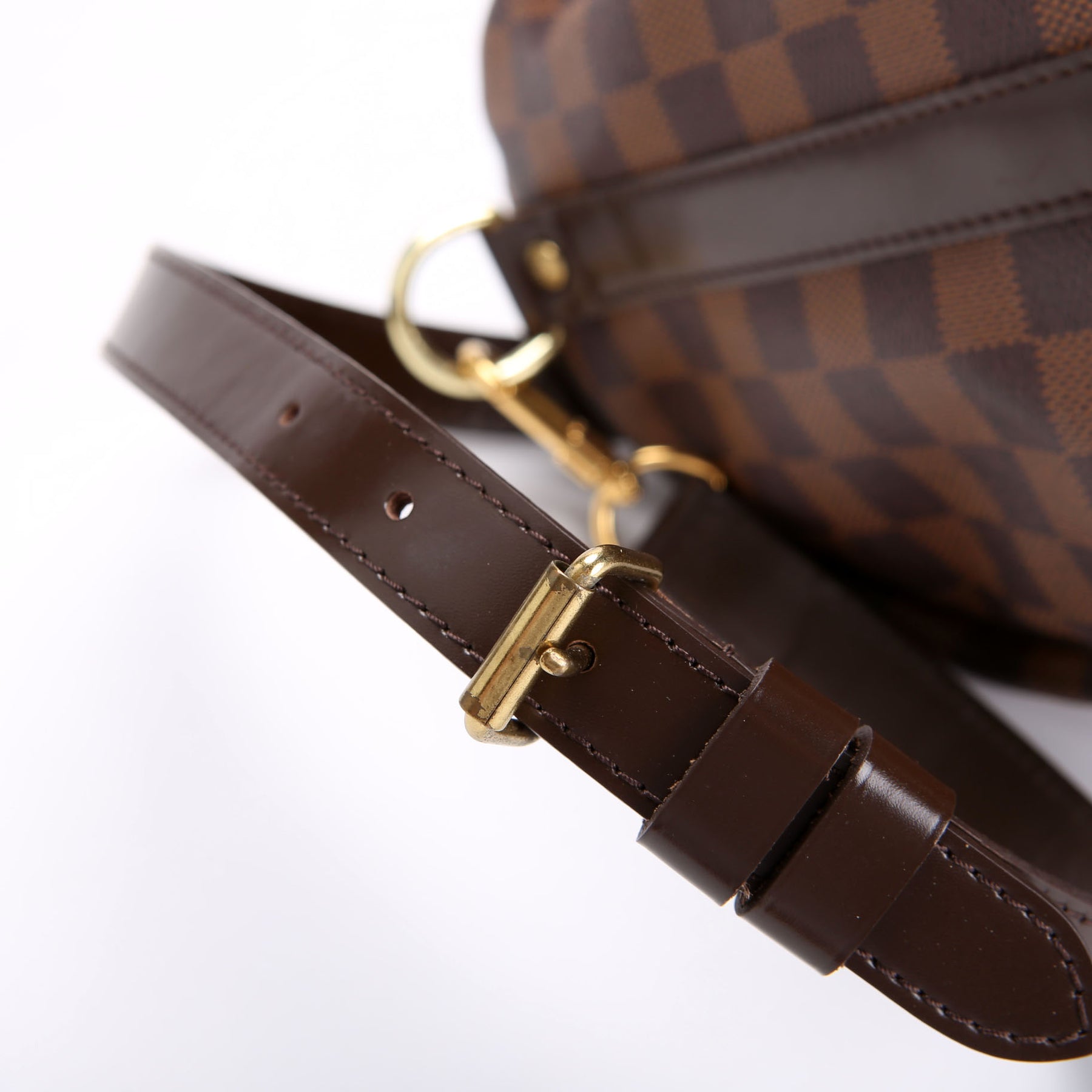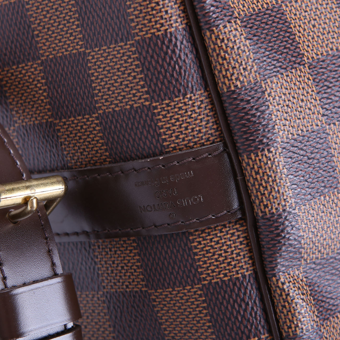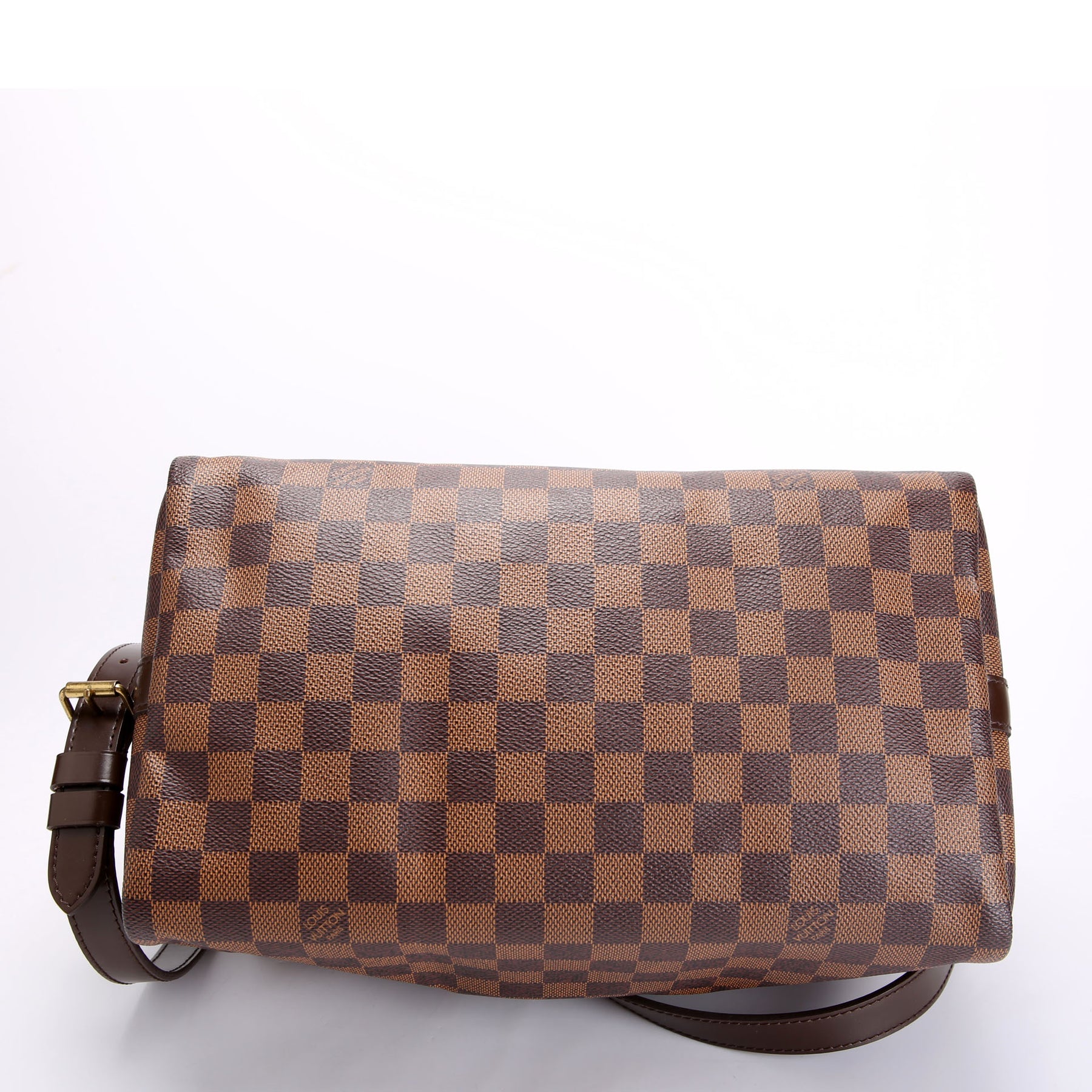 This pre-owned Louis Vuitton Speedy 30 Bandouliere is guaranteed 100% authentic. The exterior is in the classic Louis Vuitton Damier Ebene Coated Canvas.