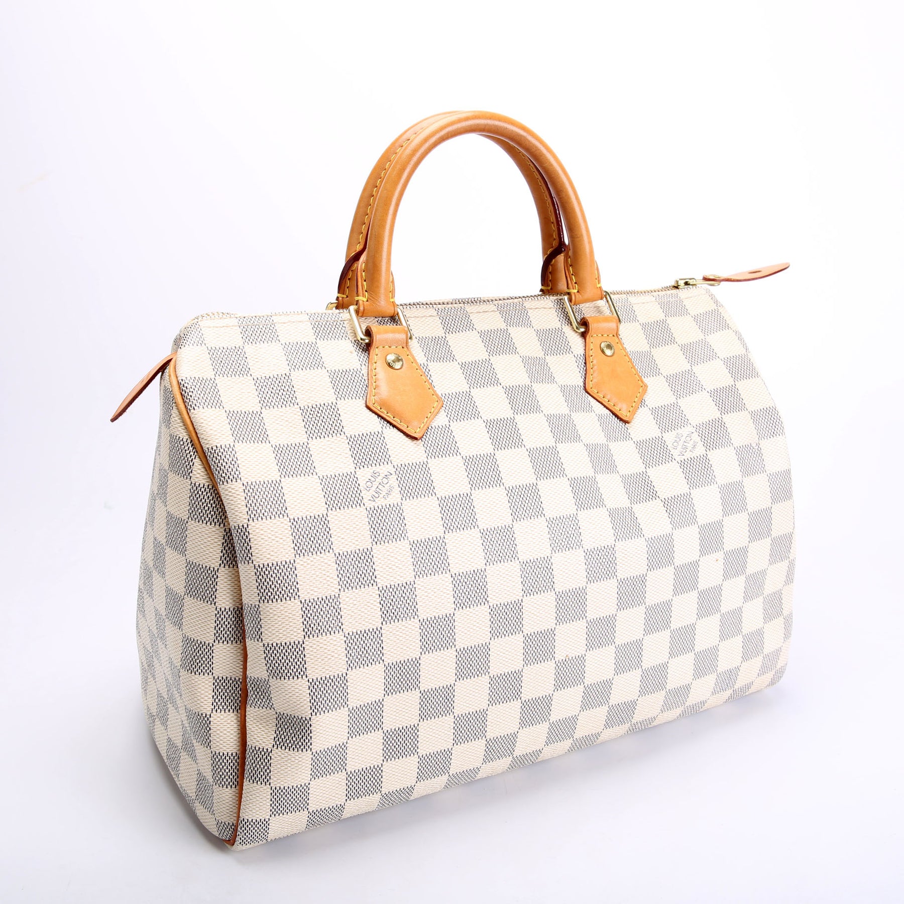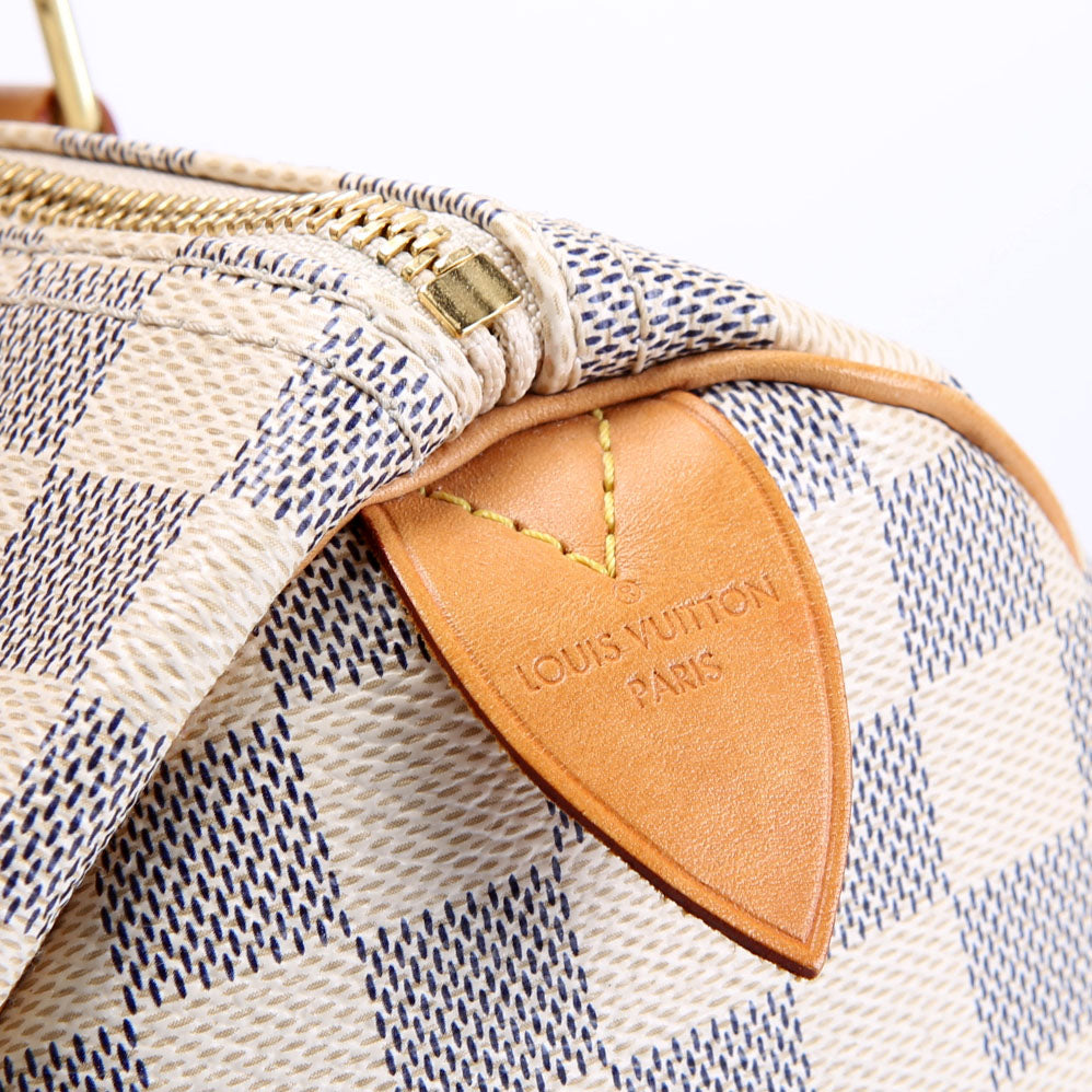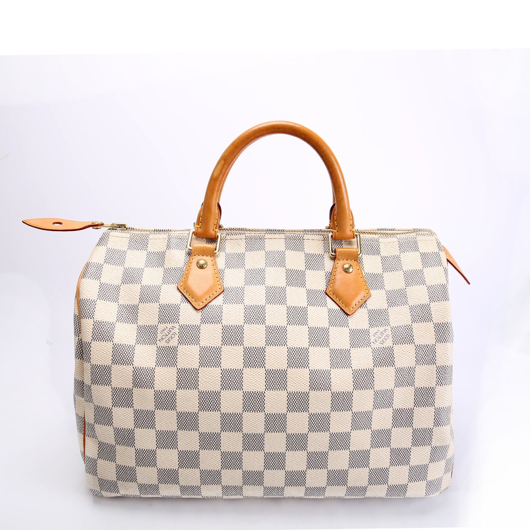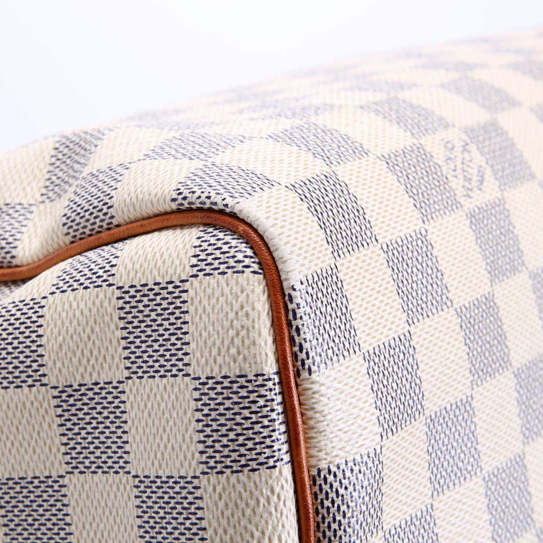This pre-owned Louis Vuitton Speedy 30 is guaranteed 100% authentic. The exterior is in the classic Louis Vuitton Damier Azur coated canvas.