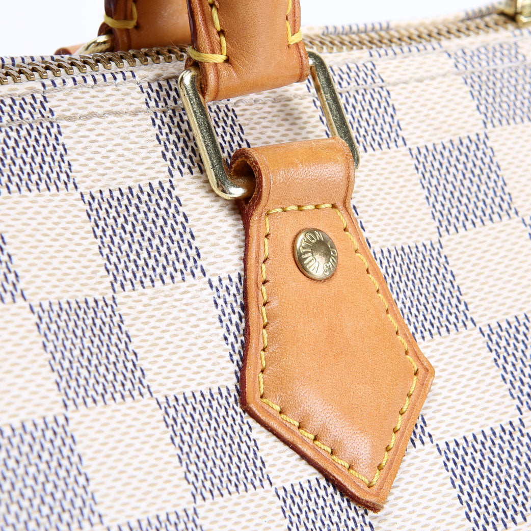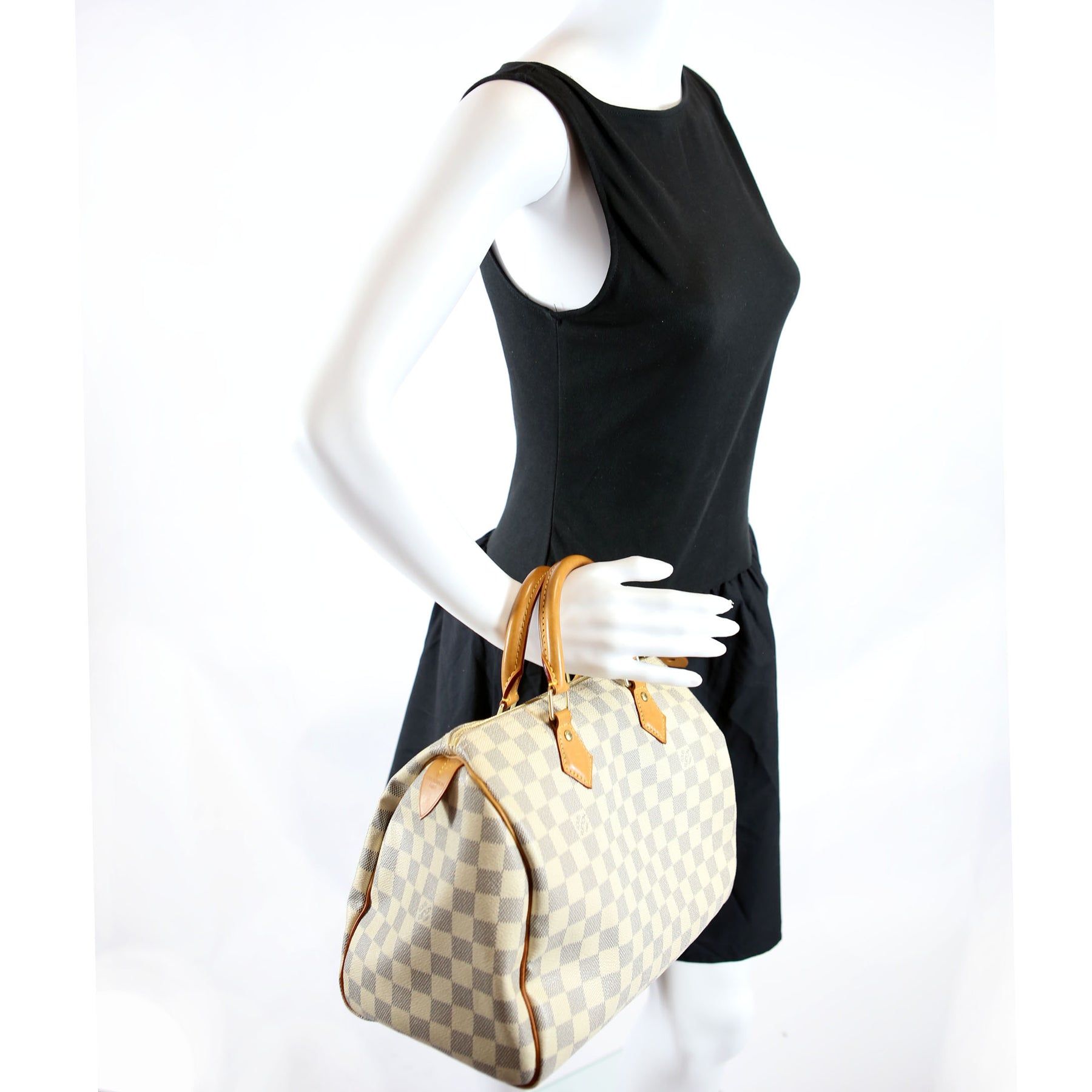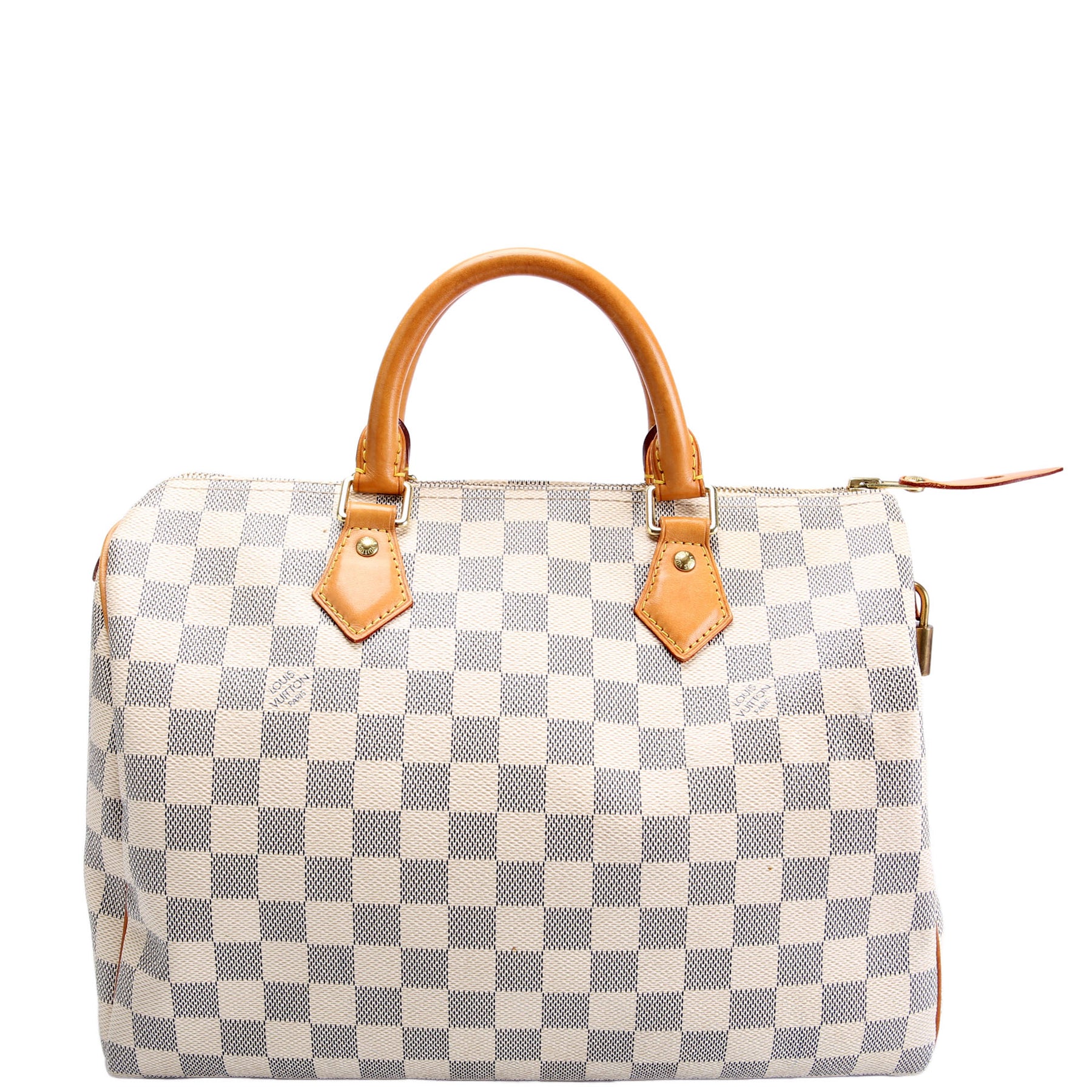 This pre-owned Louis Vuitton Speedy 30 is guaranteed 100% authentic. The exterior is in the classic Louis Vuitton Damier Azur coated canvas.