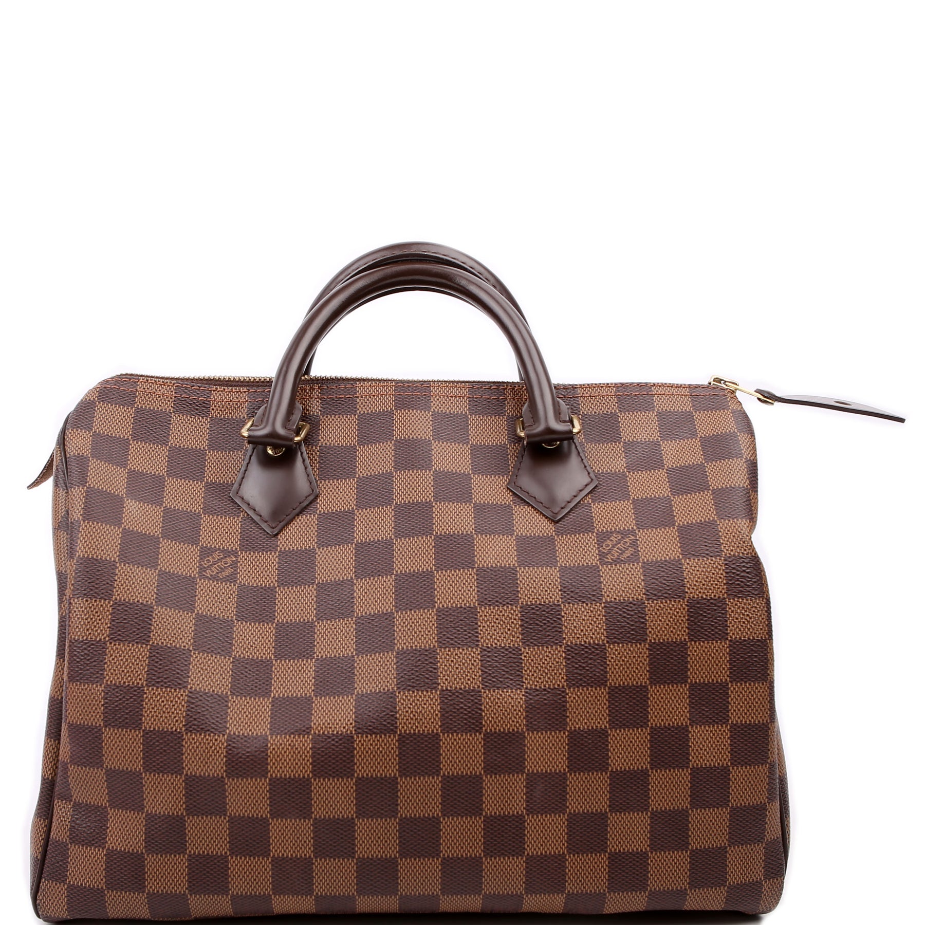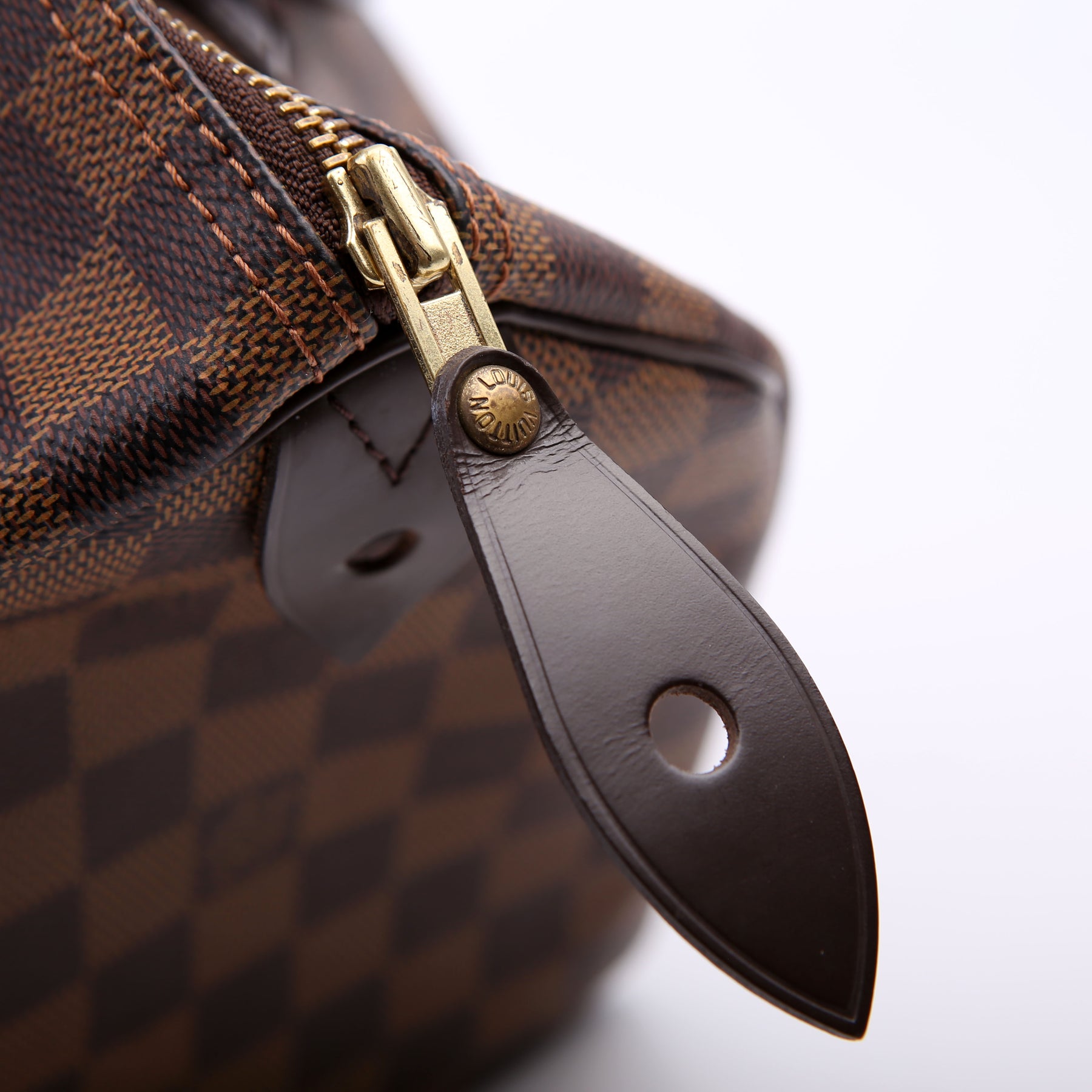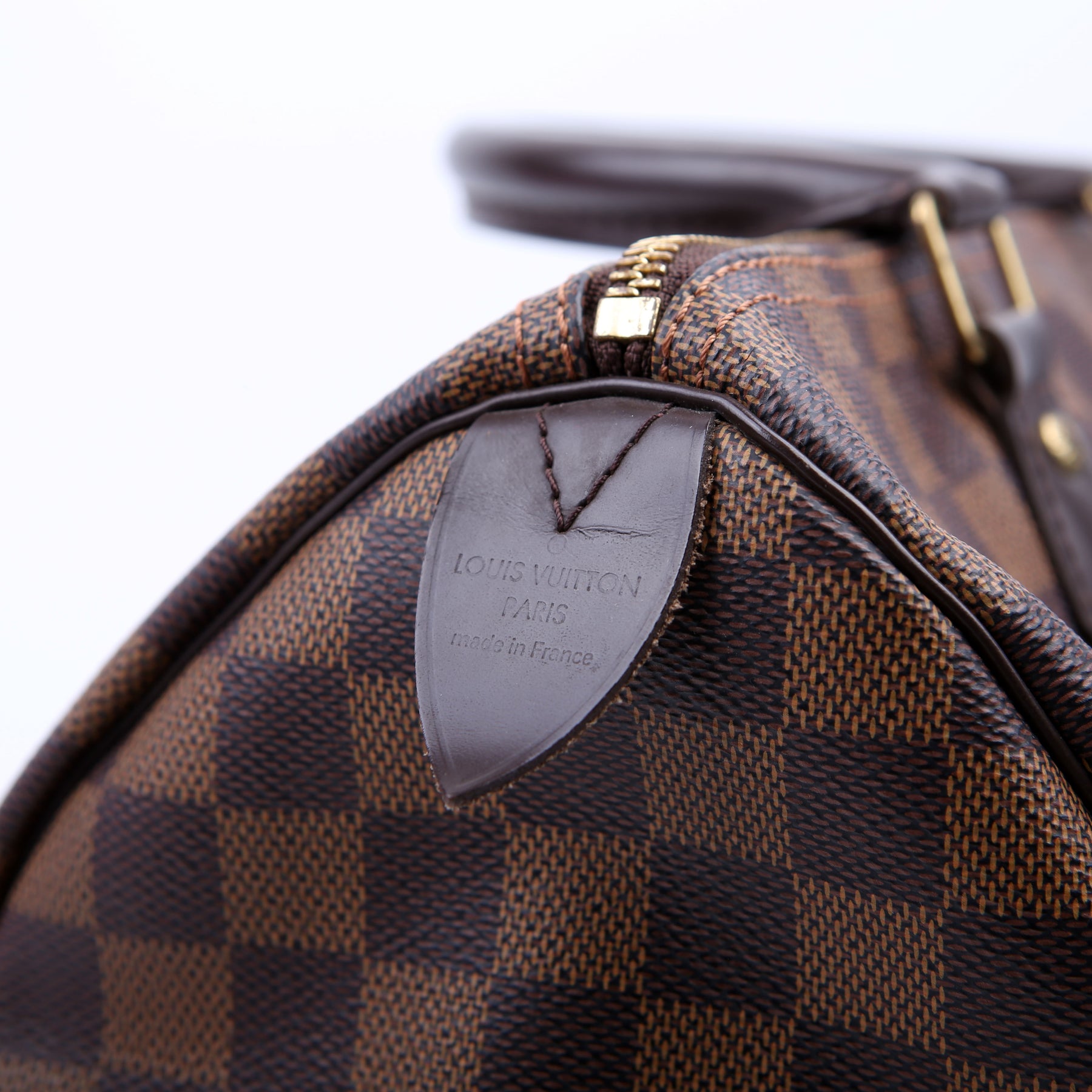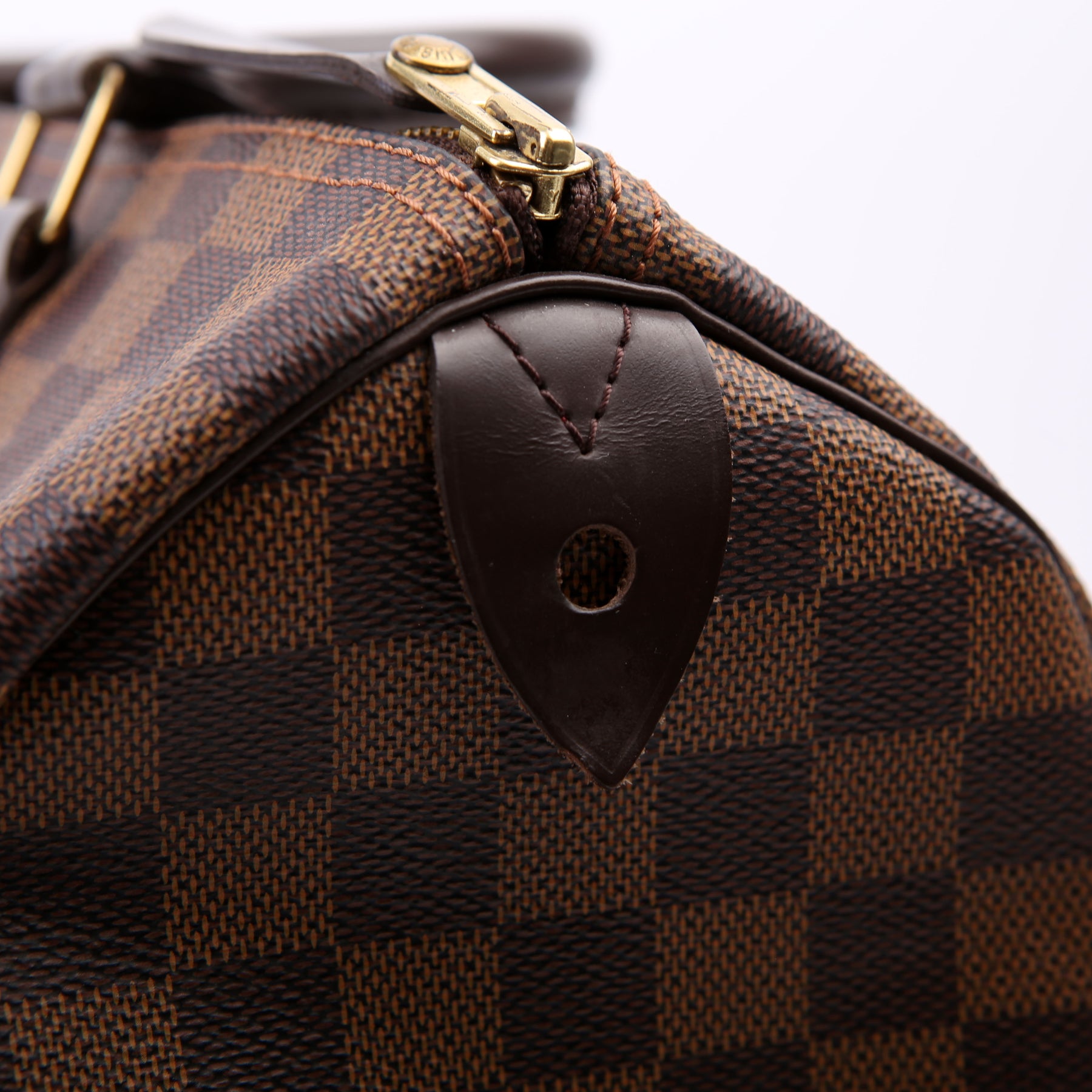 This pre-owned Louis Vuitton Speedy 30 is guaranteed 100% authentic. The exterior is in the classic Louis Vuitton Damier Ebene coated canvas.
