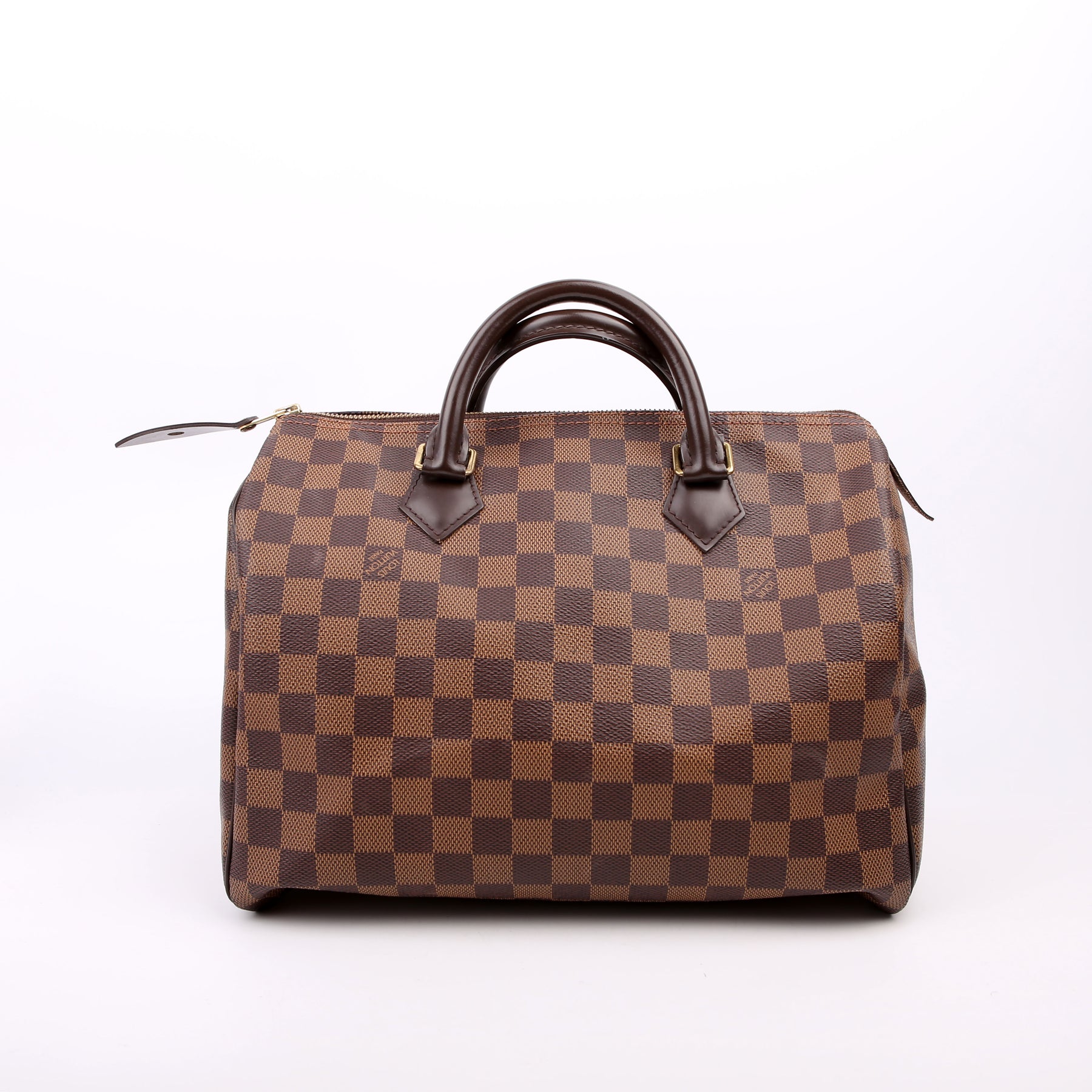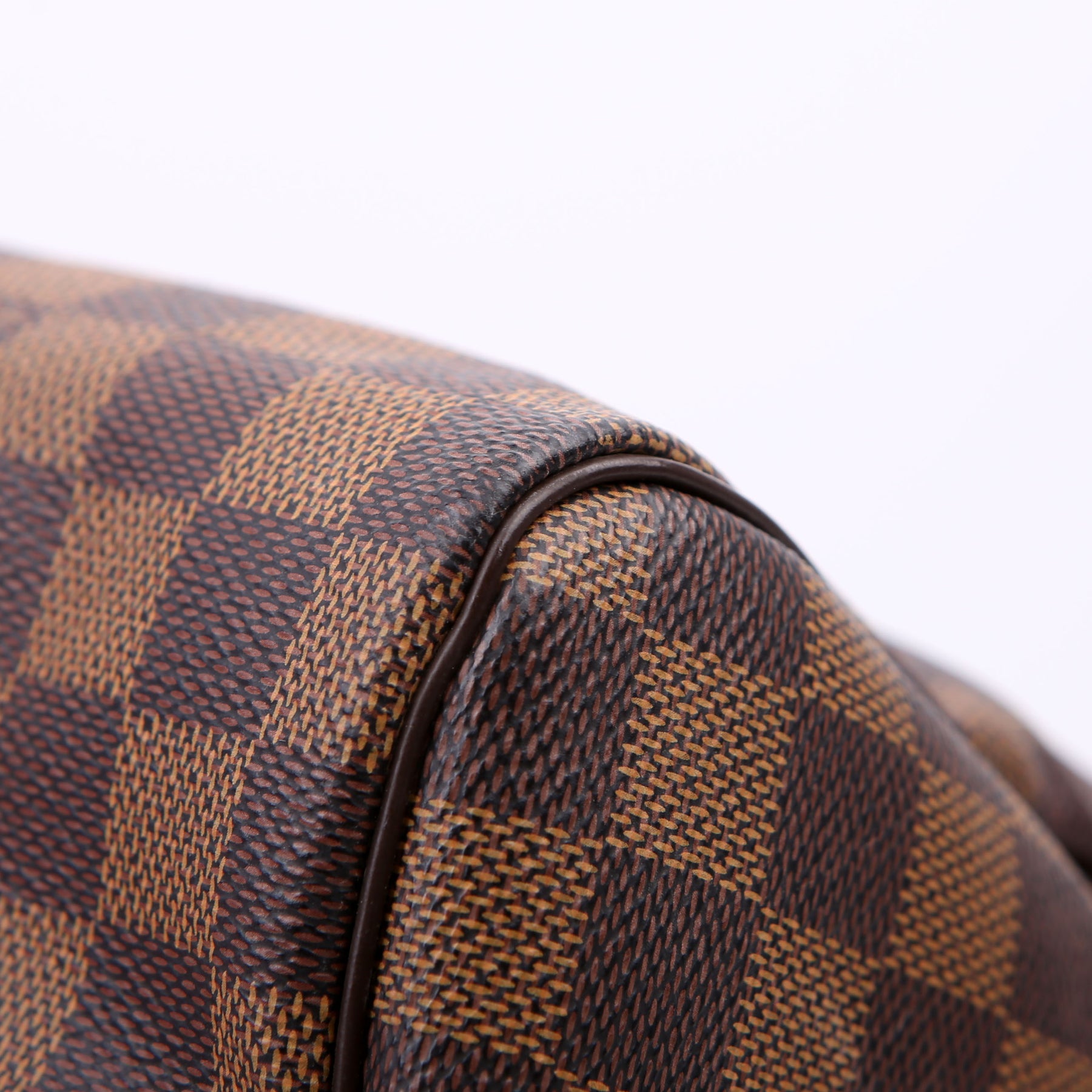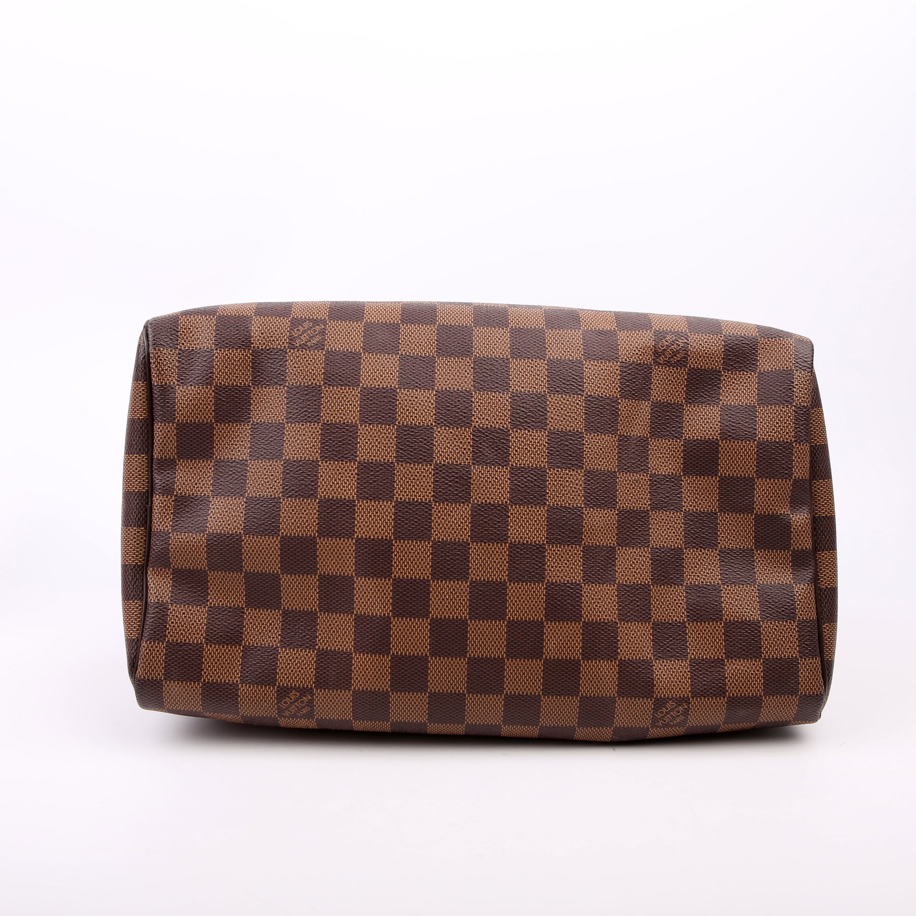This pre-owned Louis Vuitton Speedy 30 is guaranteed 100% authentic. The exterior is in the classic Louis Vuitton Damier Ebene coated canvas.