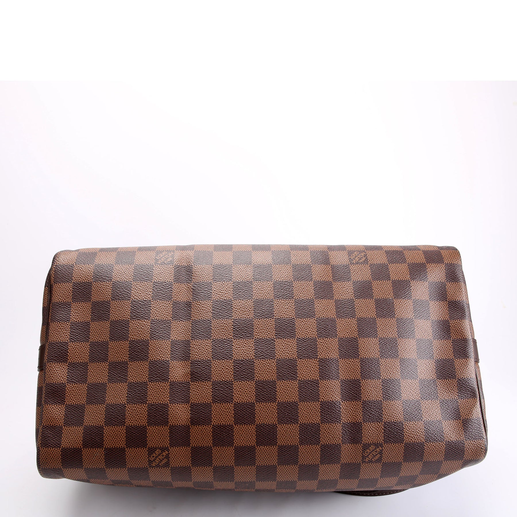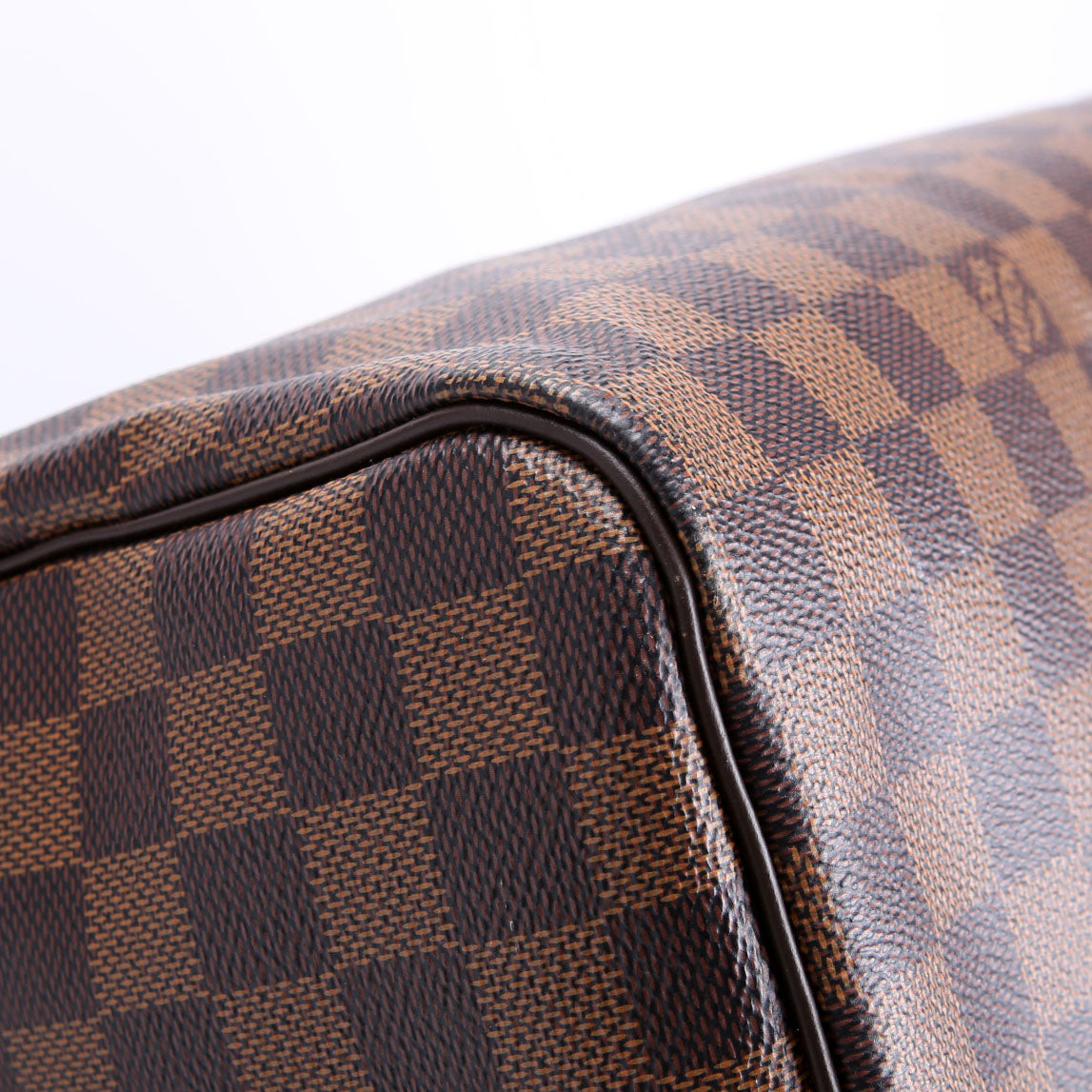 This pre-owned Louis Vuitton Speedy 35 is guaranteed 100% authentic. The exterior is in the classic Louis Vuitton Damier Ebene Coated Canvas.