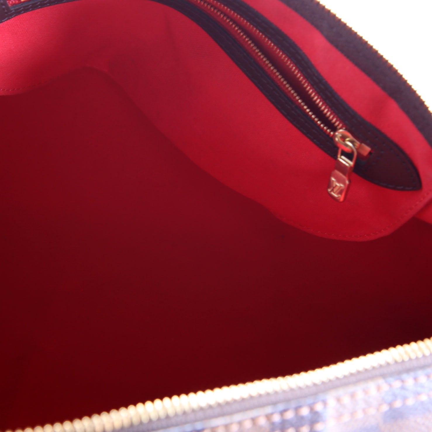 Interior: The interior shows light wear and minimal stains. It features one zip closure pocket.