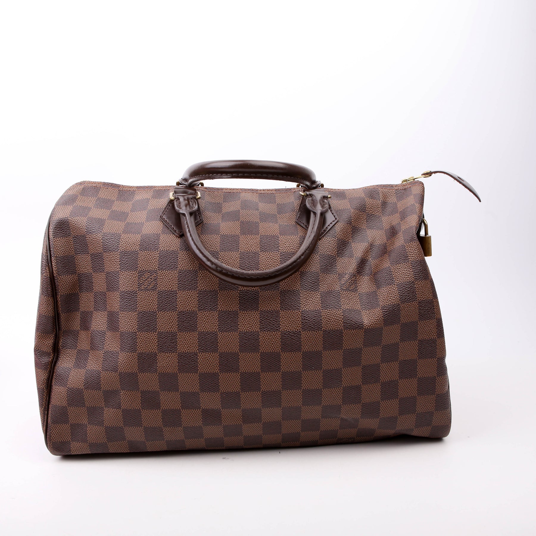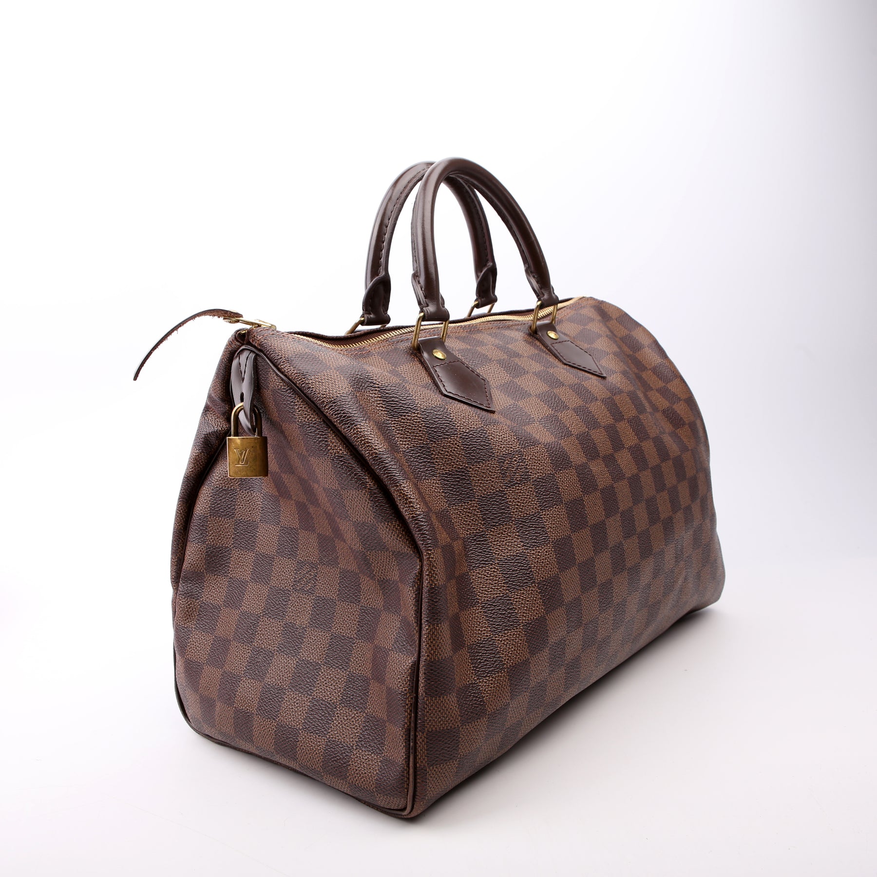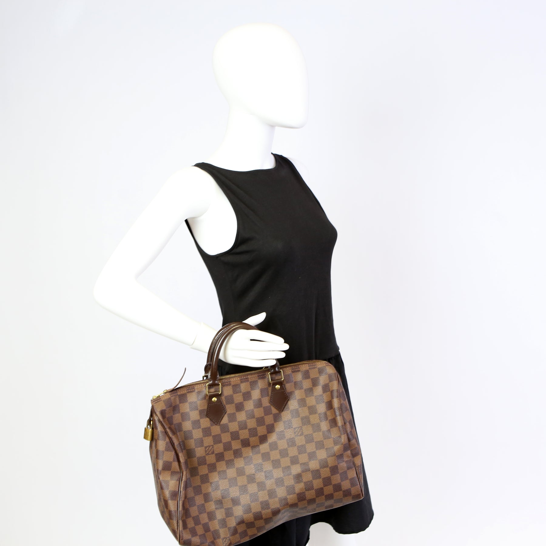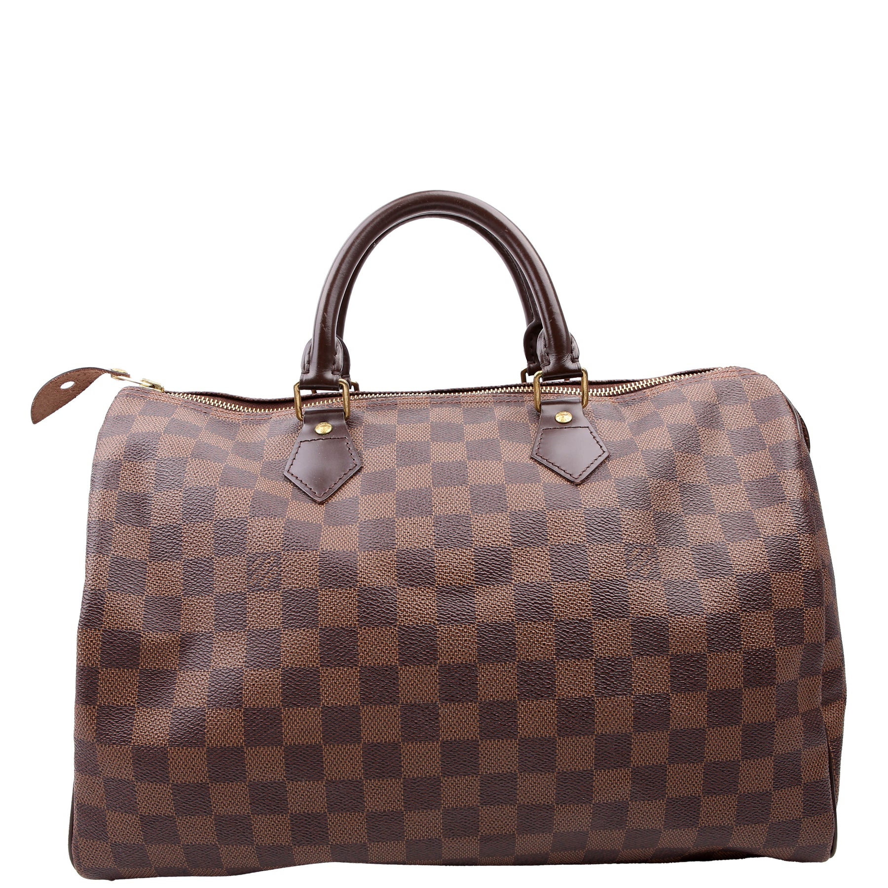 This pre-owned Louis Vuitton Speedy 35 is guaranteed 100% authentic. The exterior is in the classic Louis Vuitton Damier Ebene coated canvas.