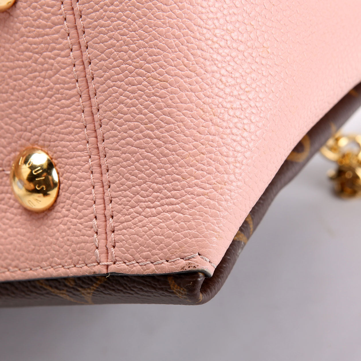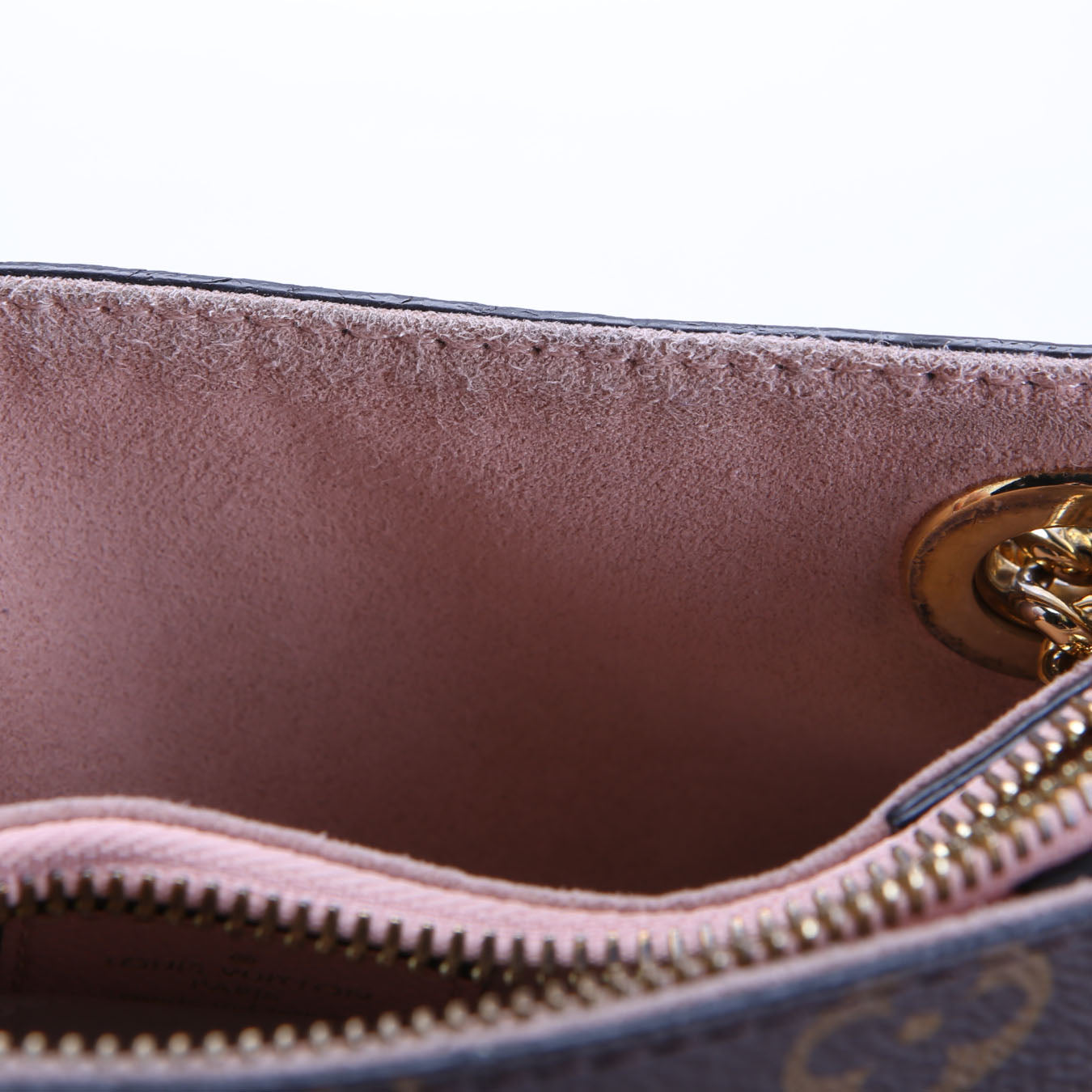 Hardware: The zipper operates properly. The hardware shows scratches and discoloration throughout.
