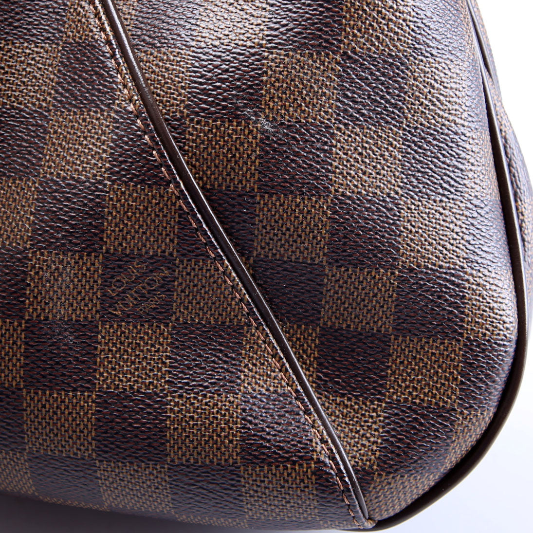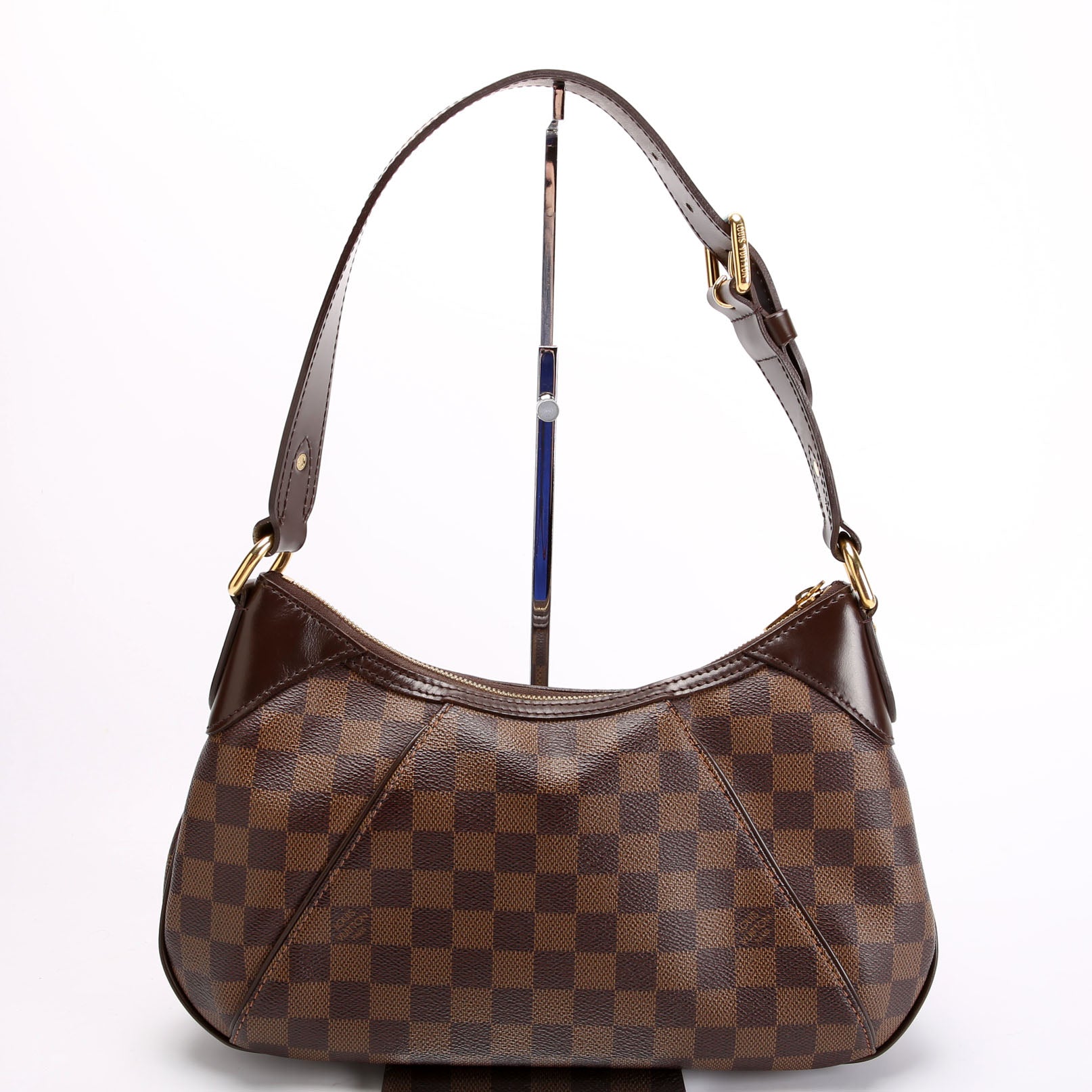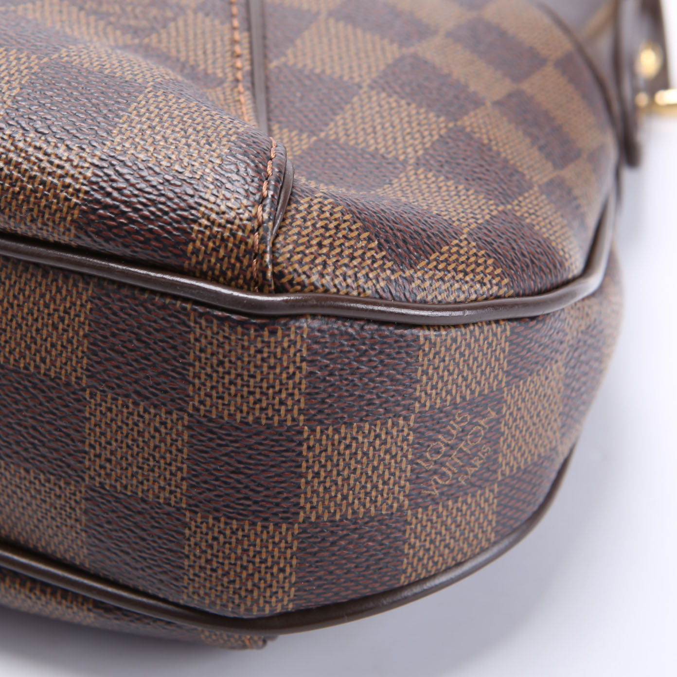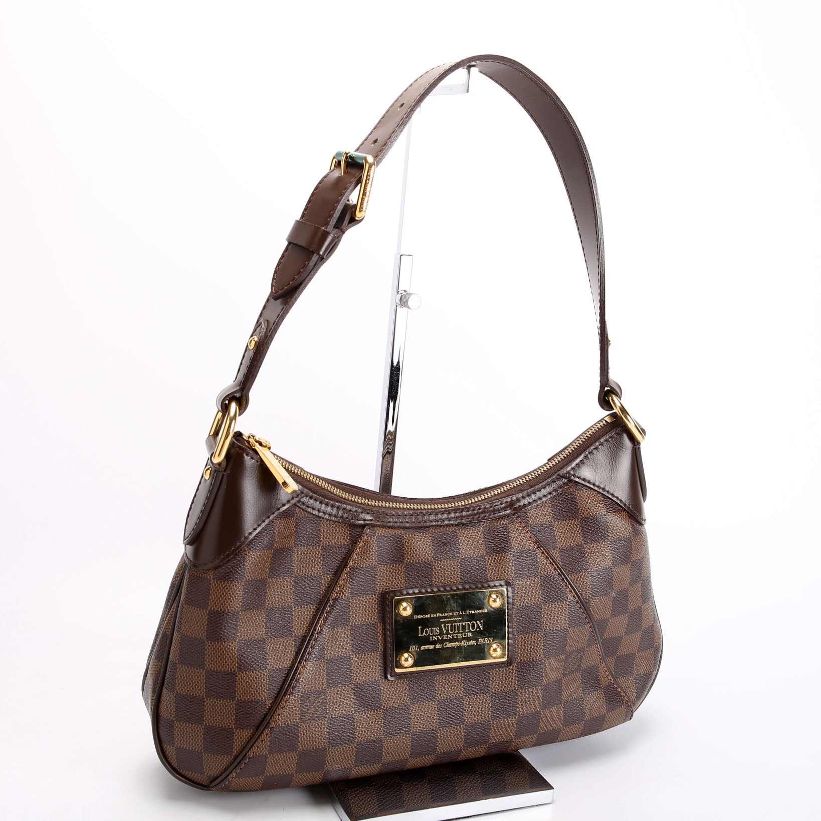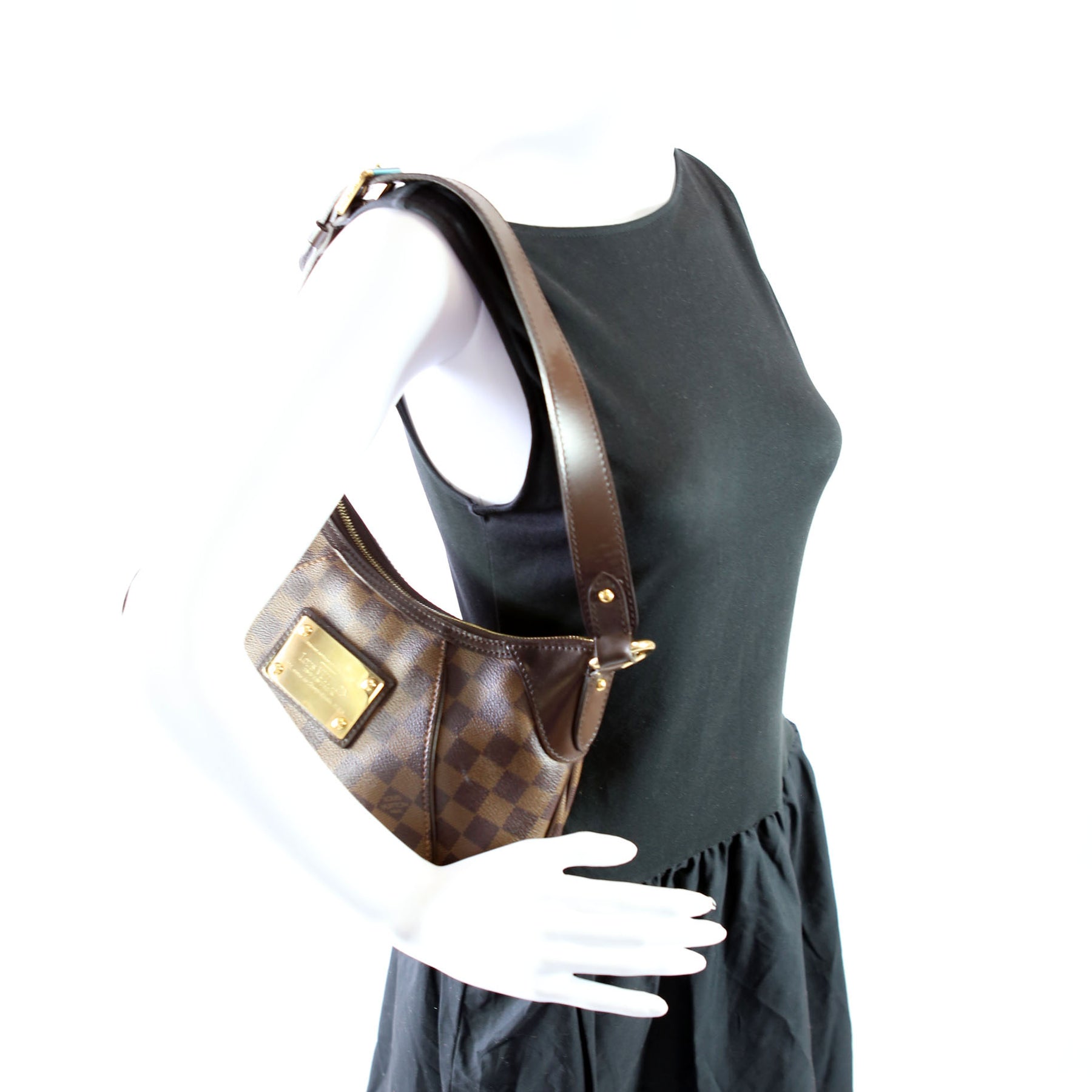 This pre-owned Louis Vuitton Thames PM is guaranteed 100% authentic. The exterior is in the classic Louis Vuitton Damier Ebene coated canvas.