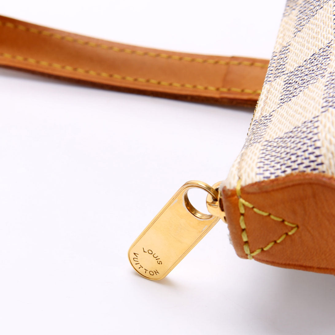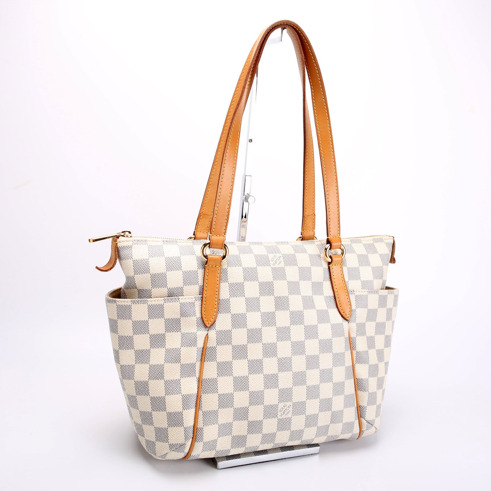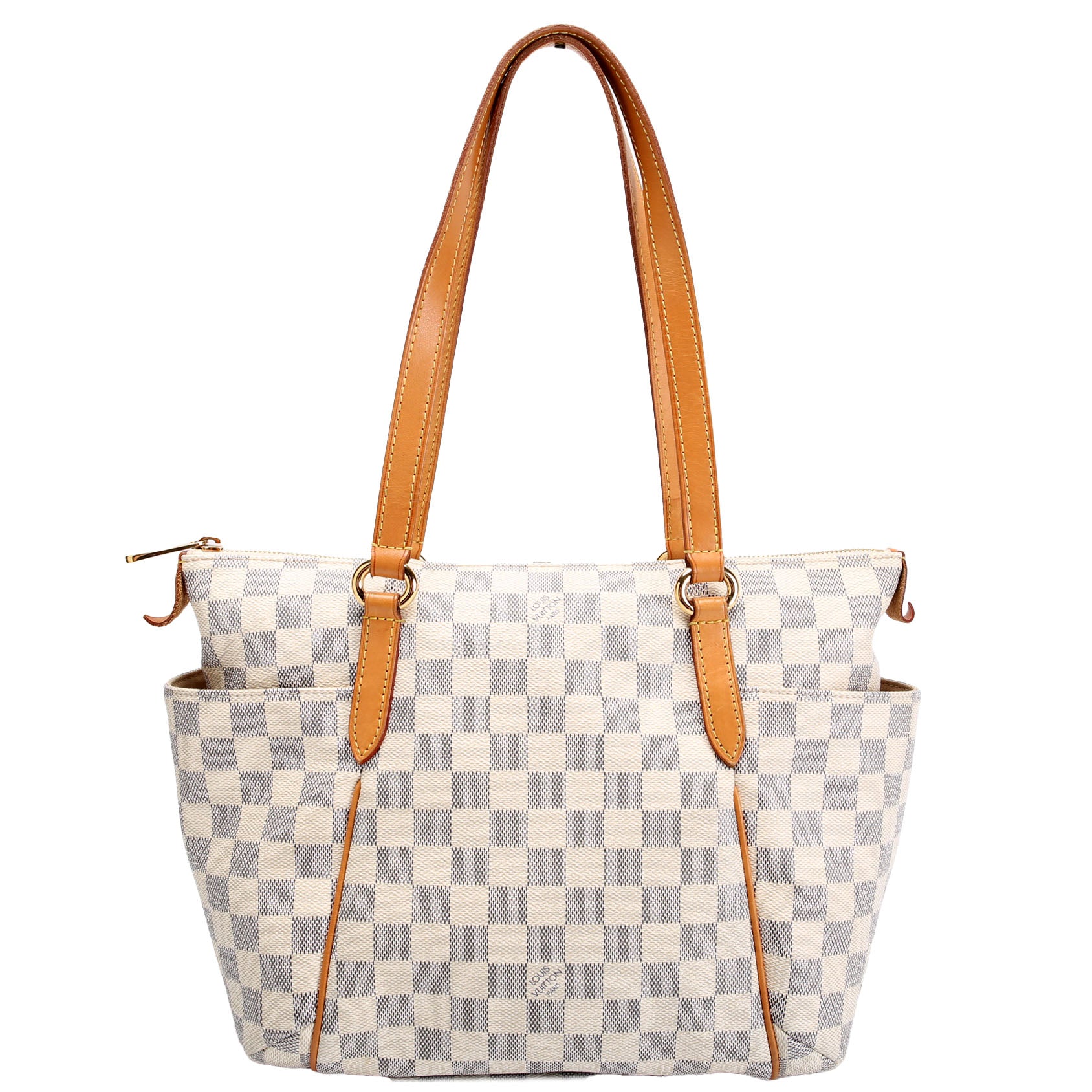 This pre-owned Louis Vuitton Totally PM is guaranteed 100% authentic. The exterior is in the classic Louis Vuitton Damier Azur coated canvas.