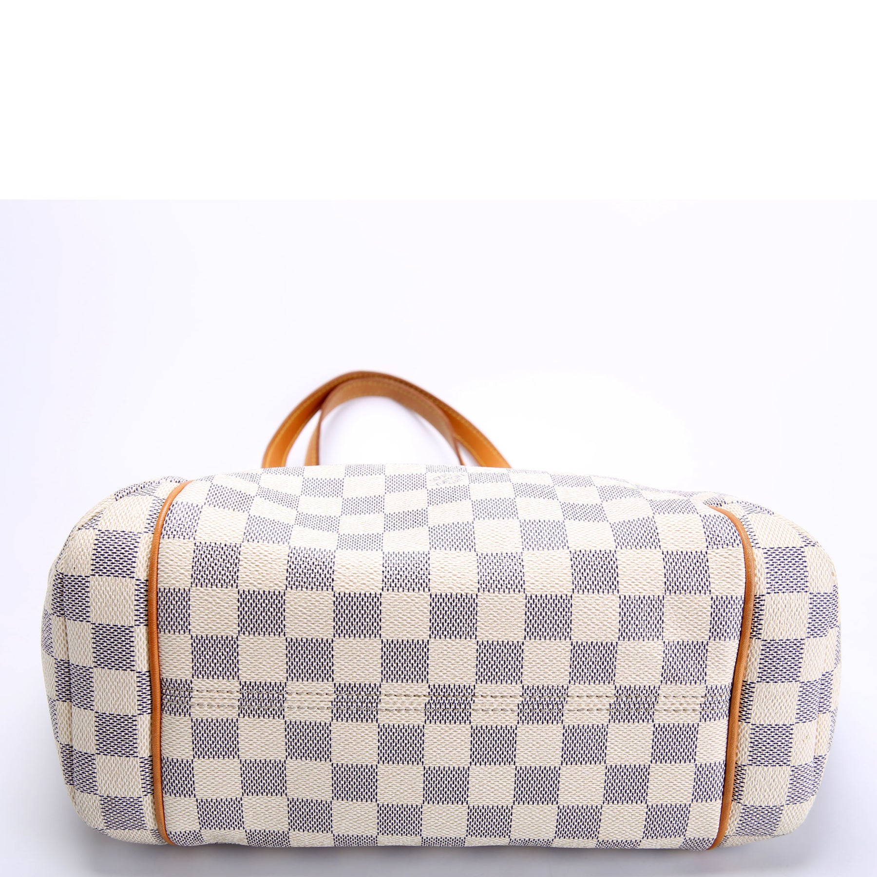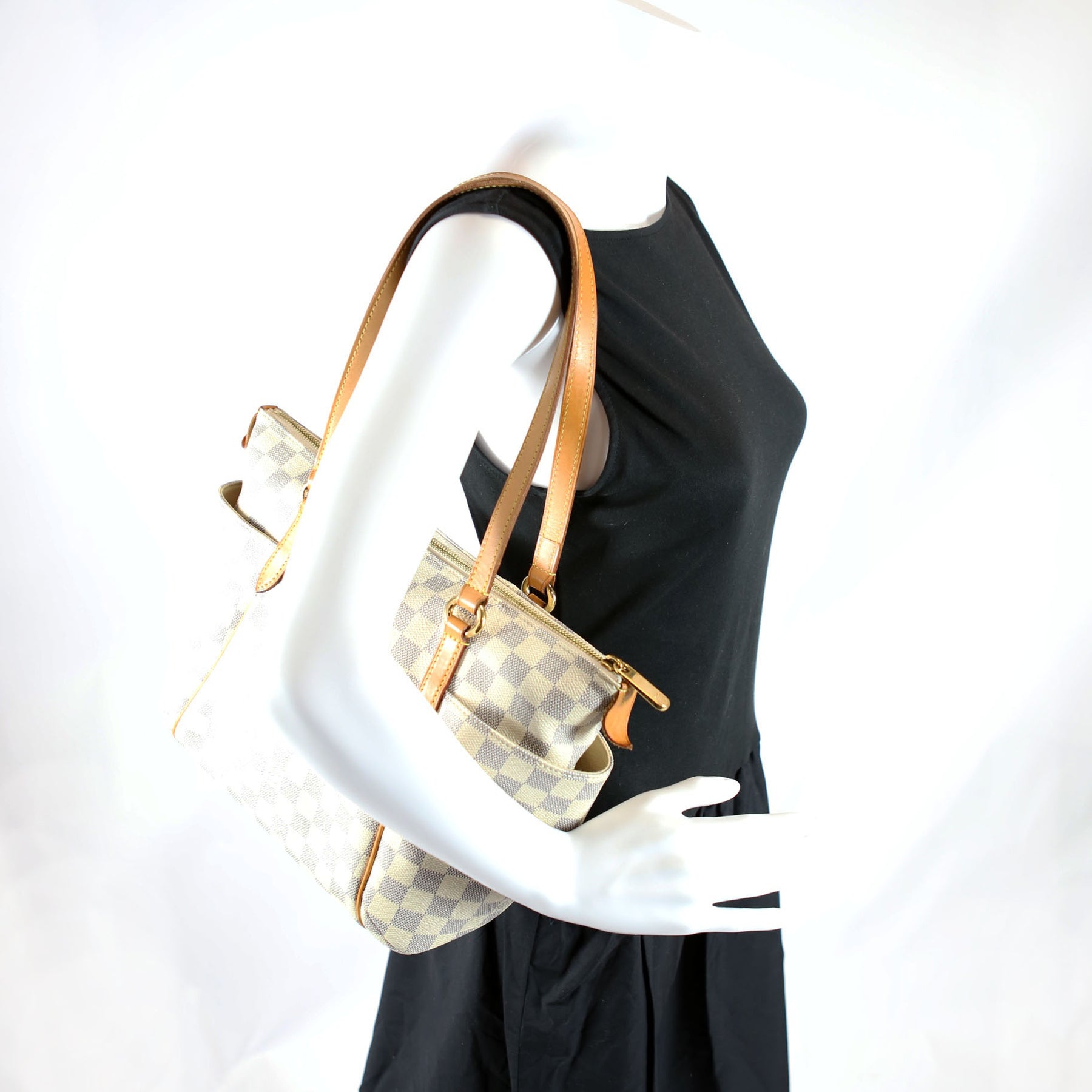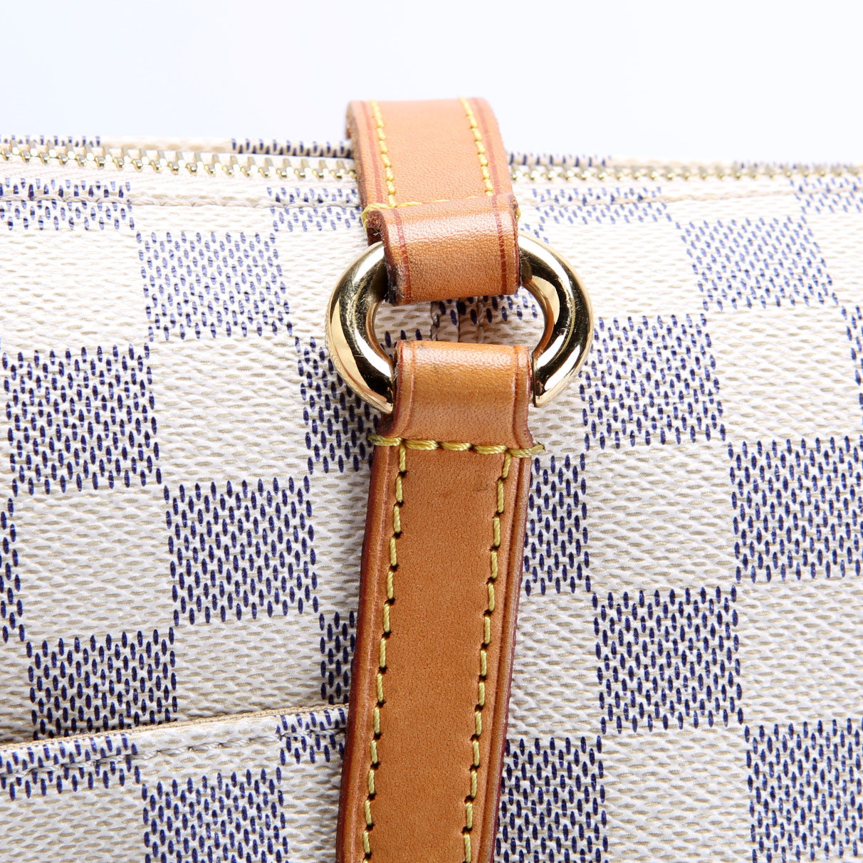 This pre-owned Louis Vuitton Totally PM is guaranteed 100% authentic. The exterior is in the classic Louis Vuitton Damier Azur coated canvas.