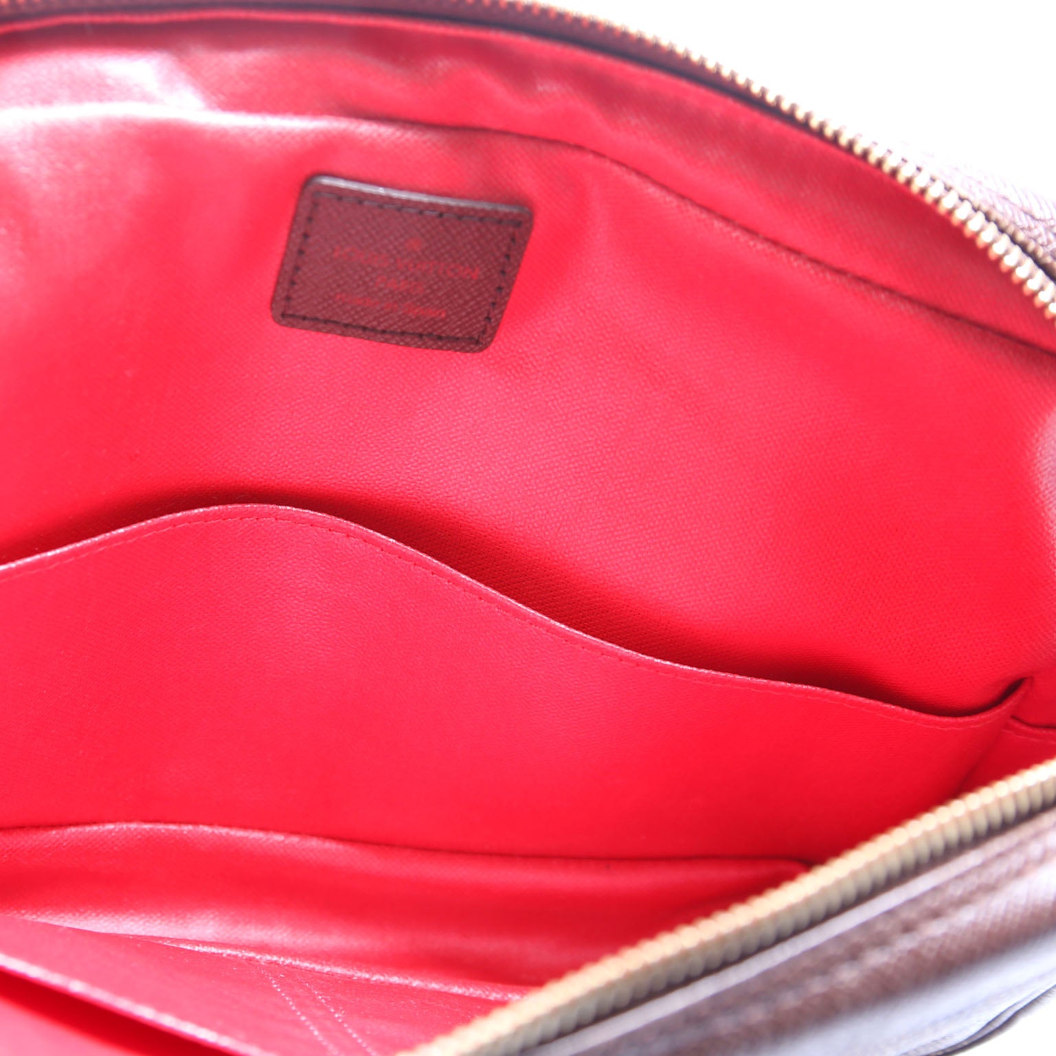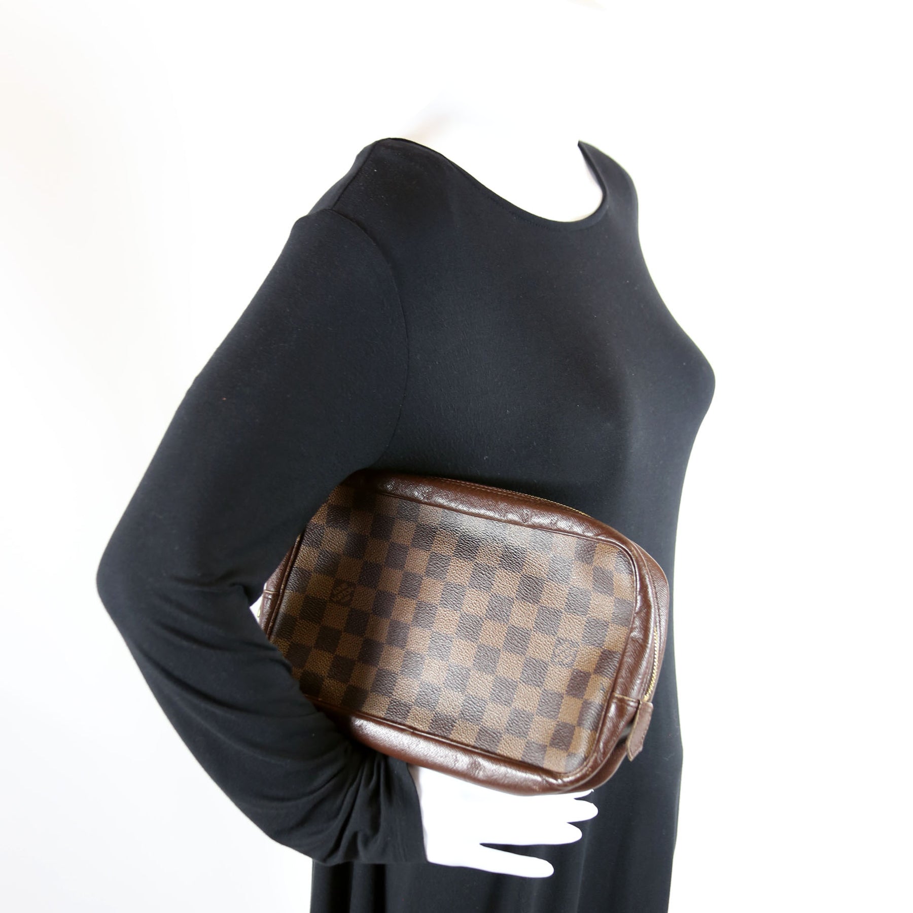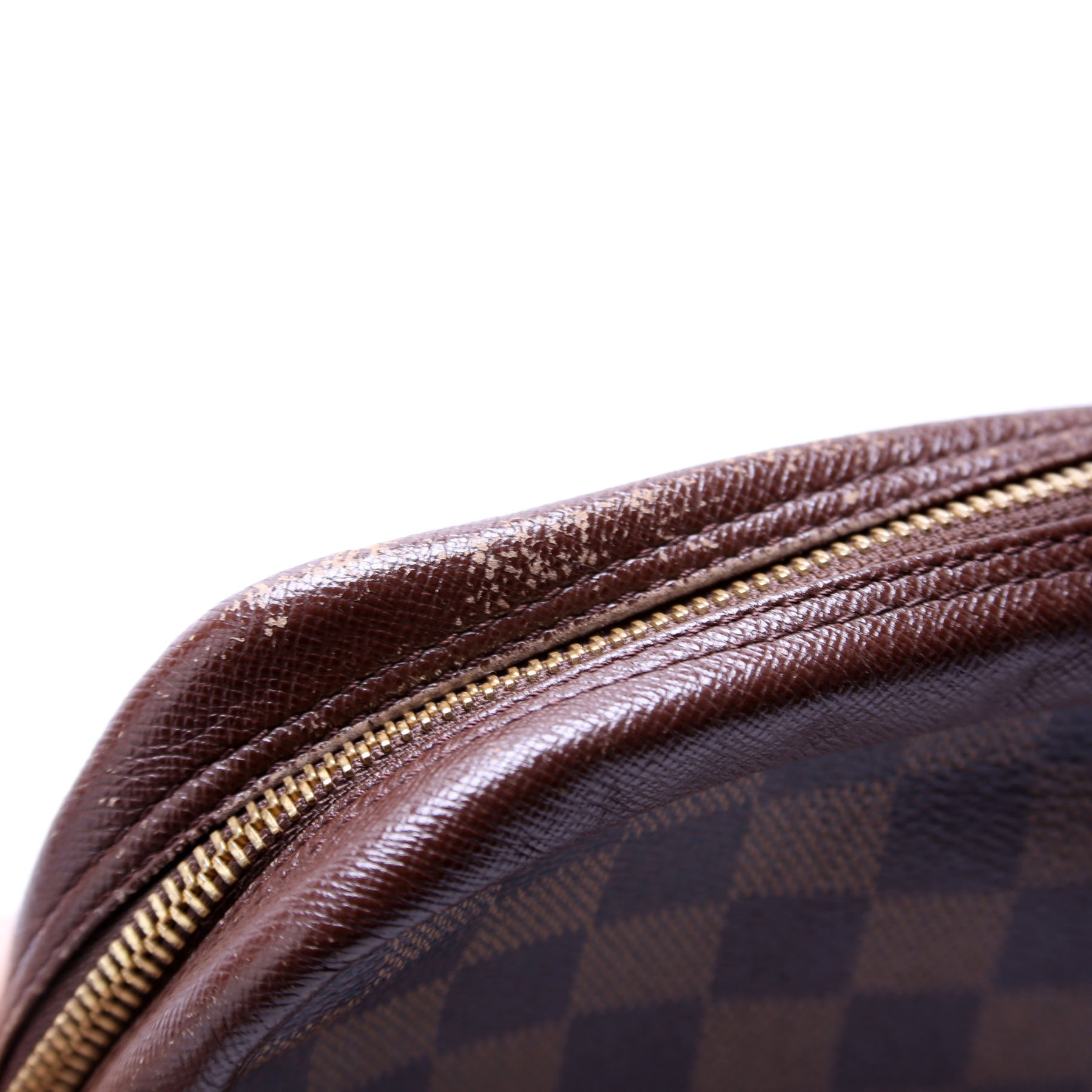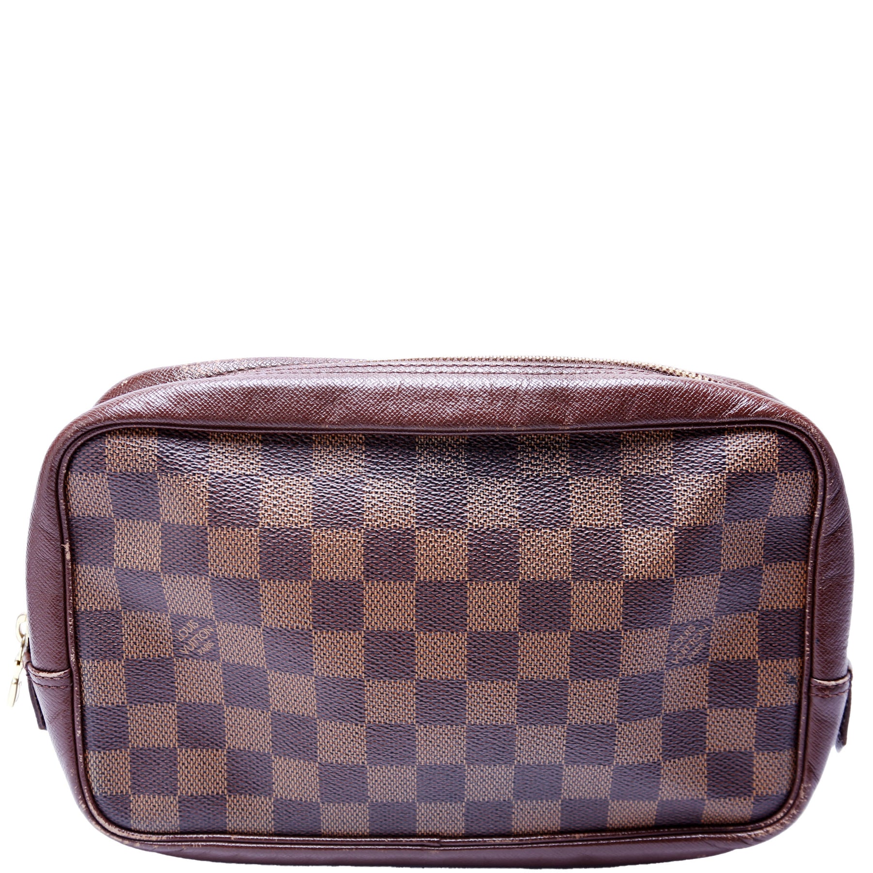 This pre-owned Louis Vuitton Trousse Toilette 25 is guaranteed 100% authentic. The exterior is in the classic Louis Vuitton Damier Ebene coated canvas.