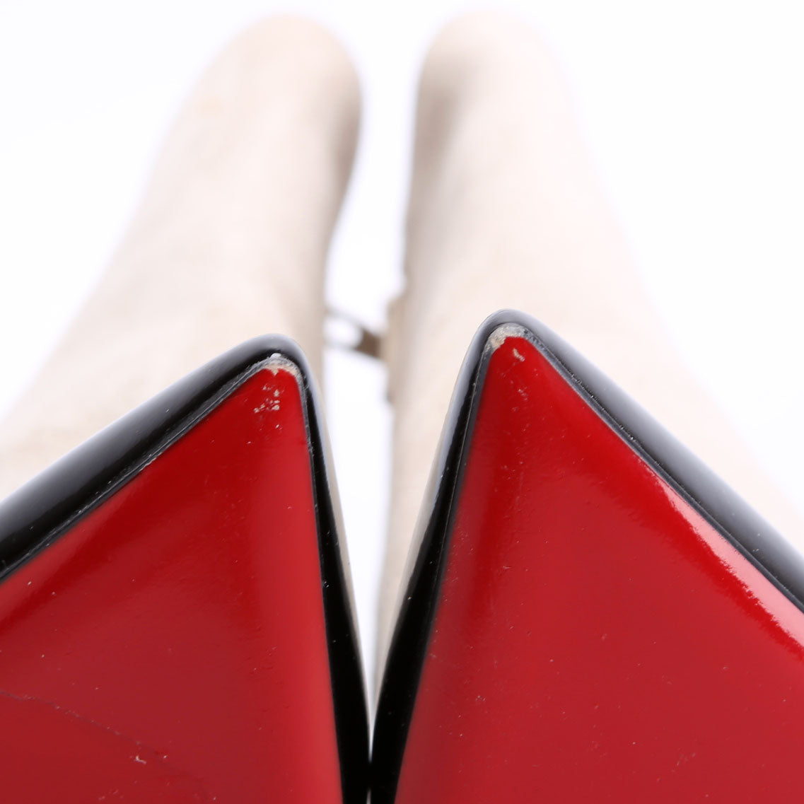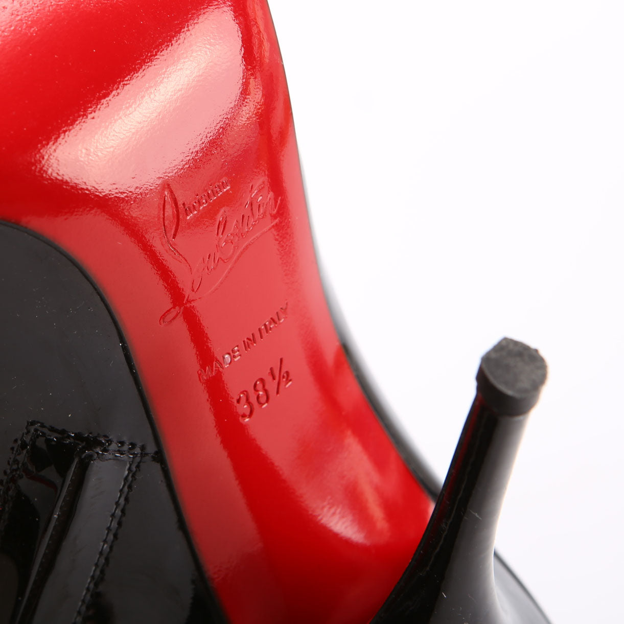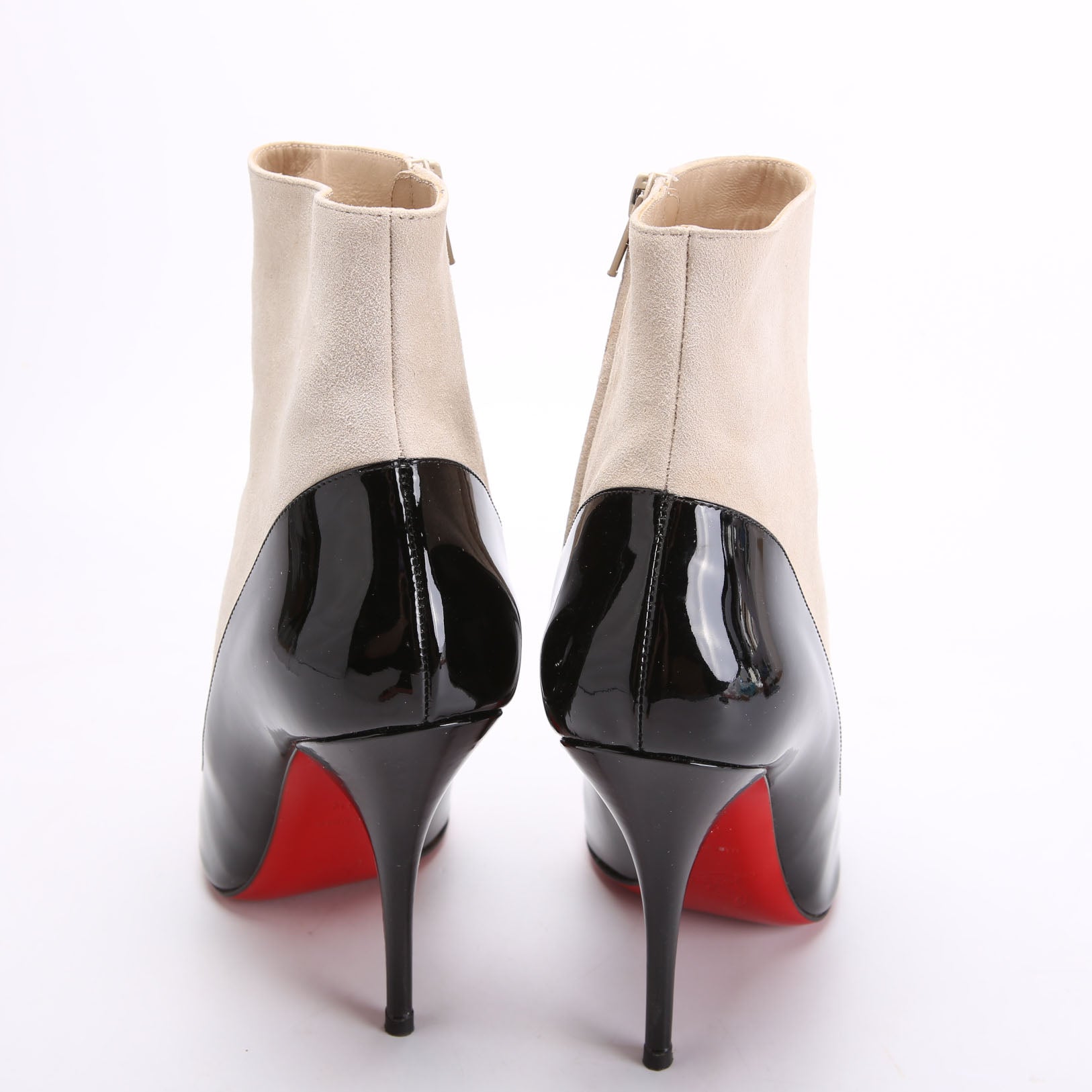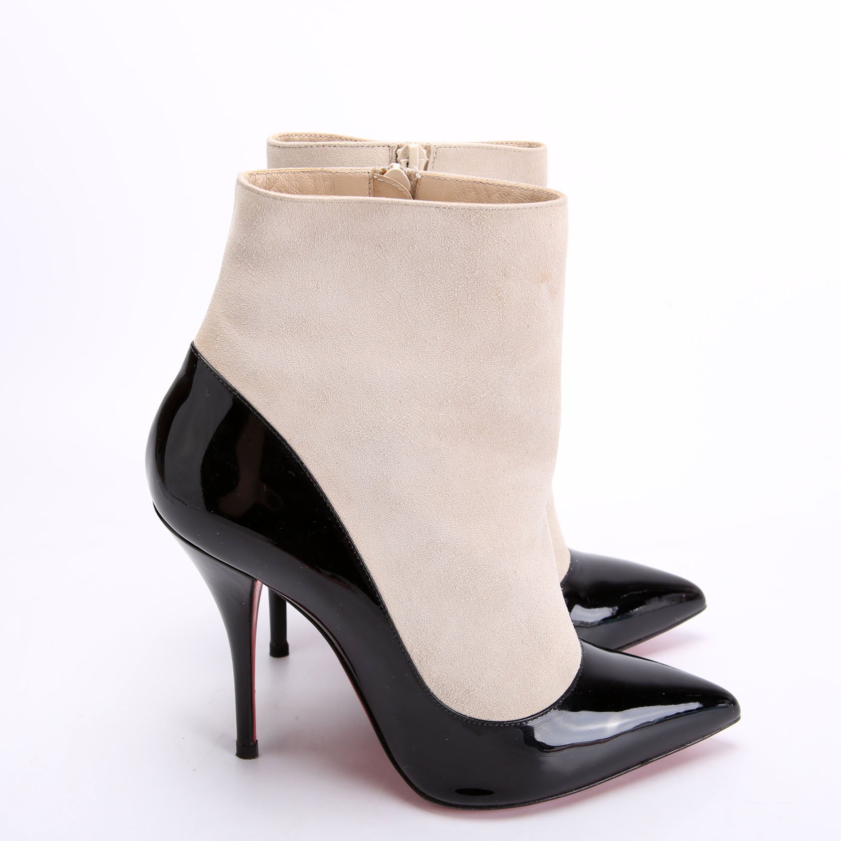 These pre-owned Christian Louboutin Tucsy Mum 100MM Patent/Suede Booties are guaranteed 100% authentic.