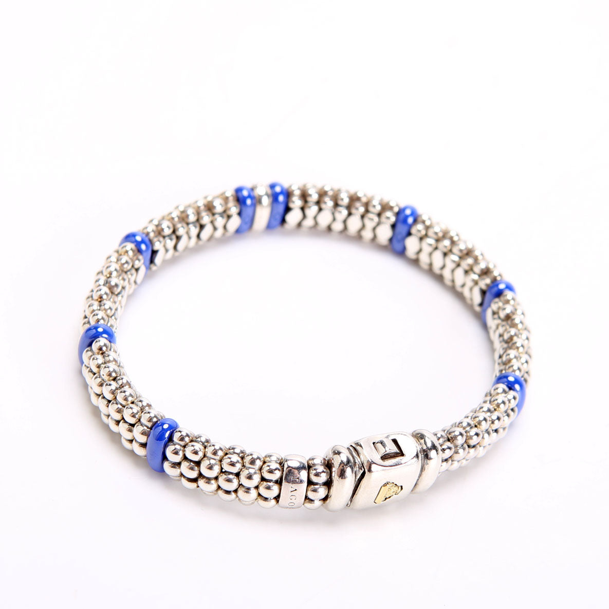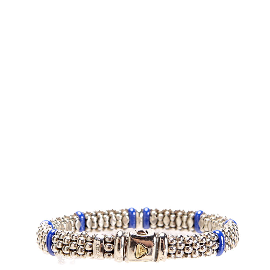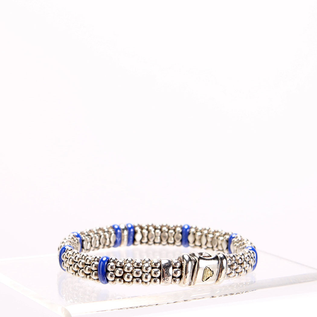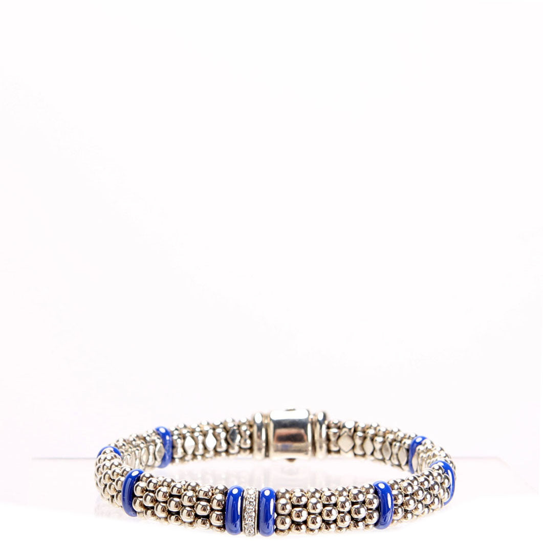 This pre-owned Lagos Ultramarine Single Station 9MM Bracelet 925/Diamond/Caviar is guaranteed 100% authentic.