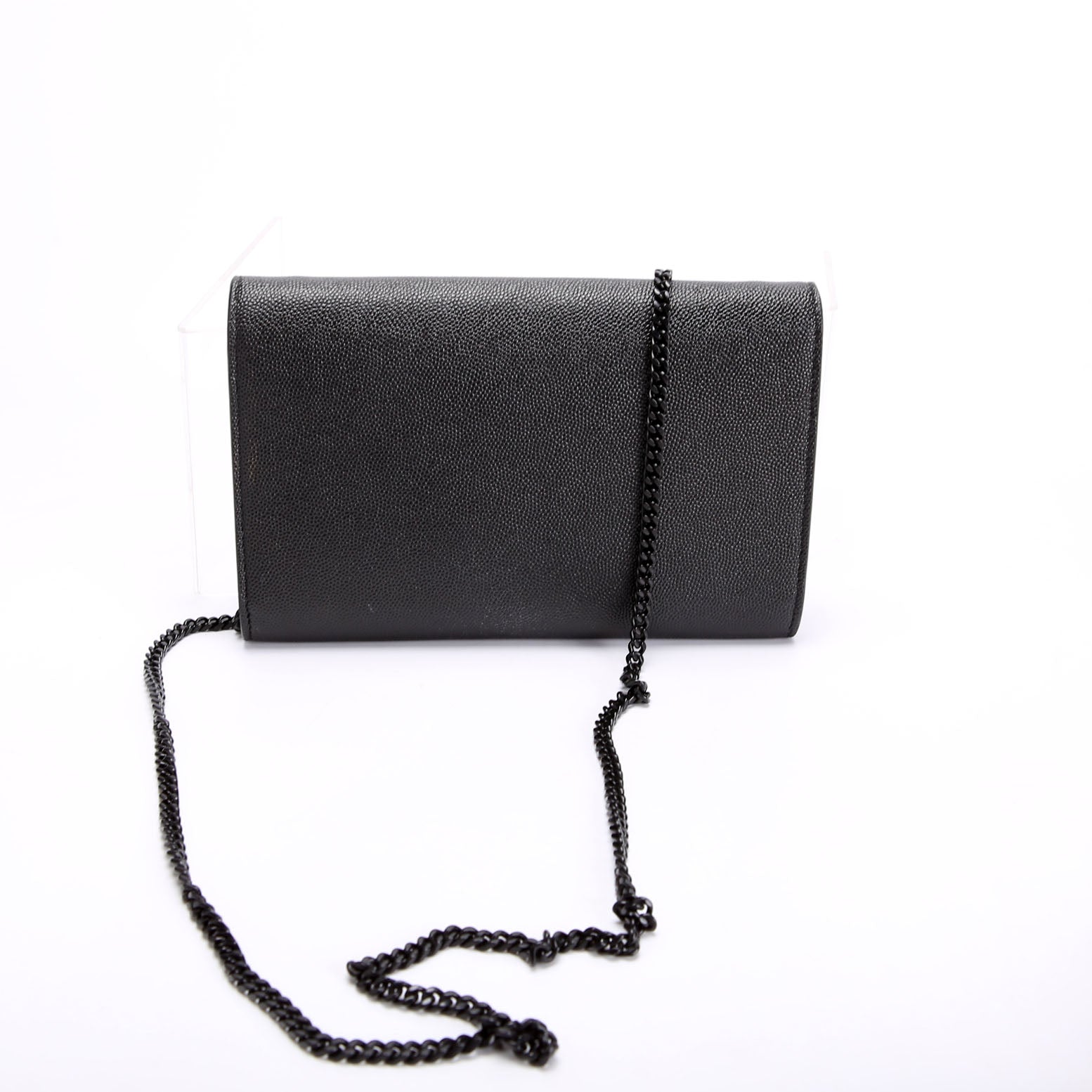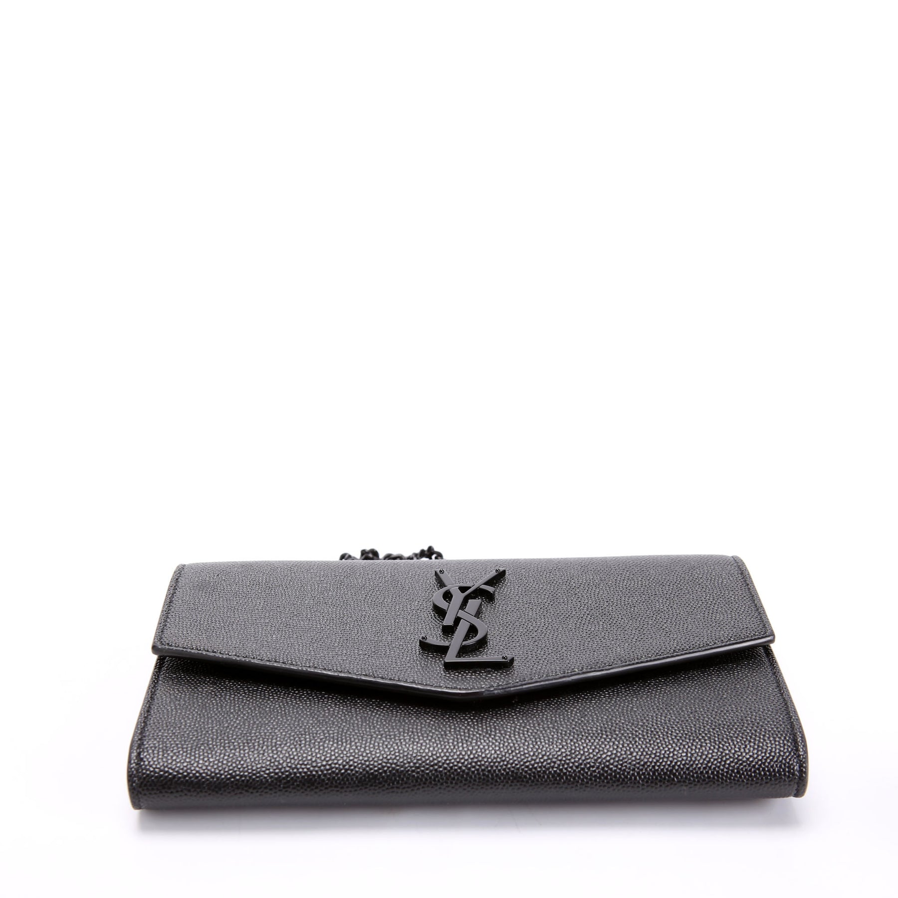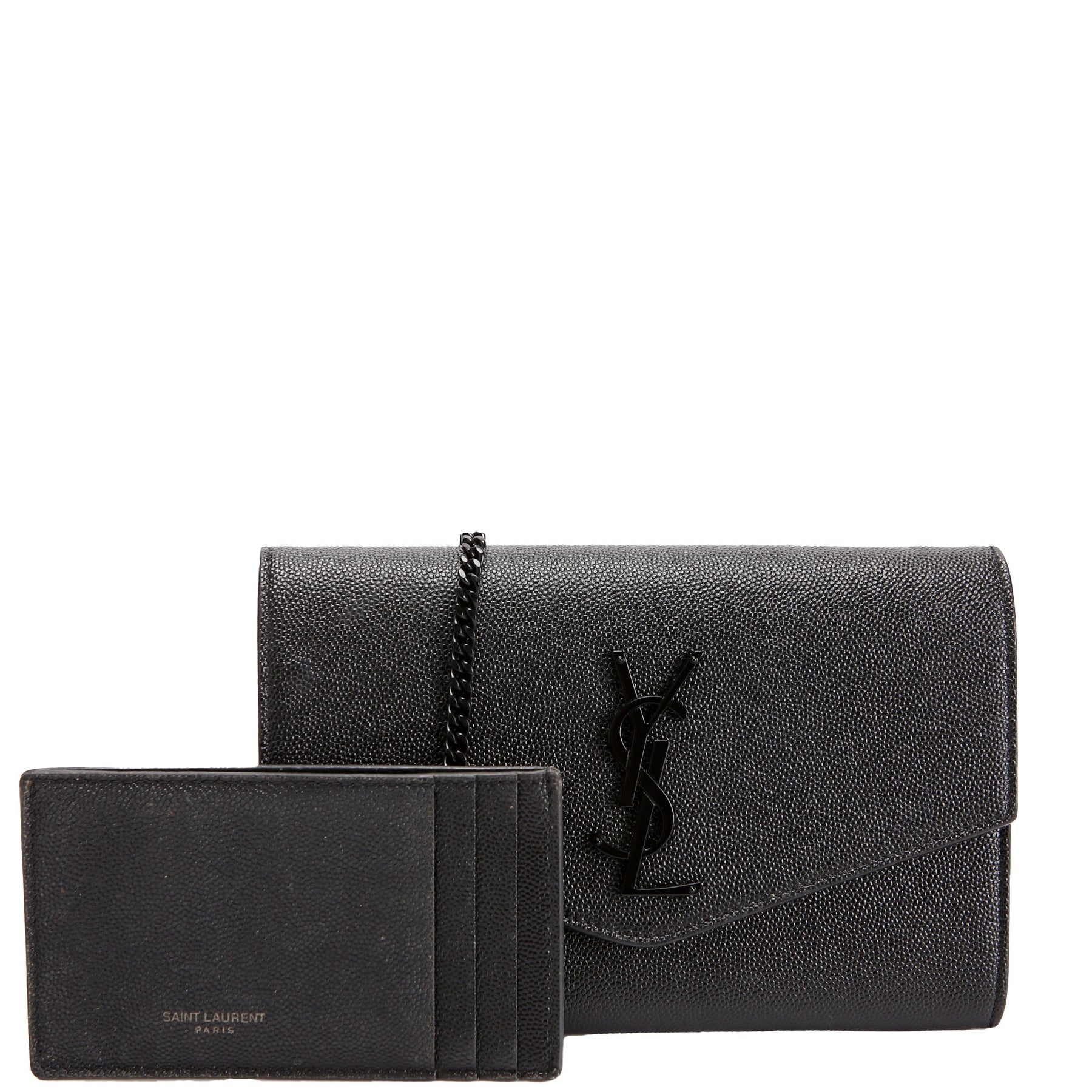 This pre-owned Saint Laurent Uptown Chain Wallet is guaranteed 100% authentic. The exterior is in the classic Grain De Poudre leather.